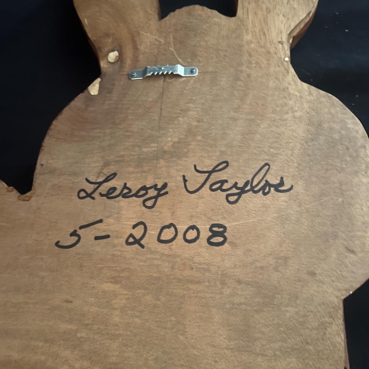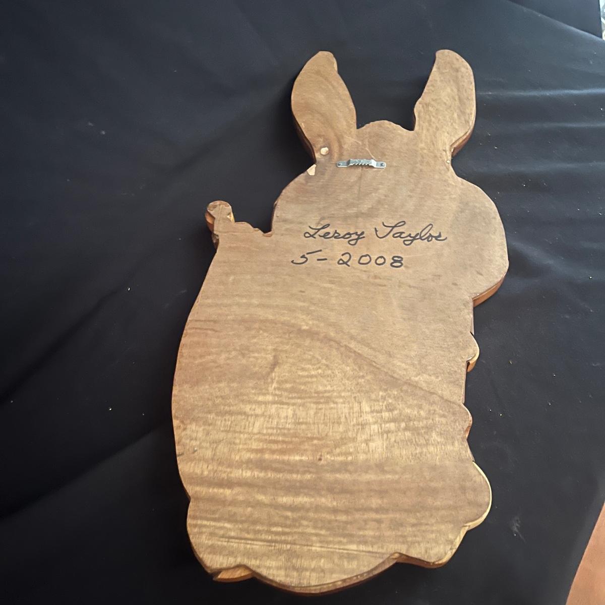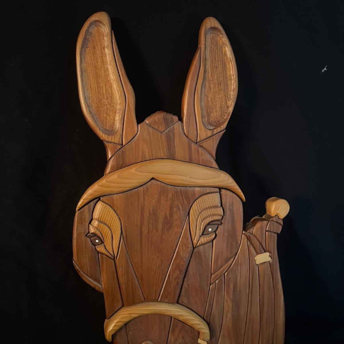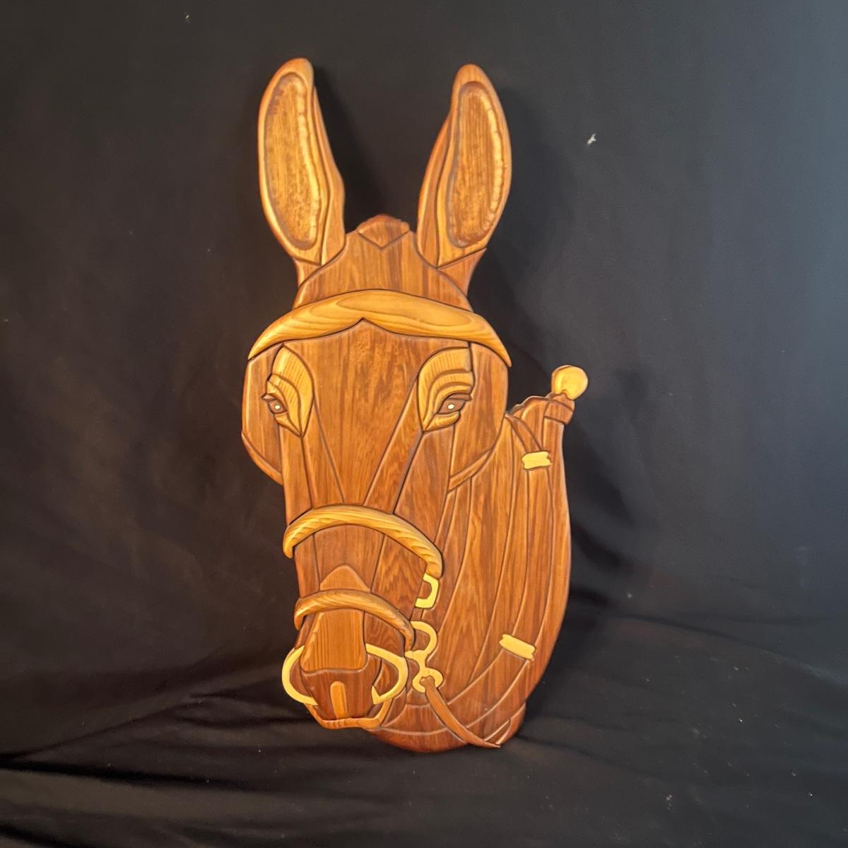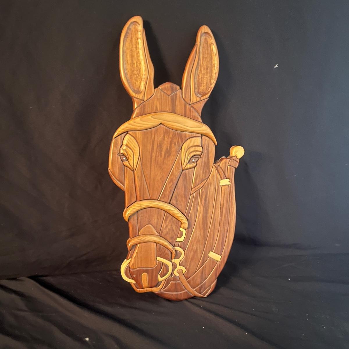 Lot includes a signed intarsia horse wall hanging. Piece measures 11” x .5” x 21”H.