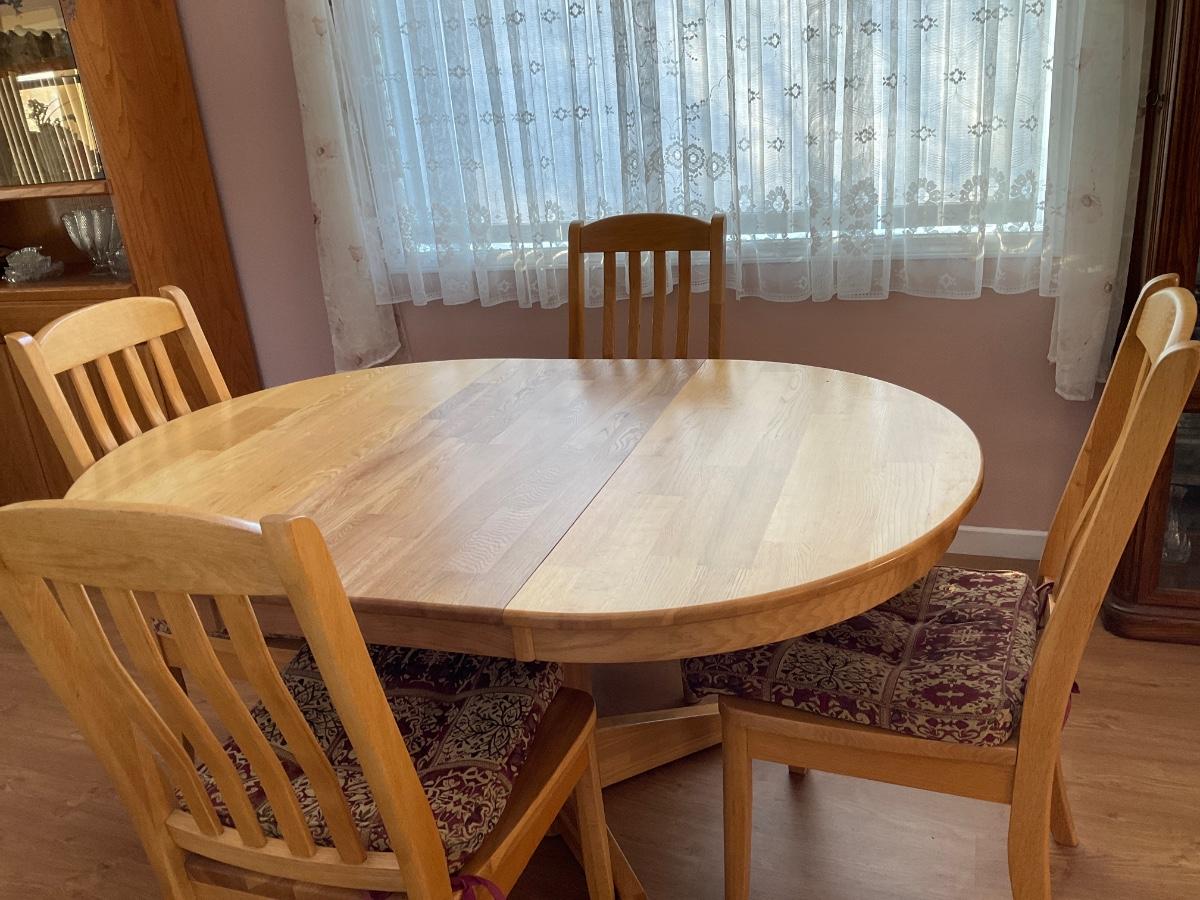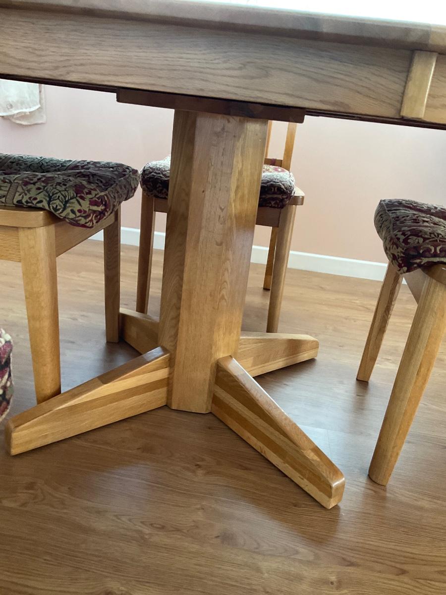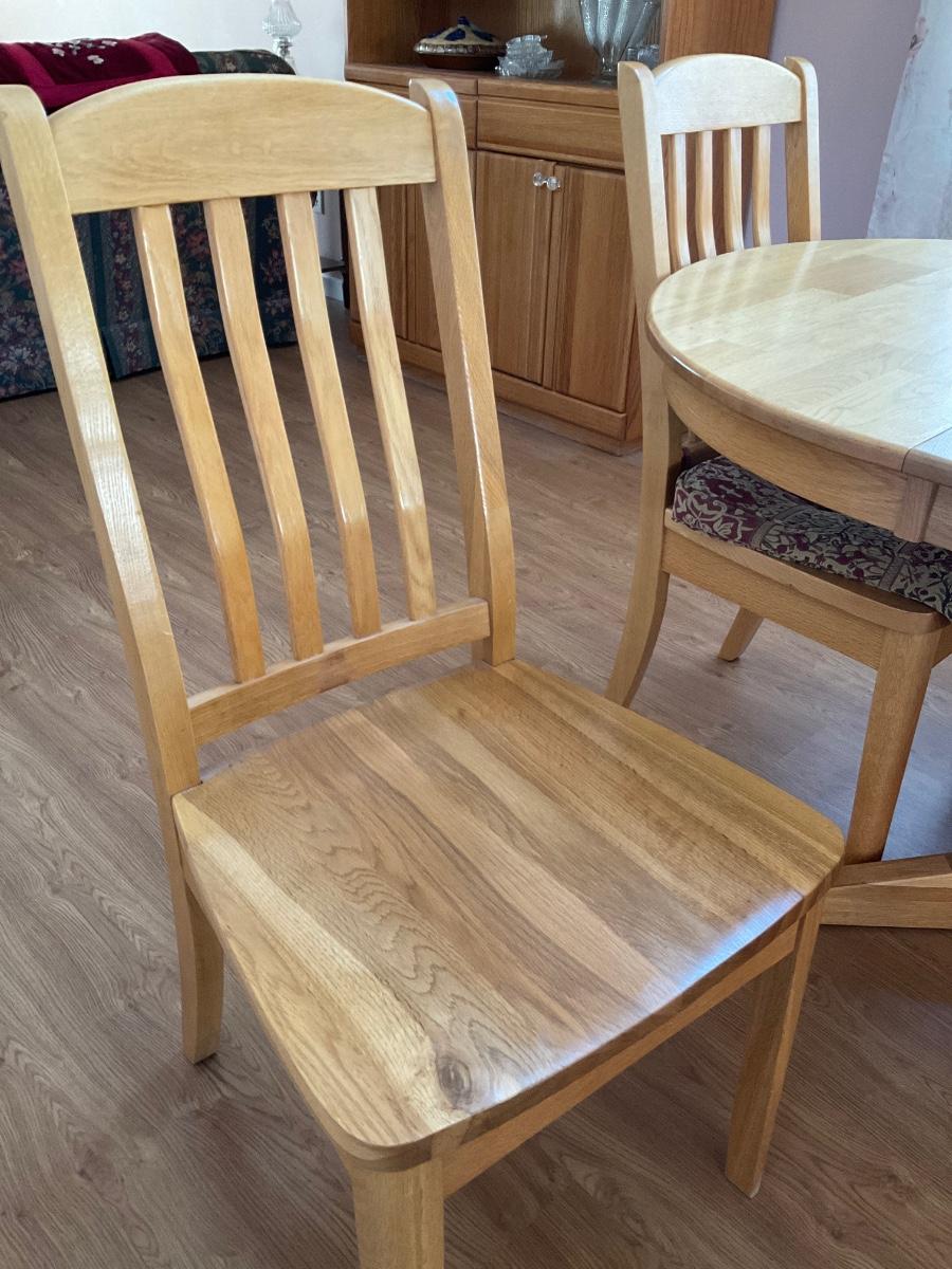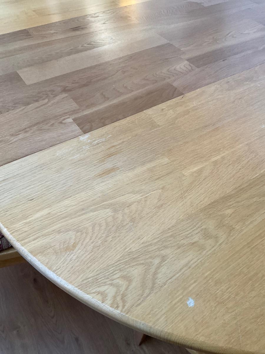 Very solid wood table and chairs. Does have a small discoloring on table.