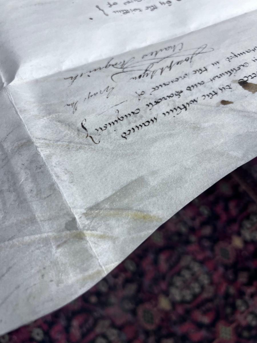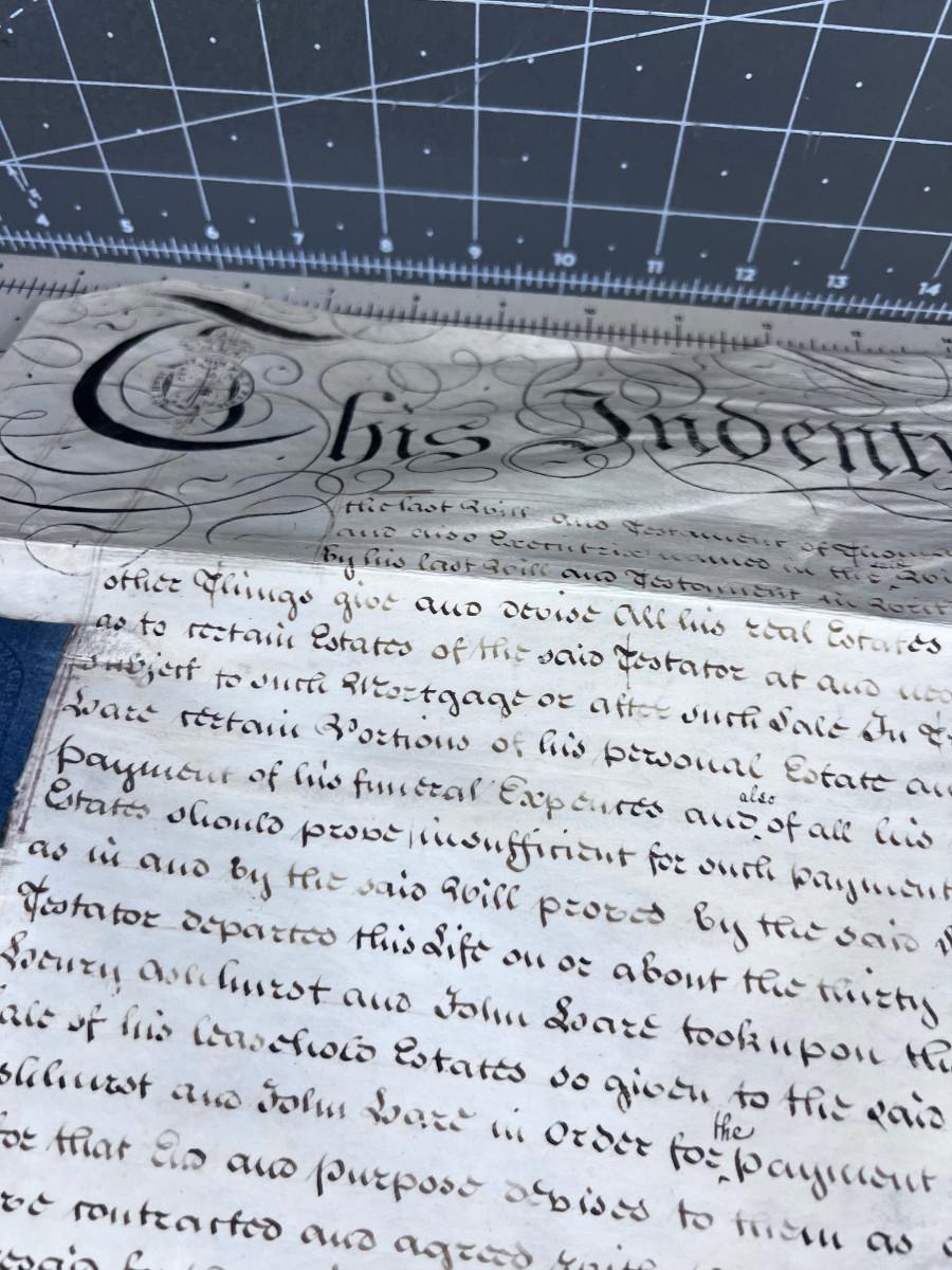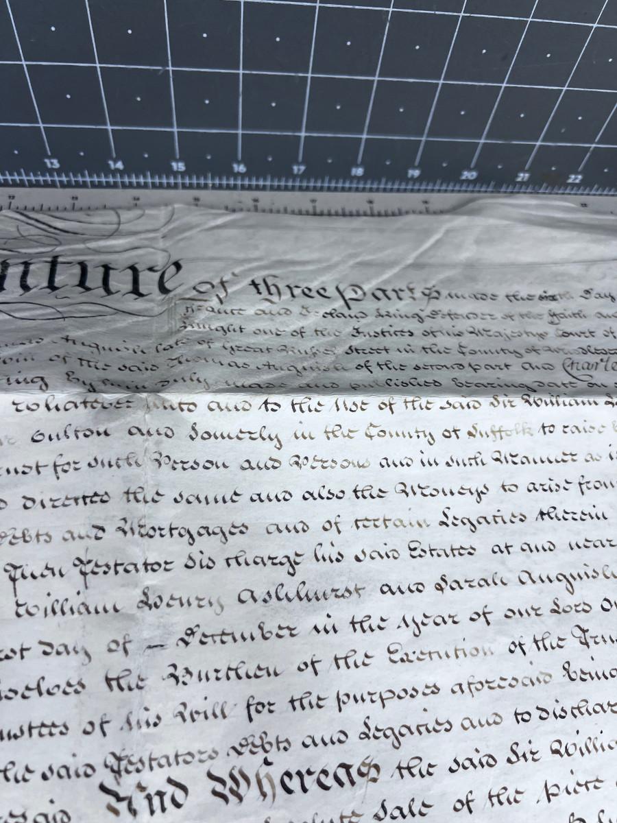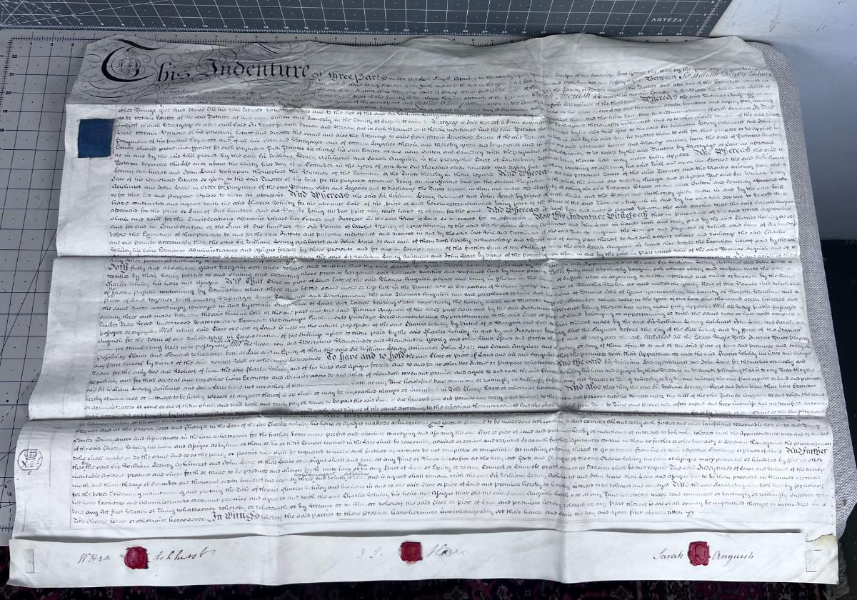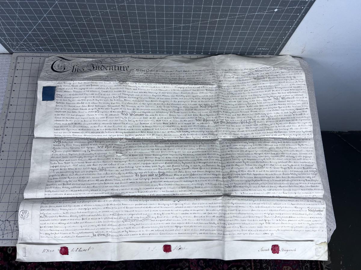 Letter of Indenture. Printed on Calf Skin Velum. Measures 34" X 26" Probably Sew in a book at one time. Has holes on the edge from binding and tape on the back.