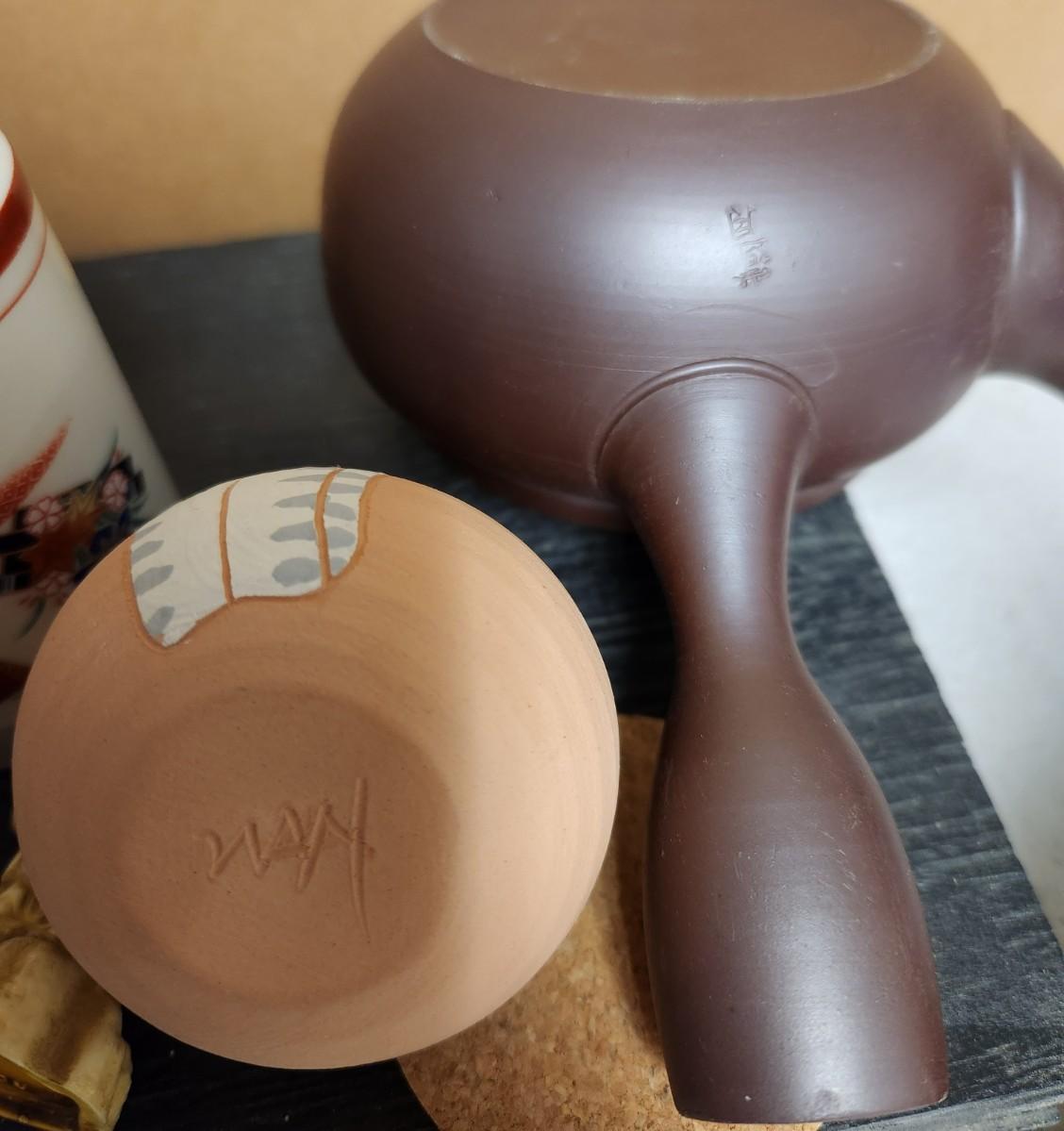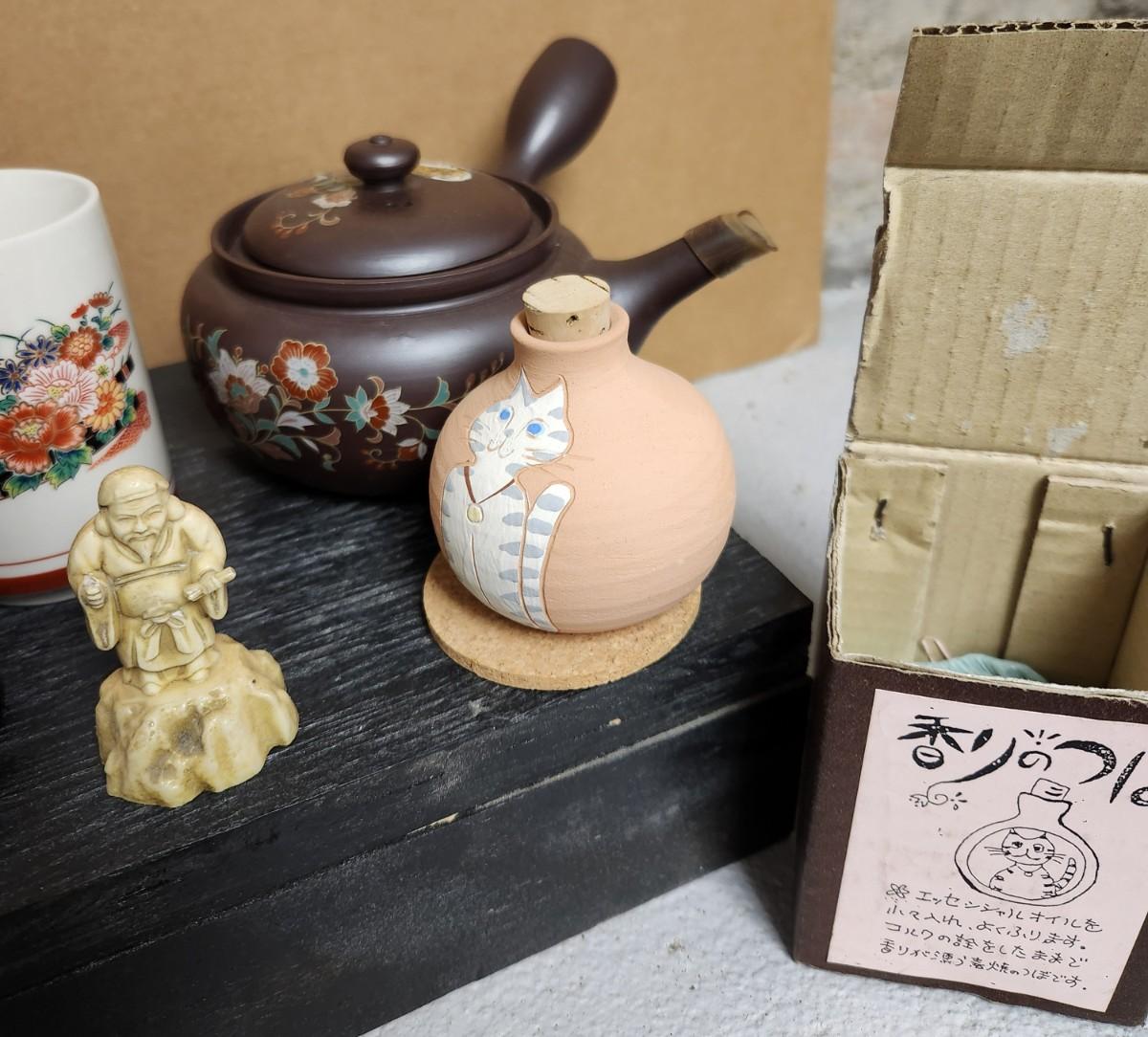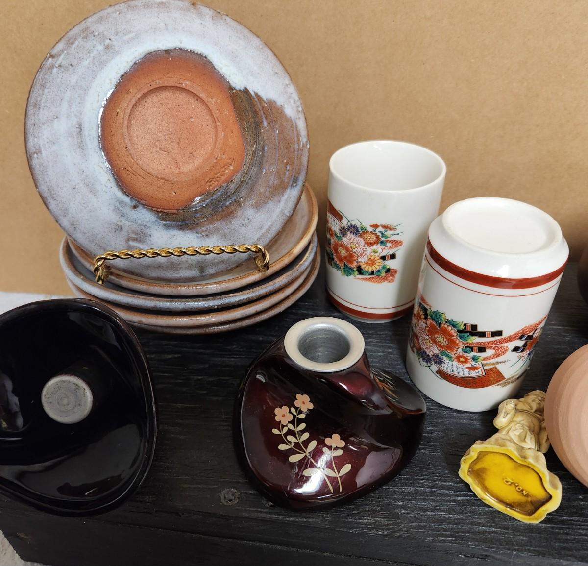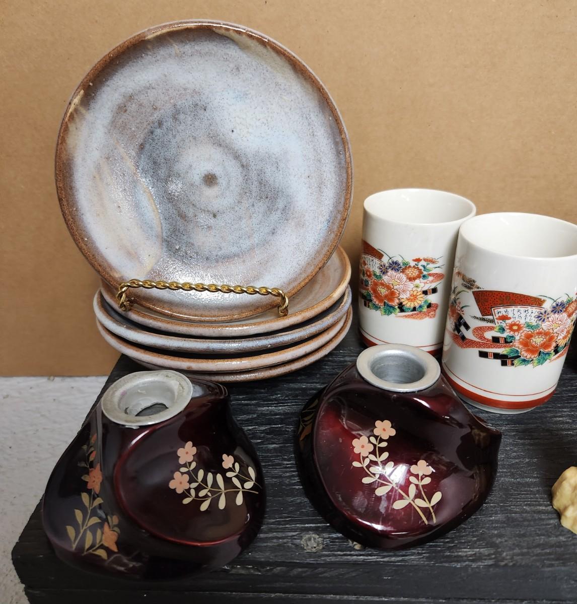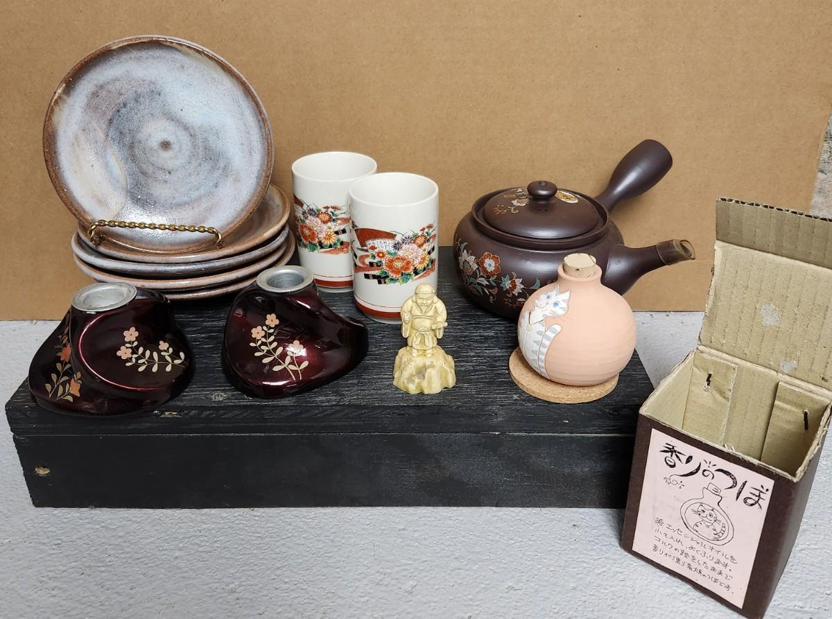 Set of 5 pottery plates (small like for sushi), vintage resin figure, teapot, 2 tea cups, pair of enamel candlesticks and a small terracotta pot with coaster and box.