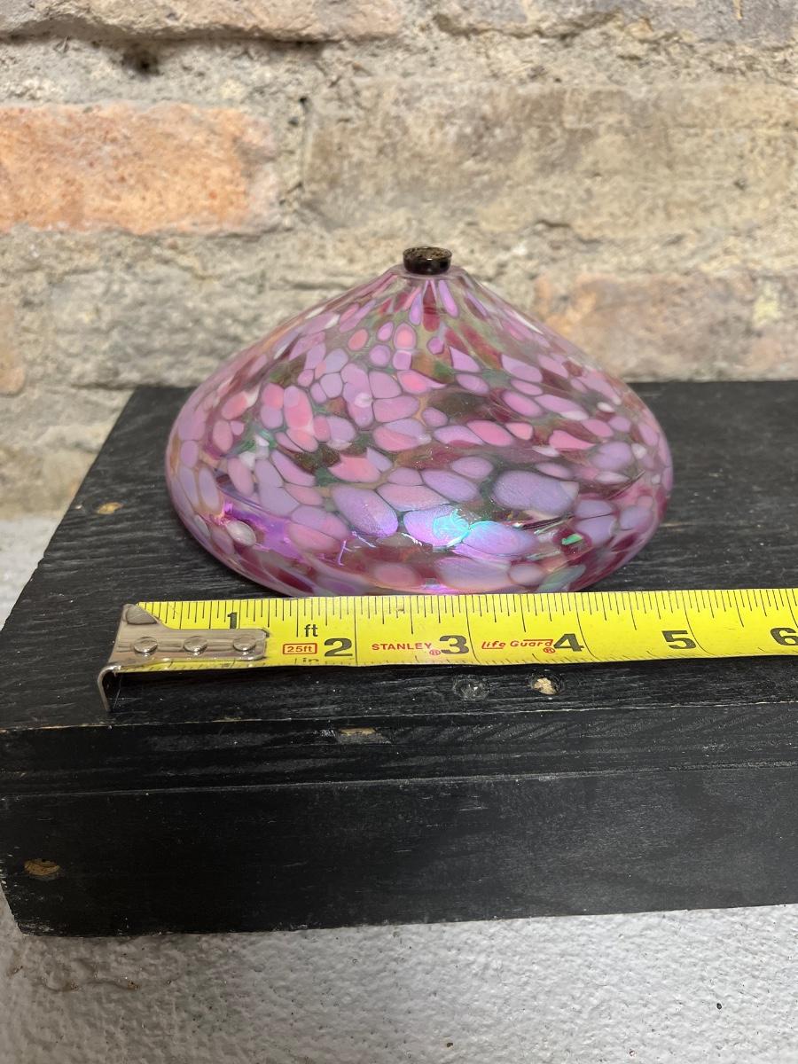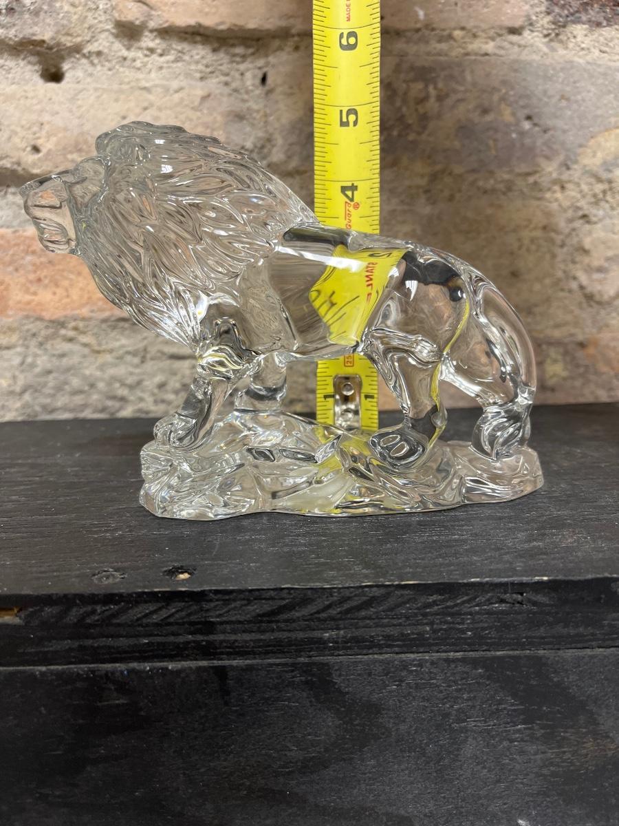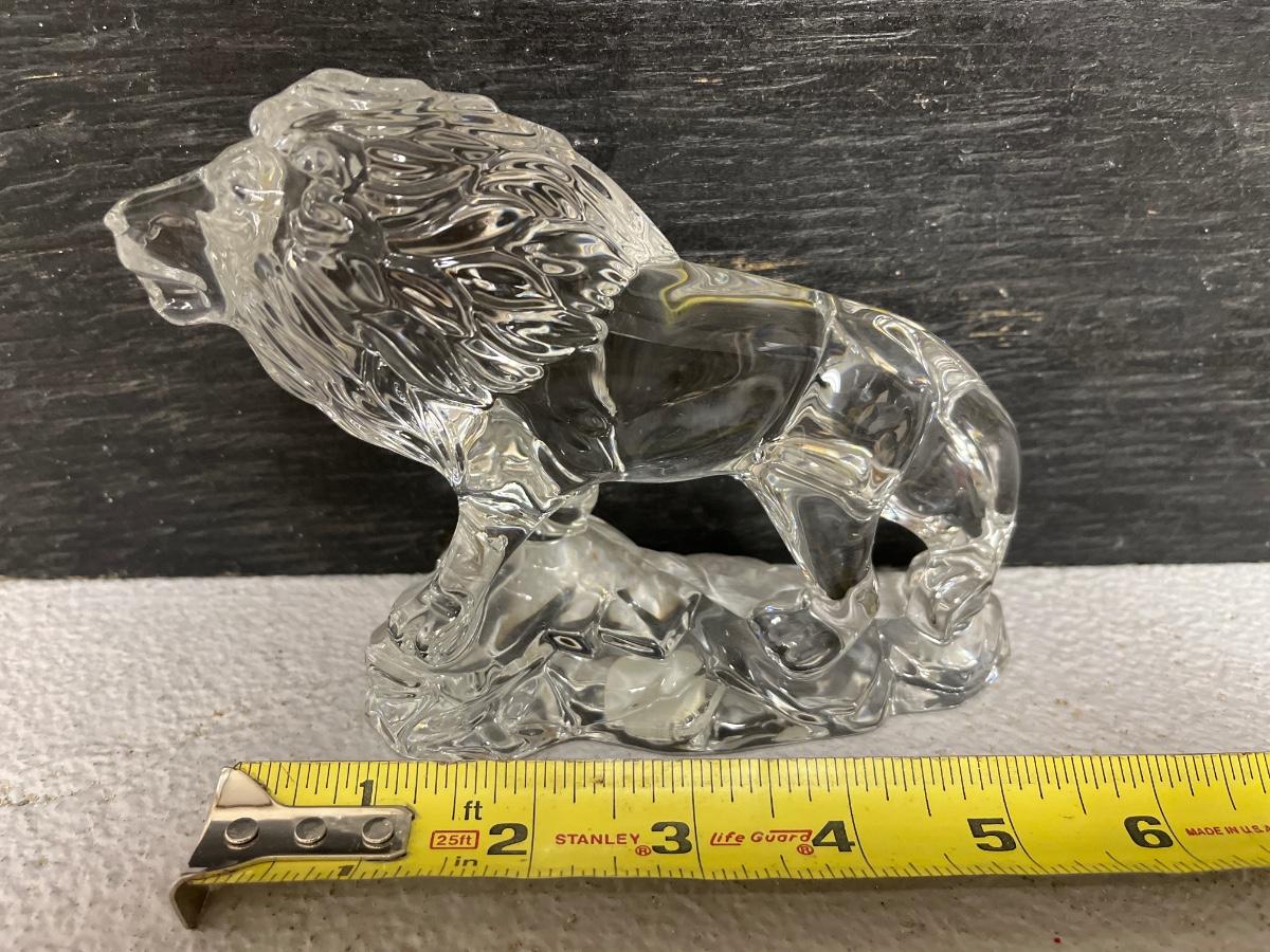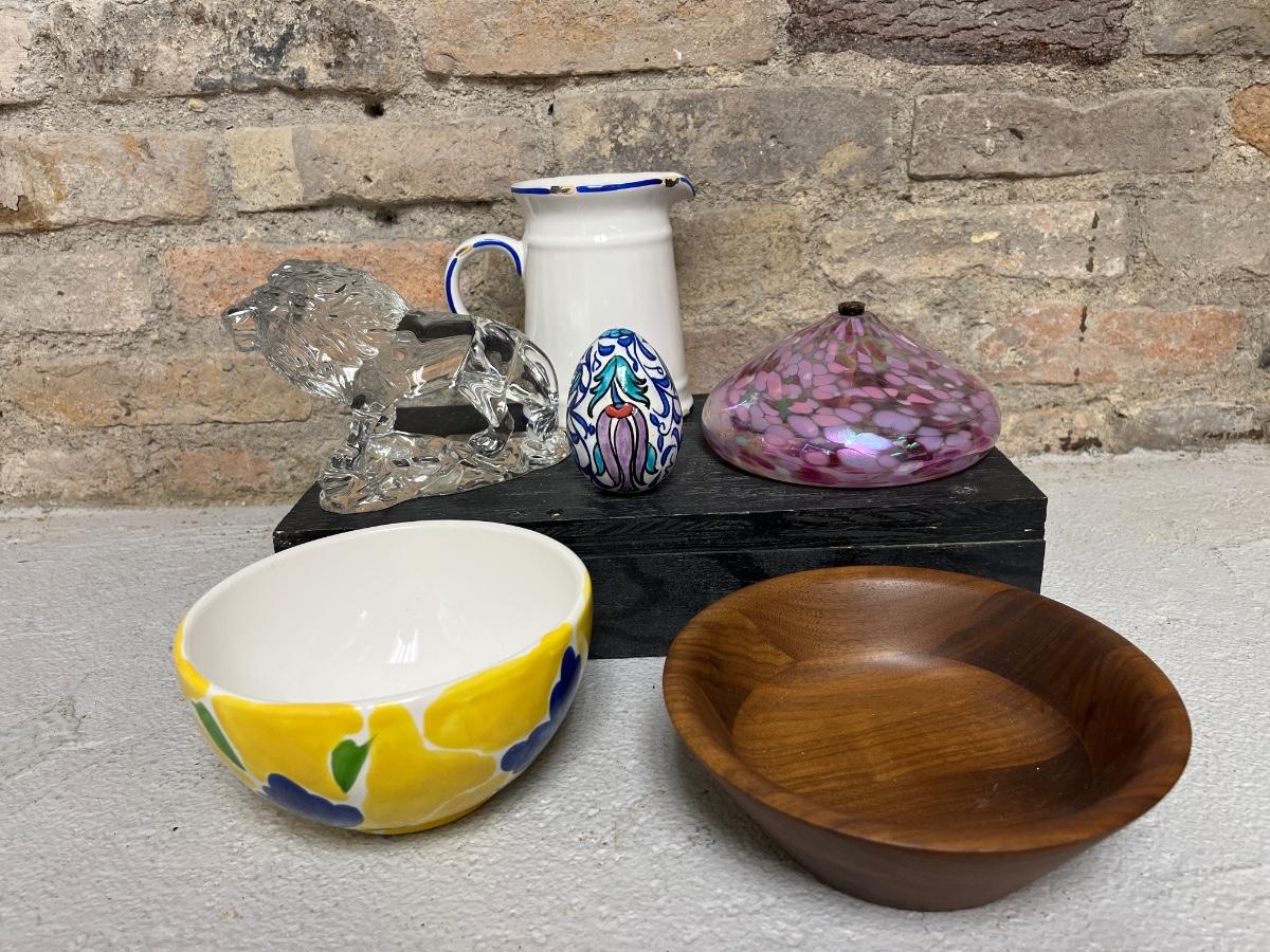 Cristal Au Plomb lion from their Wonders of the Wild collection, pink blown glass oil lamp, polychrome egg, walnut turned bowl, yellow and blue Dansk bowl, and white & blue pitcher