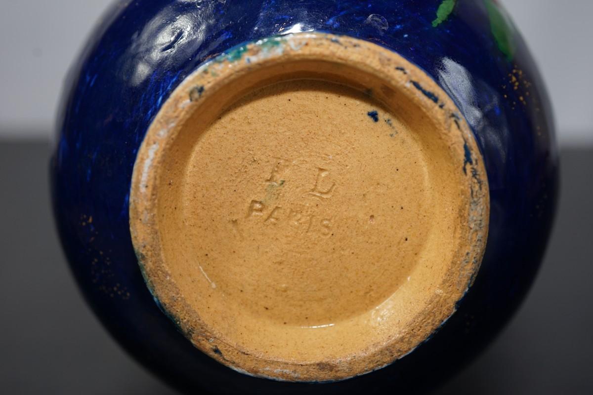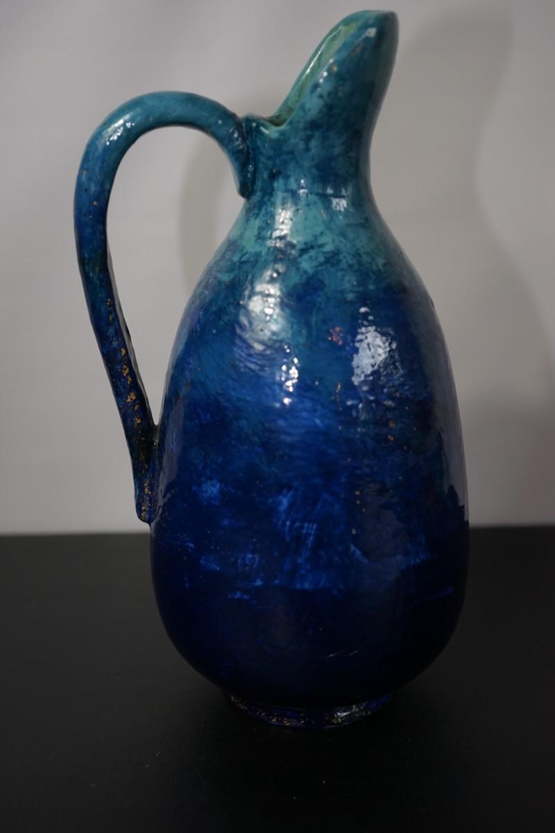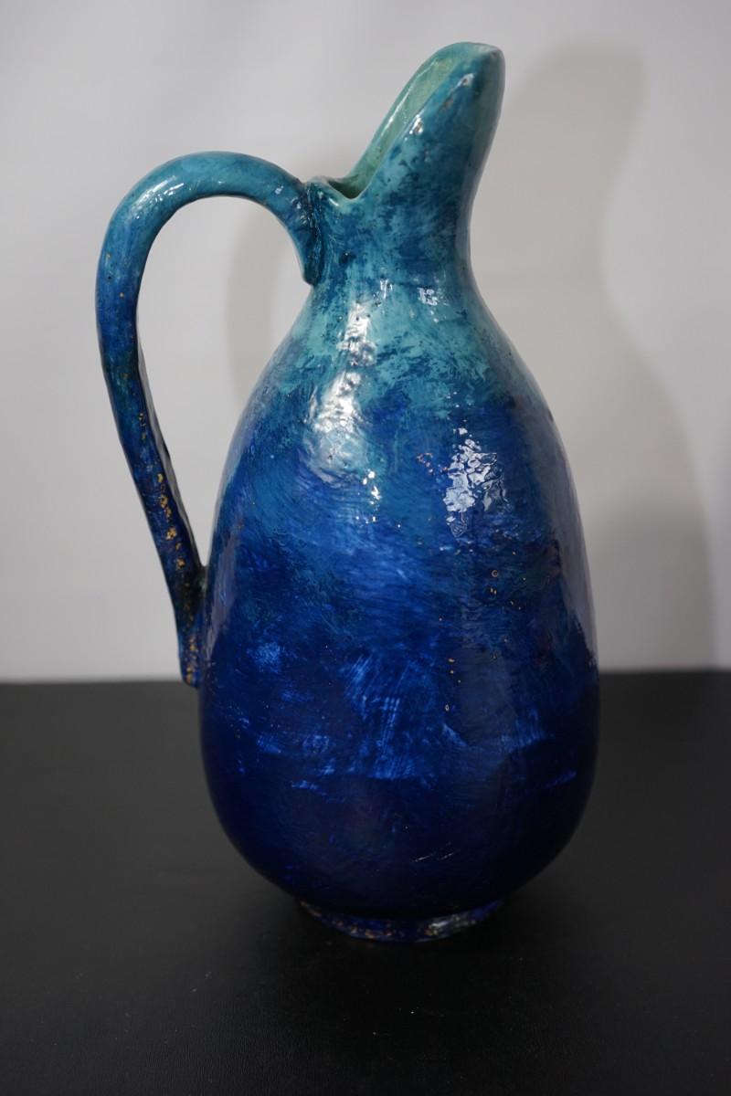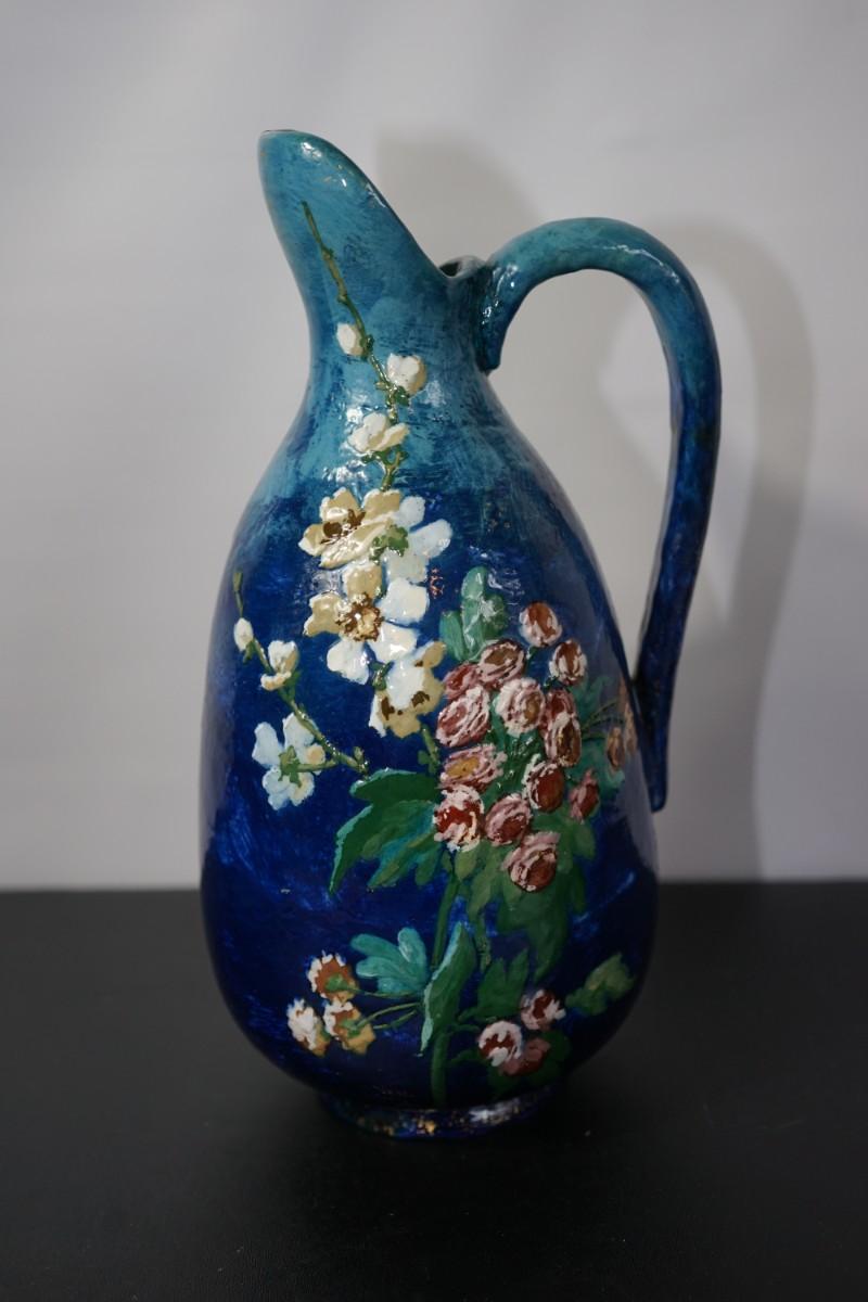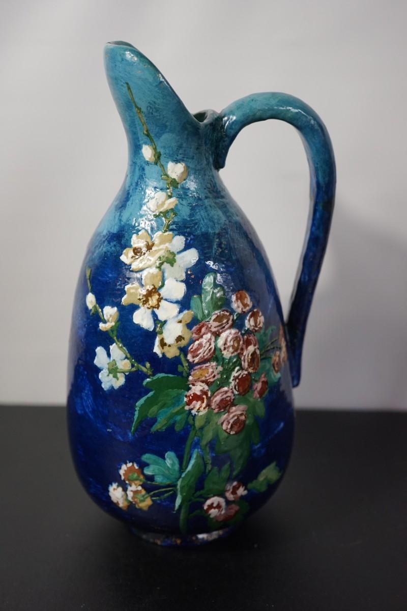 INTERESTING HAND CRAFTED POTTERY PITCHER OF HEAVY BLUE TONE GLAZE & HAND PAINTED FLORALS