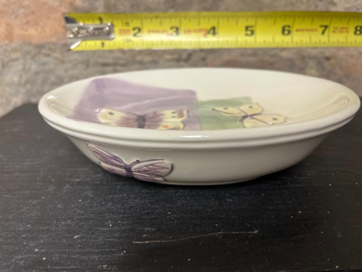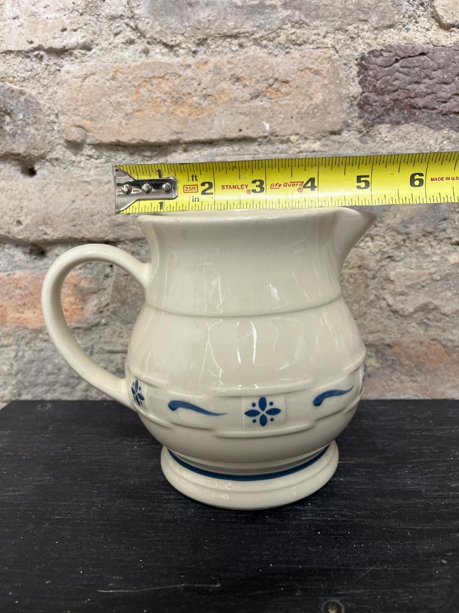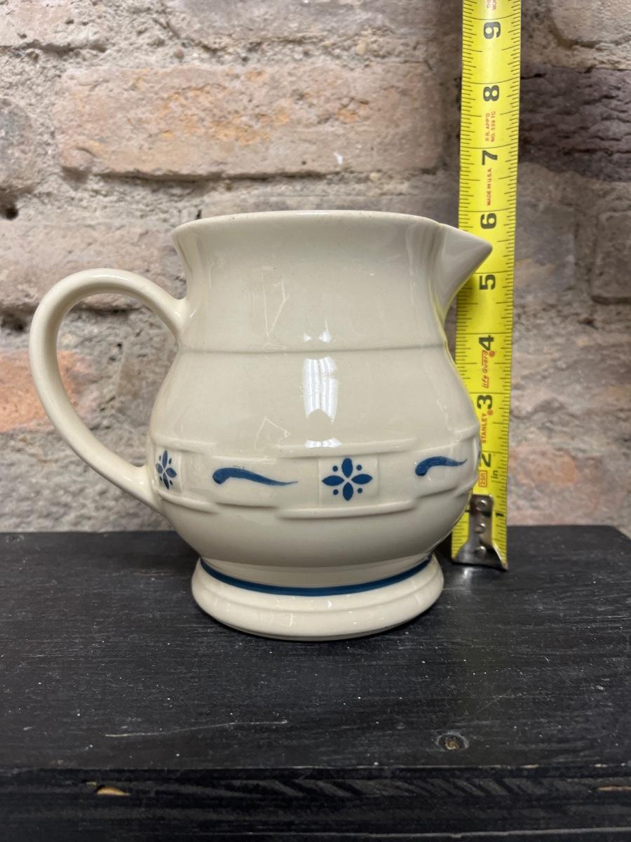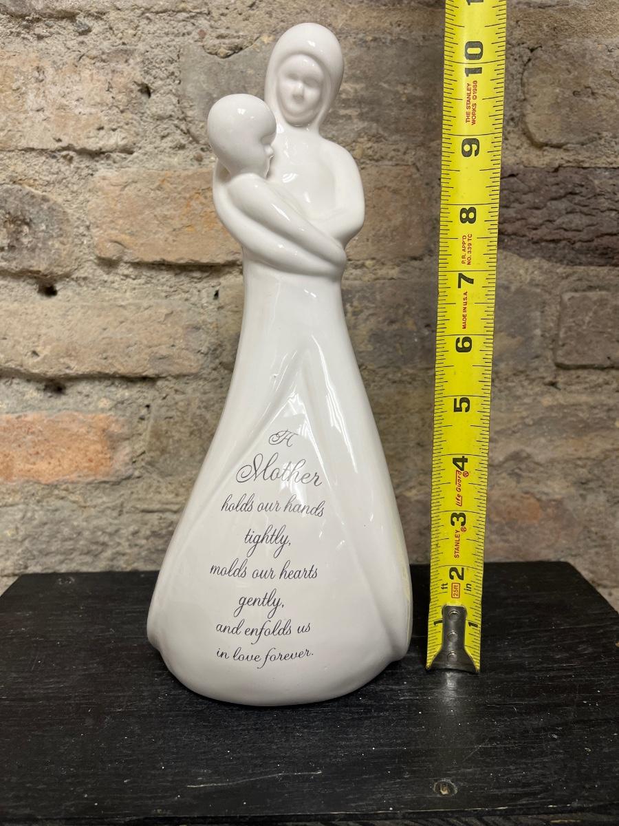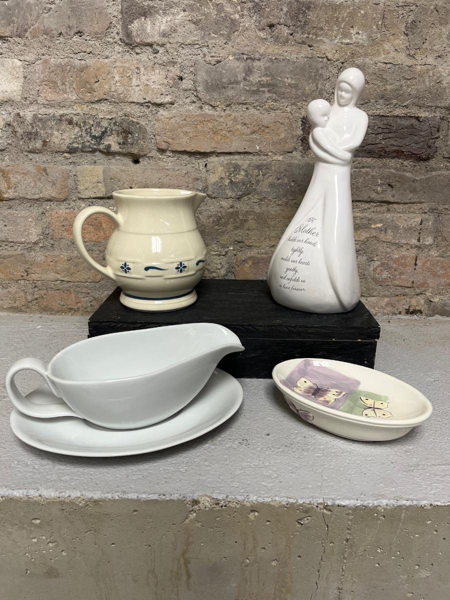 Longaberger pitcher, excellent white gravy pitcher with underplate, amethyst butterfly soap dish and tall mother & child figurine