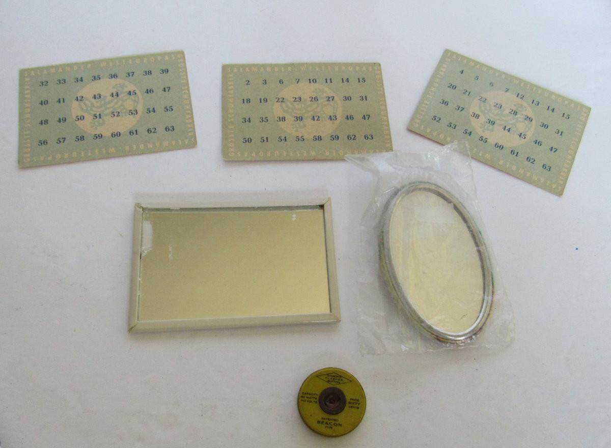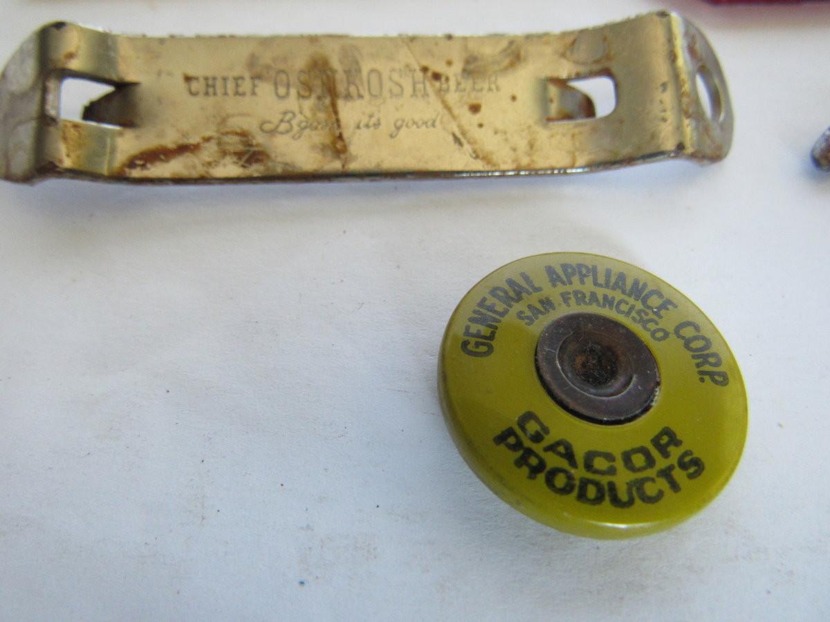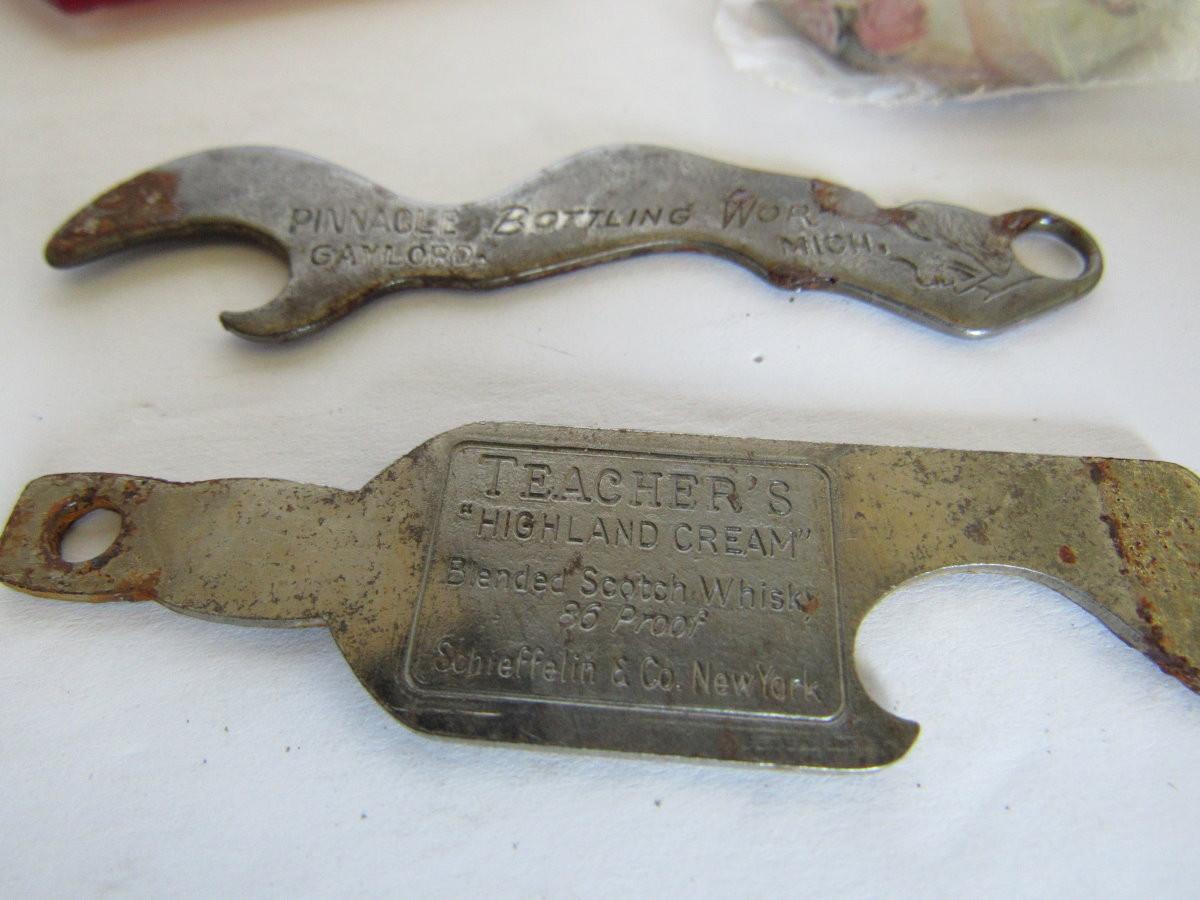 Openers are Chief Oshkosh, Pinnacle Btl, Teachers Whisky. The little round thing is Diamond Flasher Button, the mirrors are nice. The Salamander Shoes cards are from Germany and are in nice shape. Shipping is available on this lot at USPS cost plus handling fee for each box shipped out. See our terms for details.