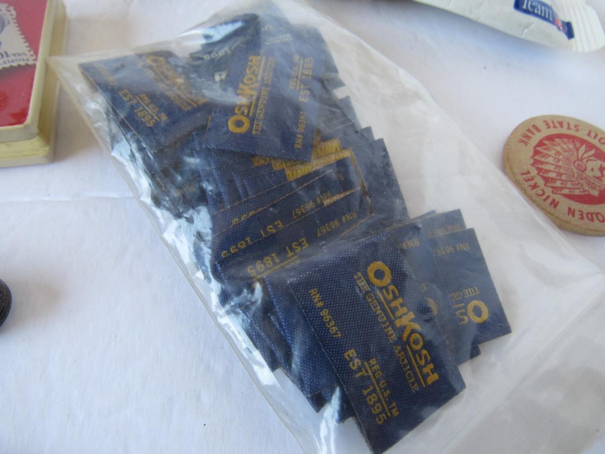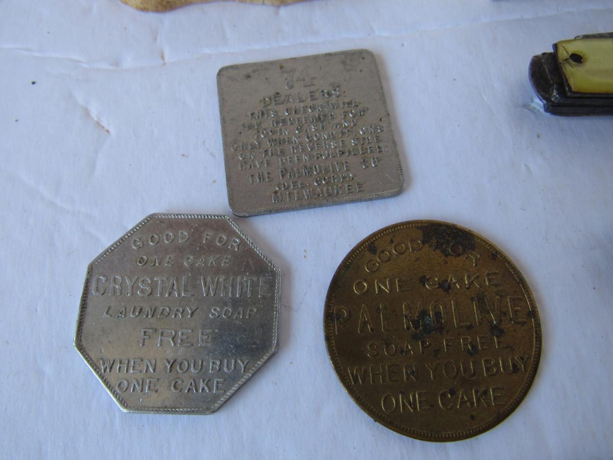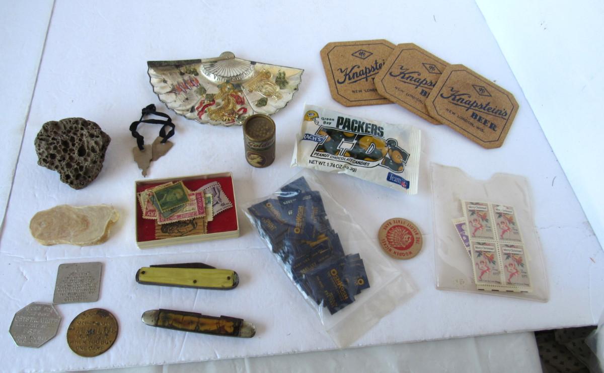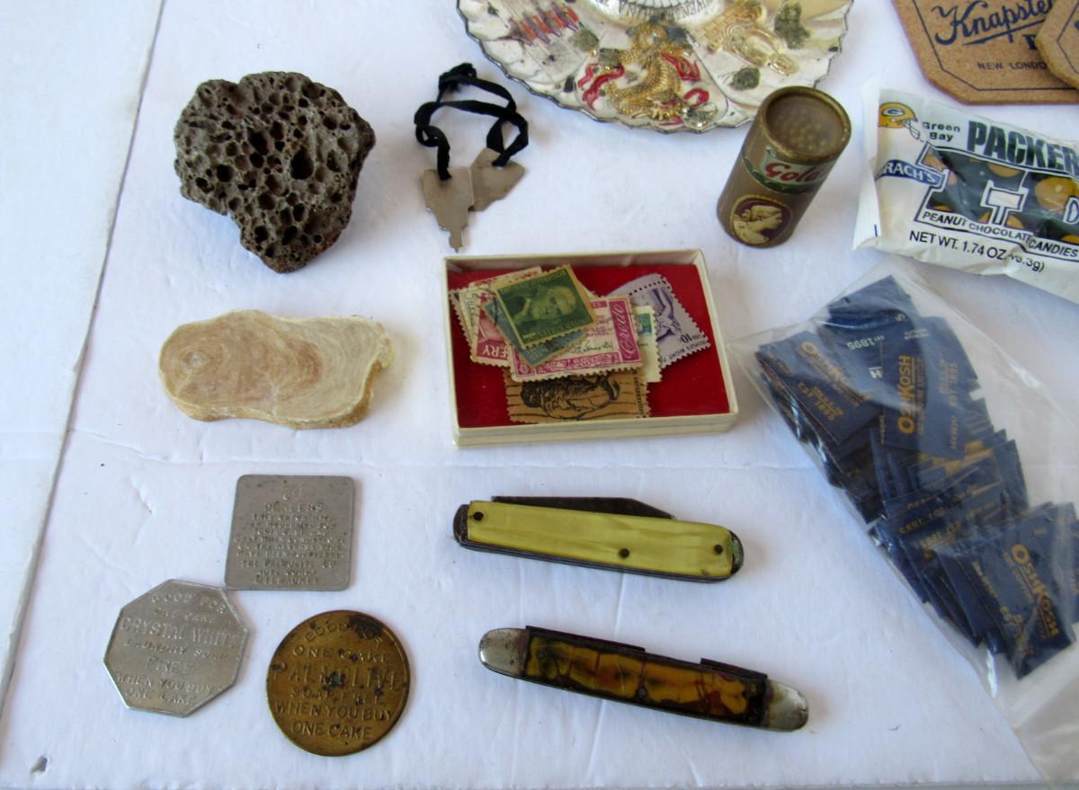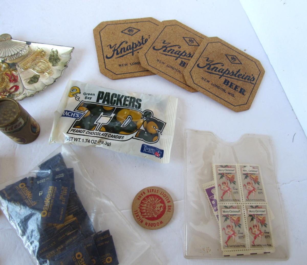 Knapstien's coasters, GB Packers candy pack, old stamps. old gold topped wood matches in holder, tokens, more. From well used to good. Shipping is available at actual shipping cost plus $5.00 handling fee per box for supplies/labor. See our terms for details. All sales are final. Condition notes may not be all inclusive, we may miss some issues as most vintage items are not in mint condition and have some degree of wear, paint loss, etc, but we always try to note obvious damage.