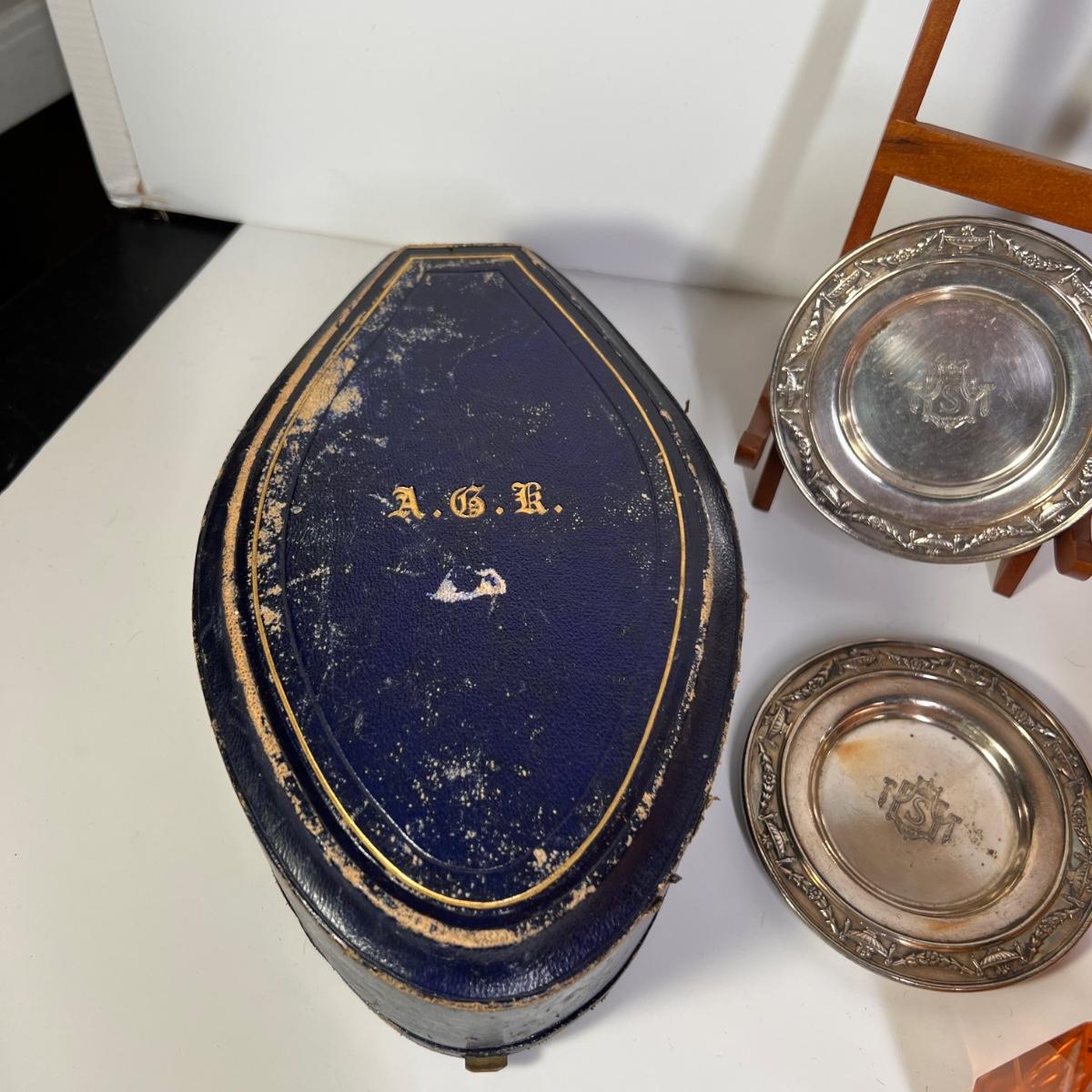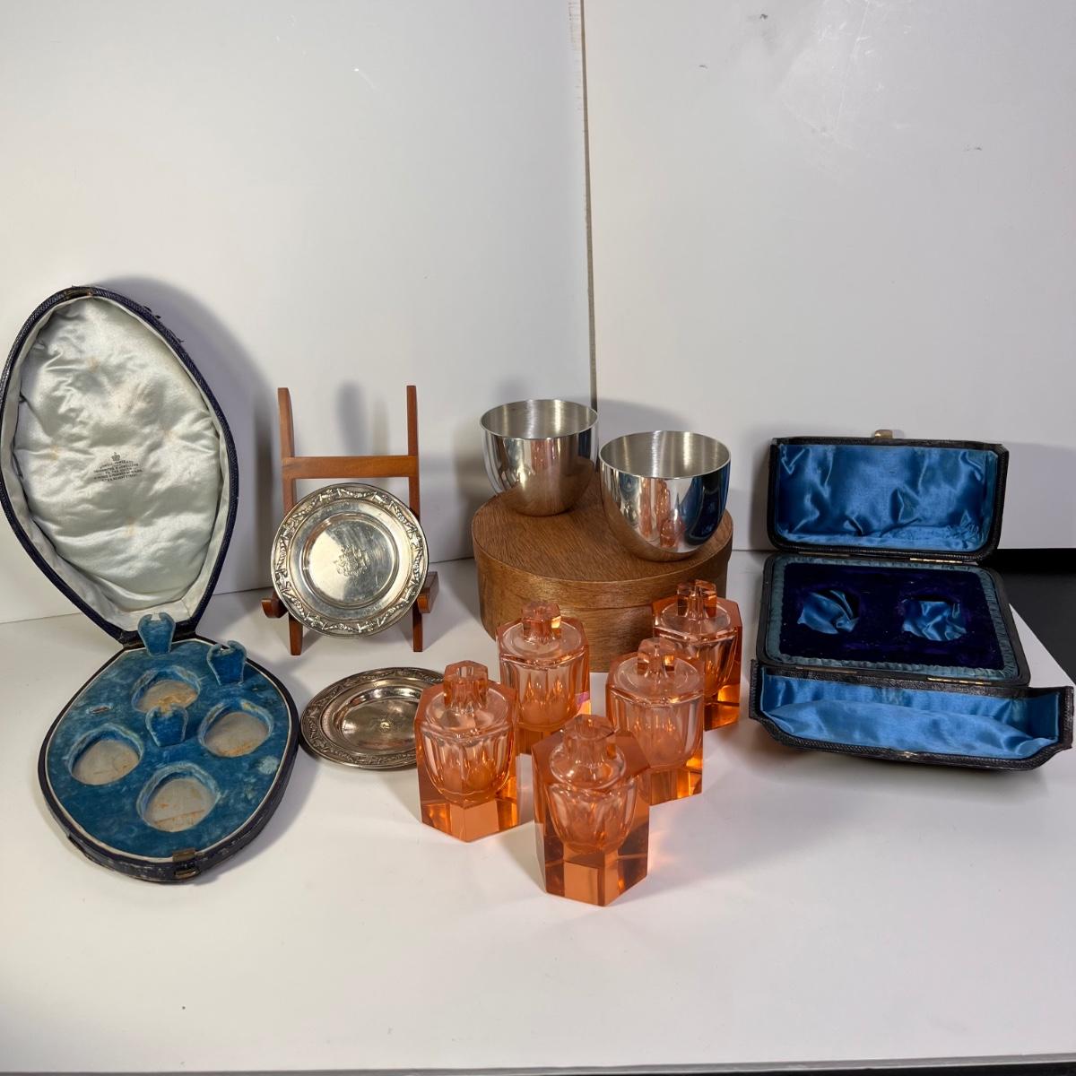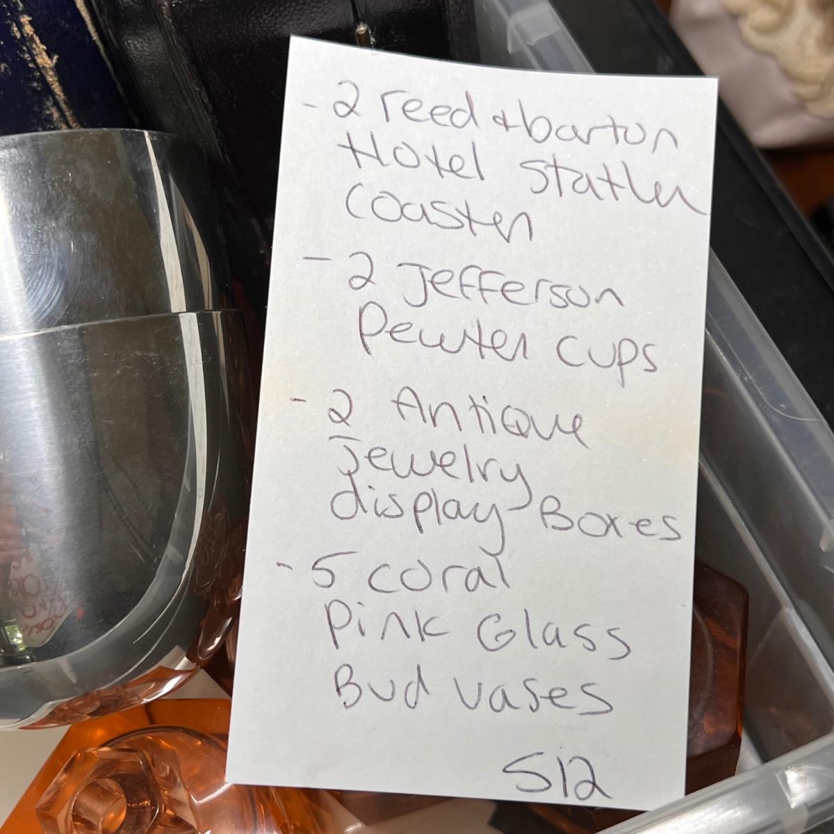 5 pink coral glass bud vases, 2 Reed & Barton hotel Statler coasters, 2 MCM Jefferson pewter cups, 2 antique jewelry display boxes
