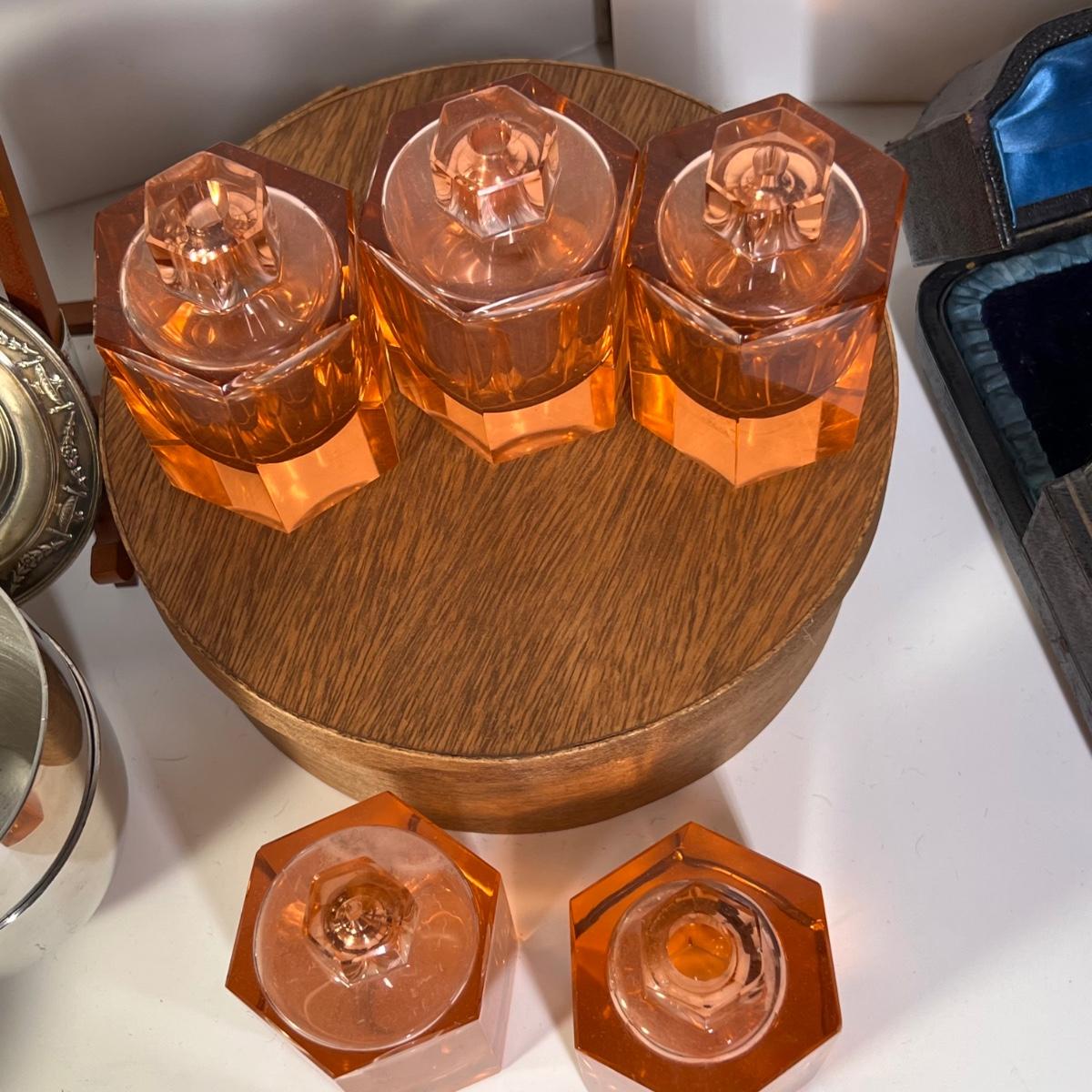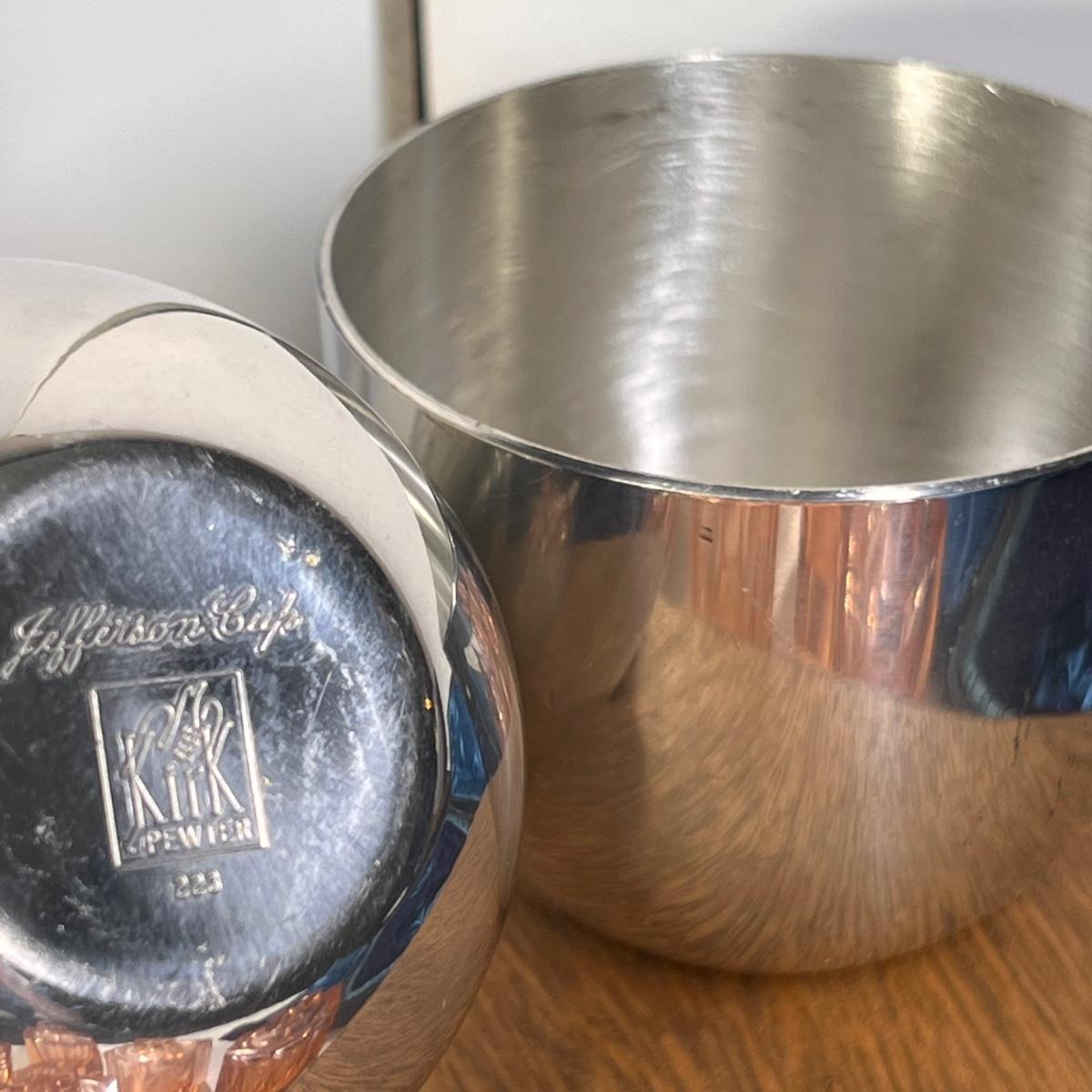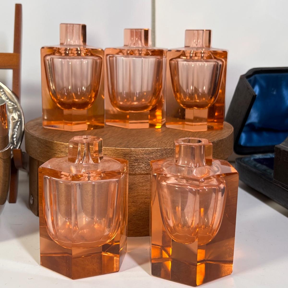 5 pink coral glass bud vases, 2 Reed & Barton hotel Statler coasters, 2 MCM Jefferson pewter cups, 2 antique jewelry display boxes