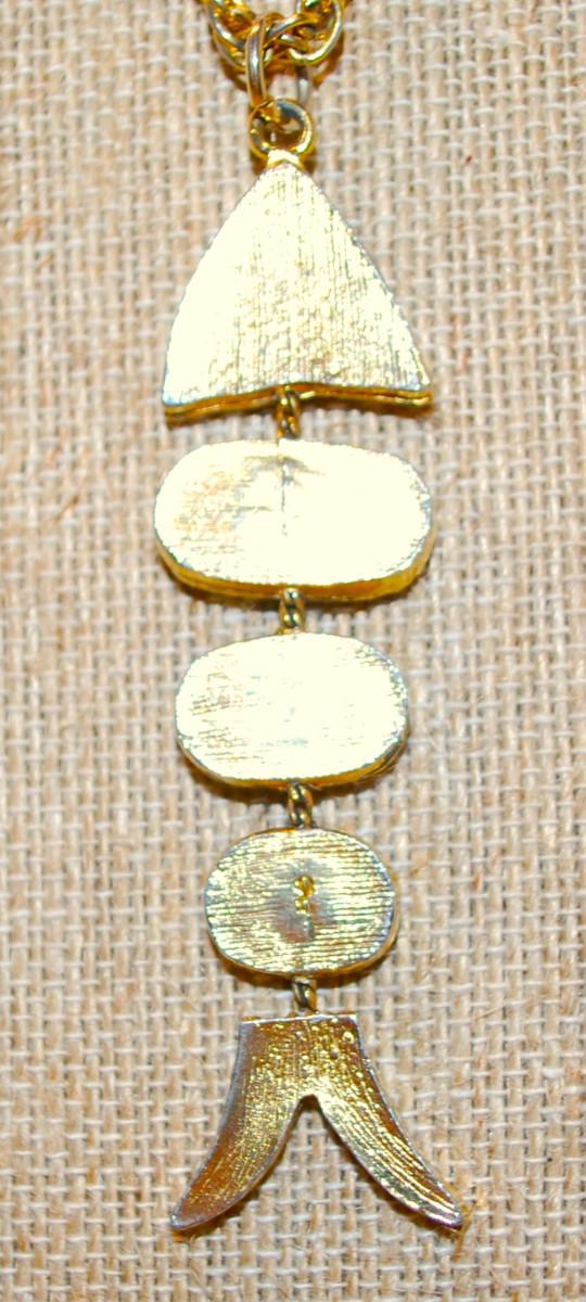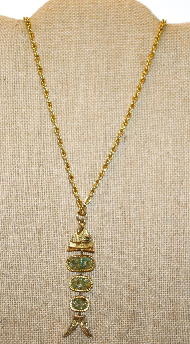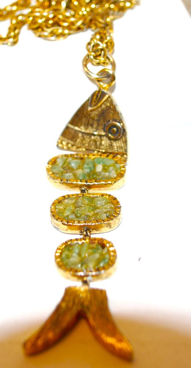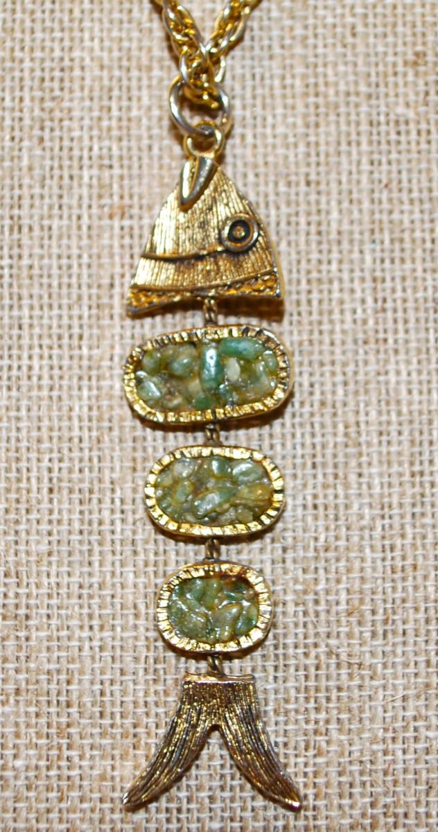 Interesting Moveable 5 Piece Split Fish with Green Inlays PENDANT (3½" x ¾") on a Sturdy Dark Gold Tone Necklace Chain 24" L