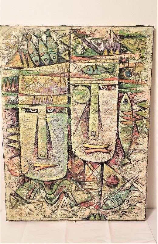 This interesting, well-done painting measures about 24" x 32", unframed. - oil on canvas. Muted shades of green and terra cotta - tribal masks with fish/sea images. Indistinguishable signature - dated 1998.