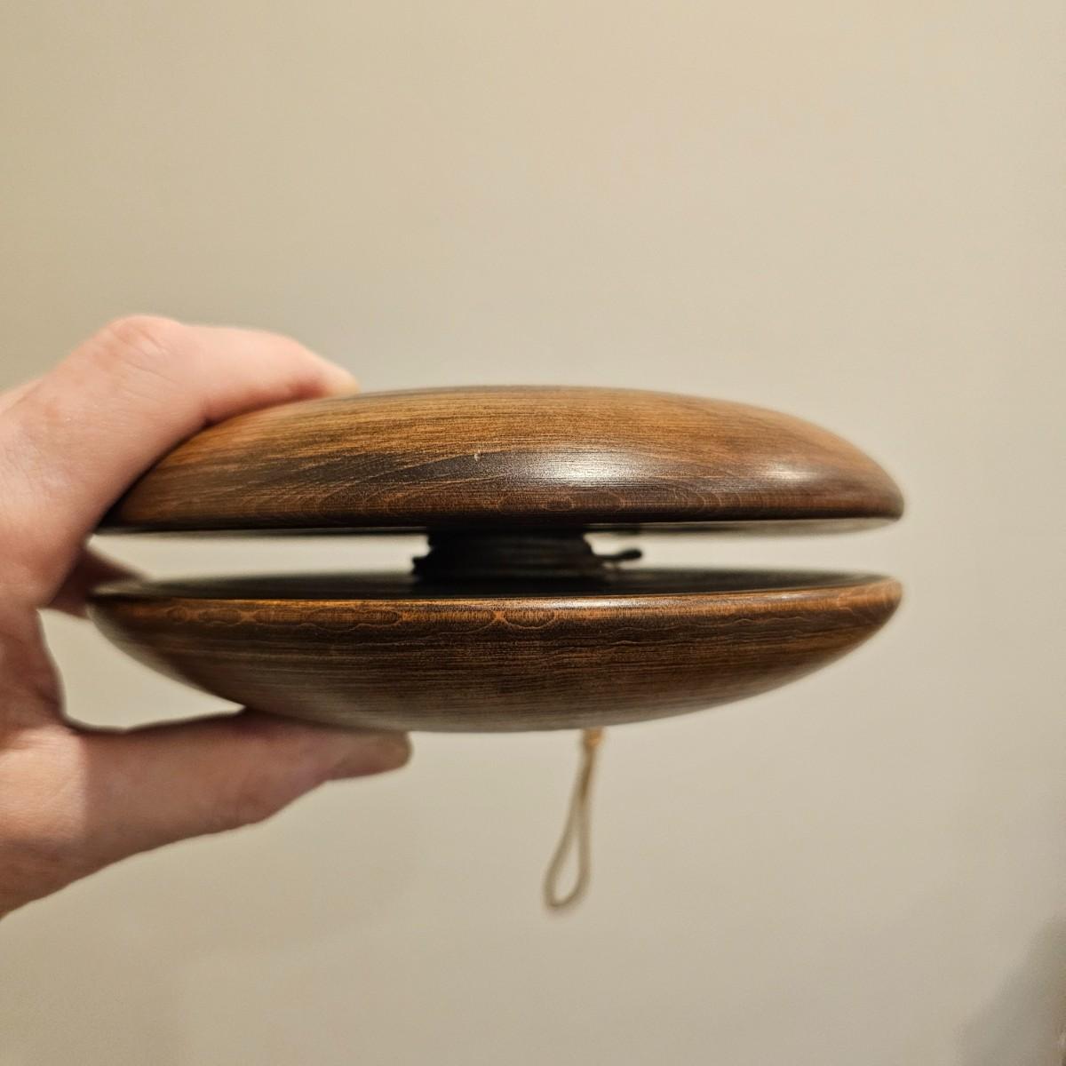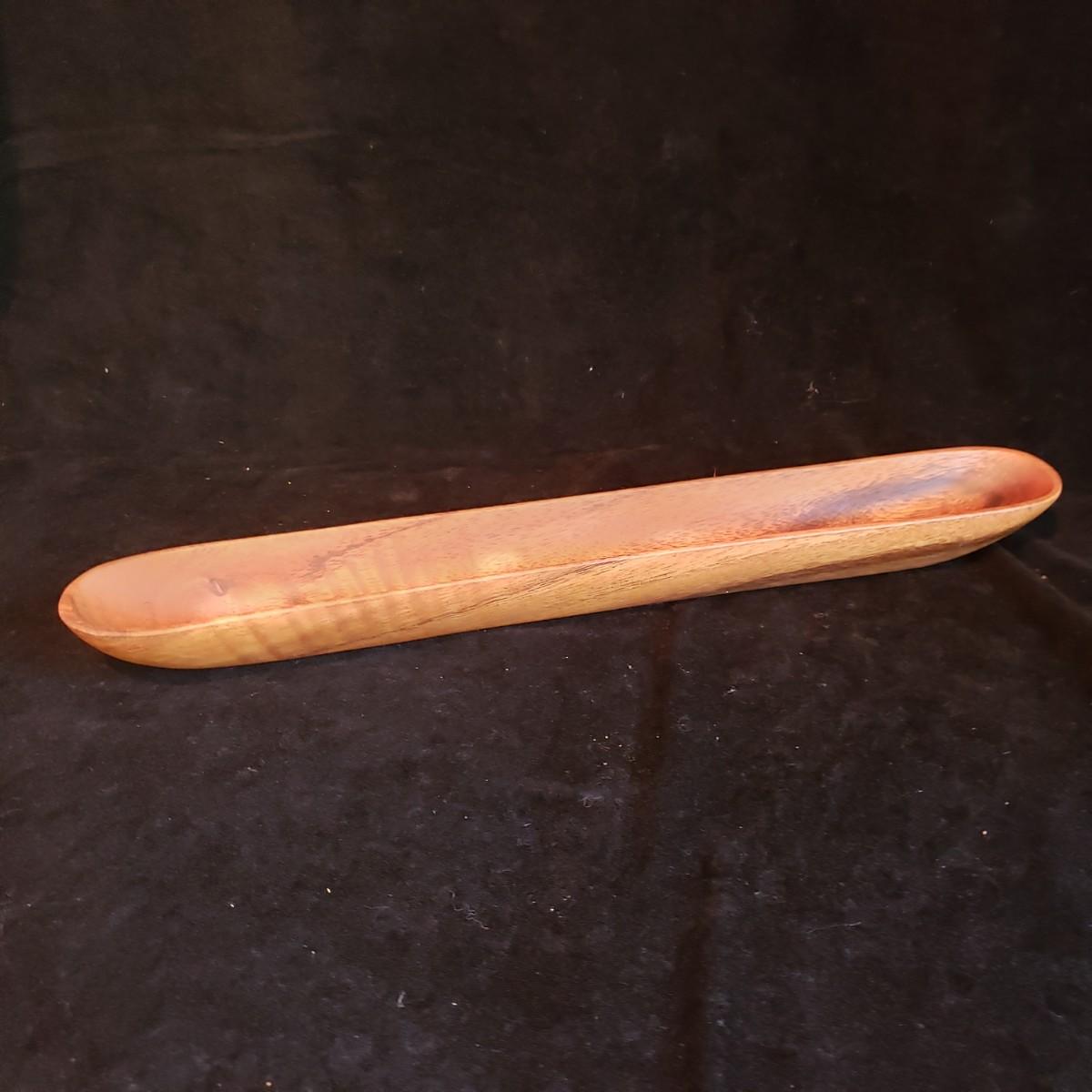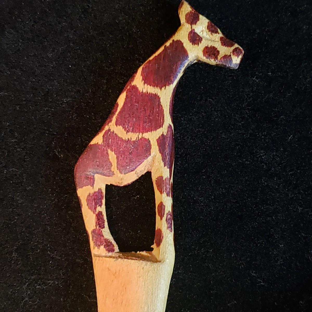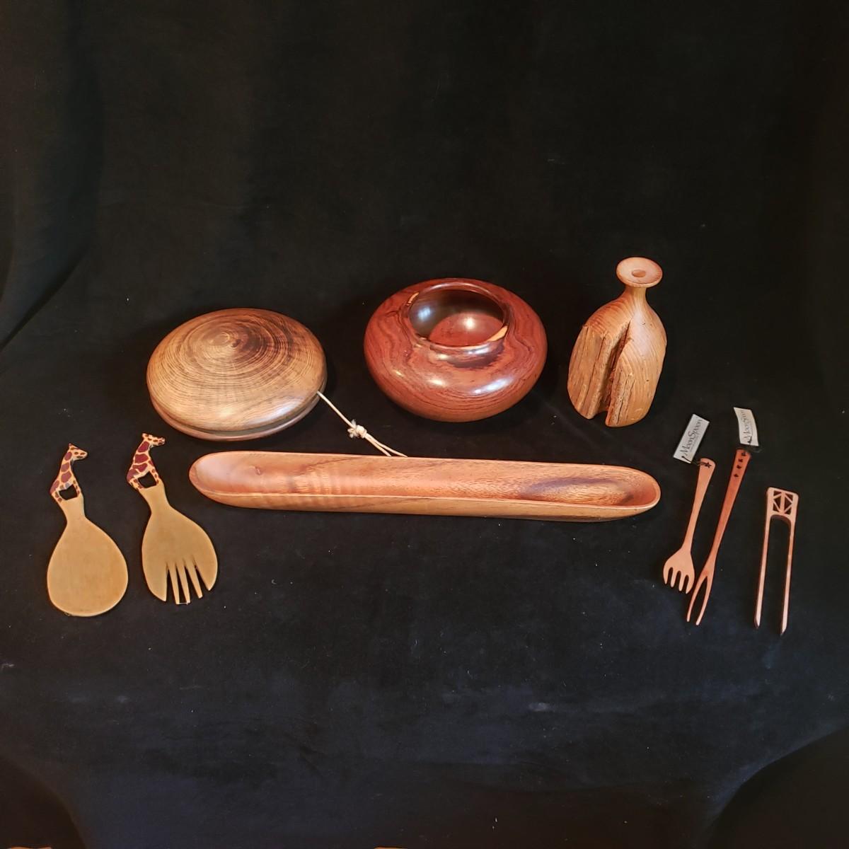 This wooden art lot is not only beautiful, but also useful! The giraffe salad tongs are ready to use! The large yo-yo is heavy to the touch and measures 7"D x 2"H. There is a streak on the finish that looks like a gouge, but it is smooth. The primitive tree vase measures 3" x 7"H. The long Olive tray is made by Pacific Merchants. The three utensils are made by Moon Spoon, two are new with tags.