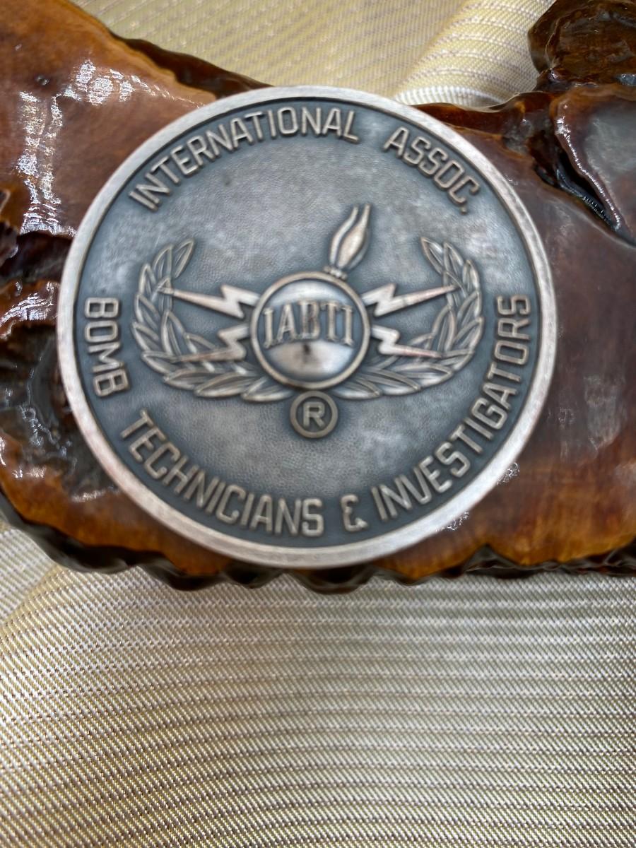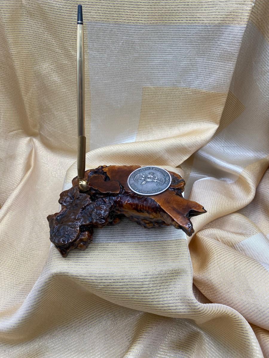 Challenge Coin is mounted on tree burl, with a desk pen.