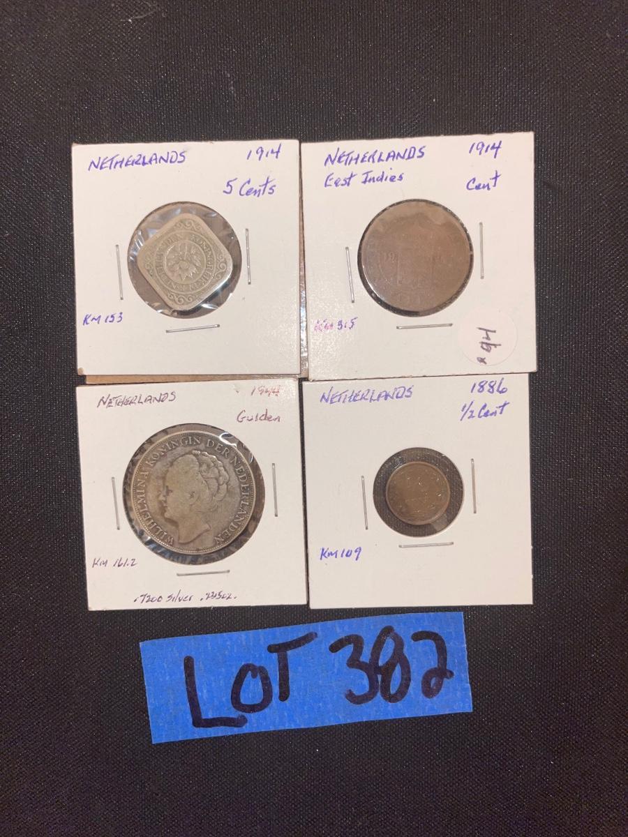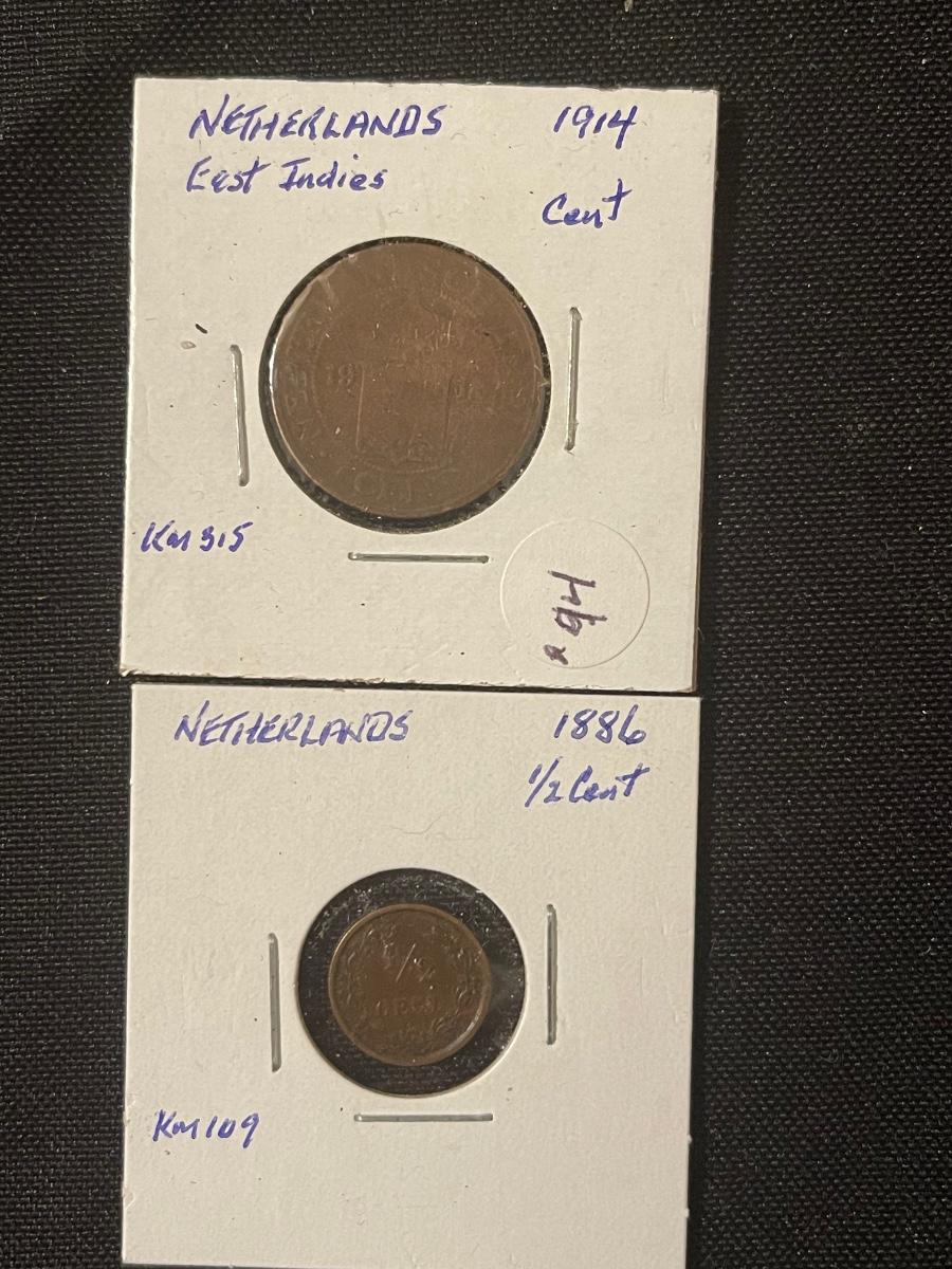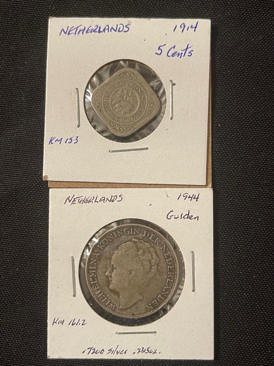 (4) Netherlands Coins - 1914 5 cents, East Indies 1914 cent, 1944 Gulden .7200 silver, 1886 1/2 cent