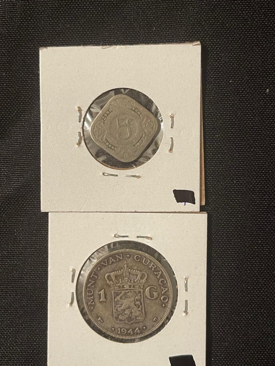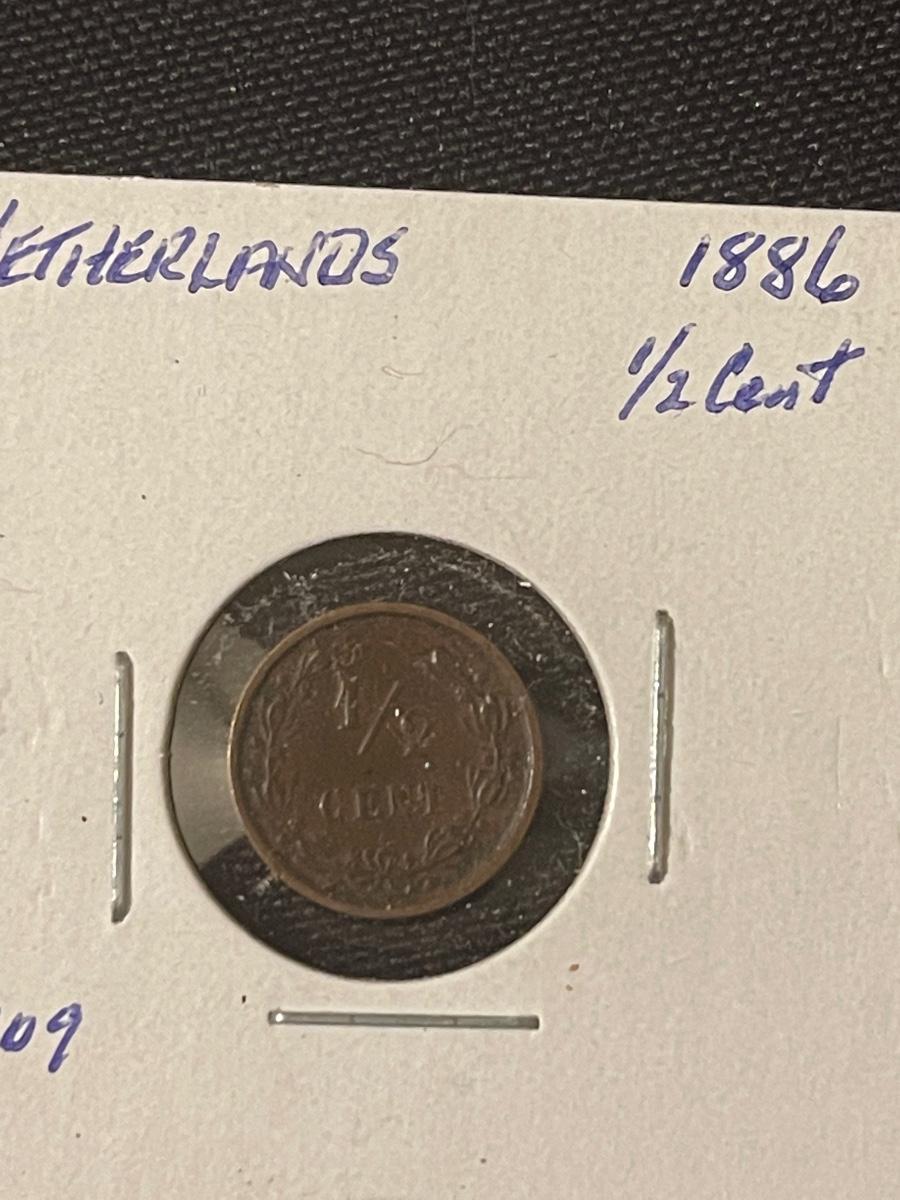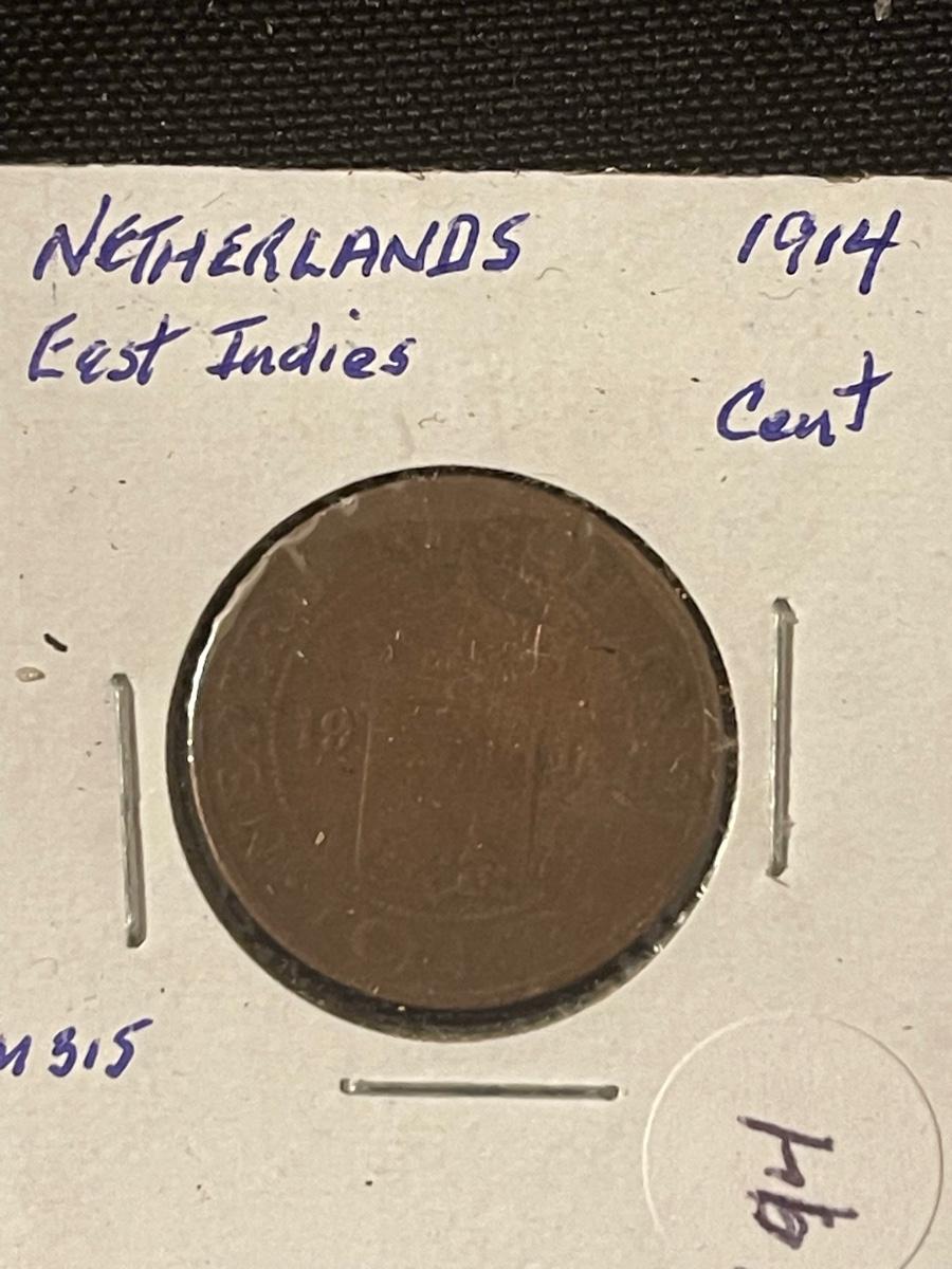 (4) Netherlands Coins - 1914 5 cents, East Indies 1914 cent, 1944 Gulden .7200 silver, 1886 1/2 cent