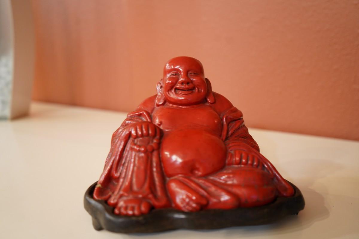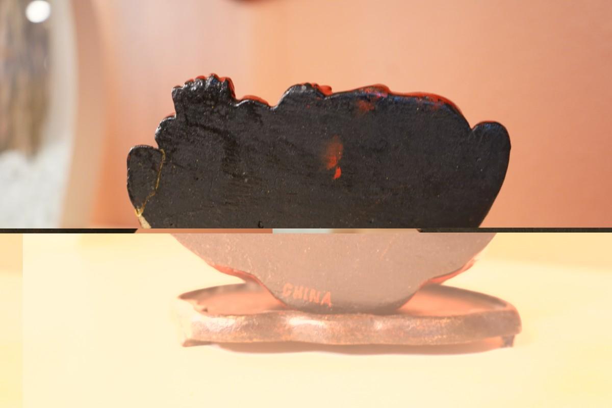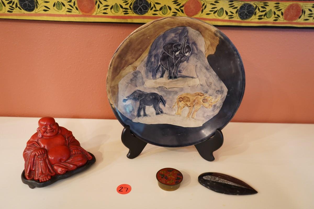 Red Buddha, African Plate & Stand, Decorative Paperweight and Brass Trinket Dish. Buddha measures 6.75 x 4.5. Plate & stand measures 12.25 x 4 x 14. Paperweight measures 5 x 3. Trinket Dish measures 2.5 in diameter x 1.
