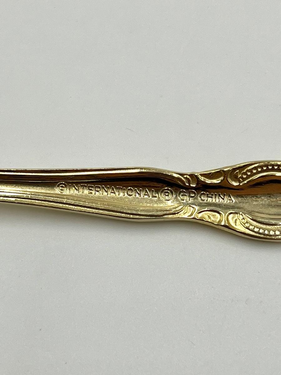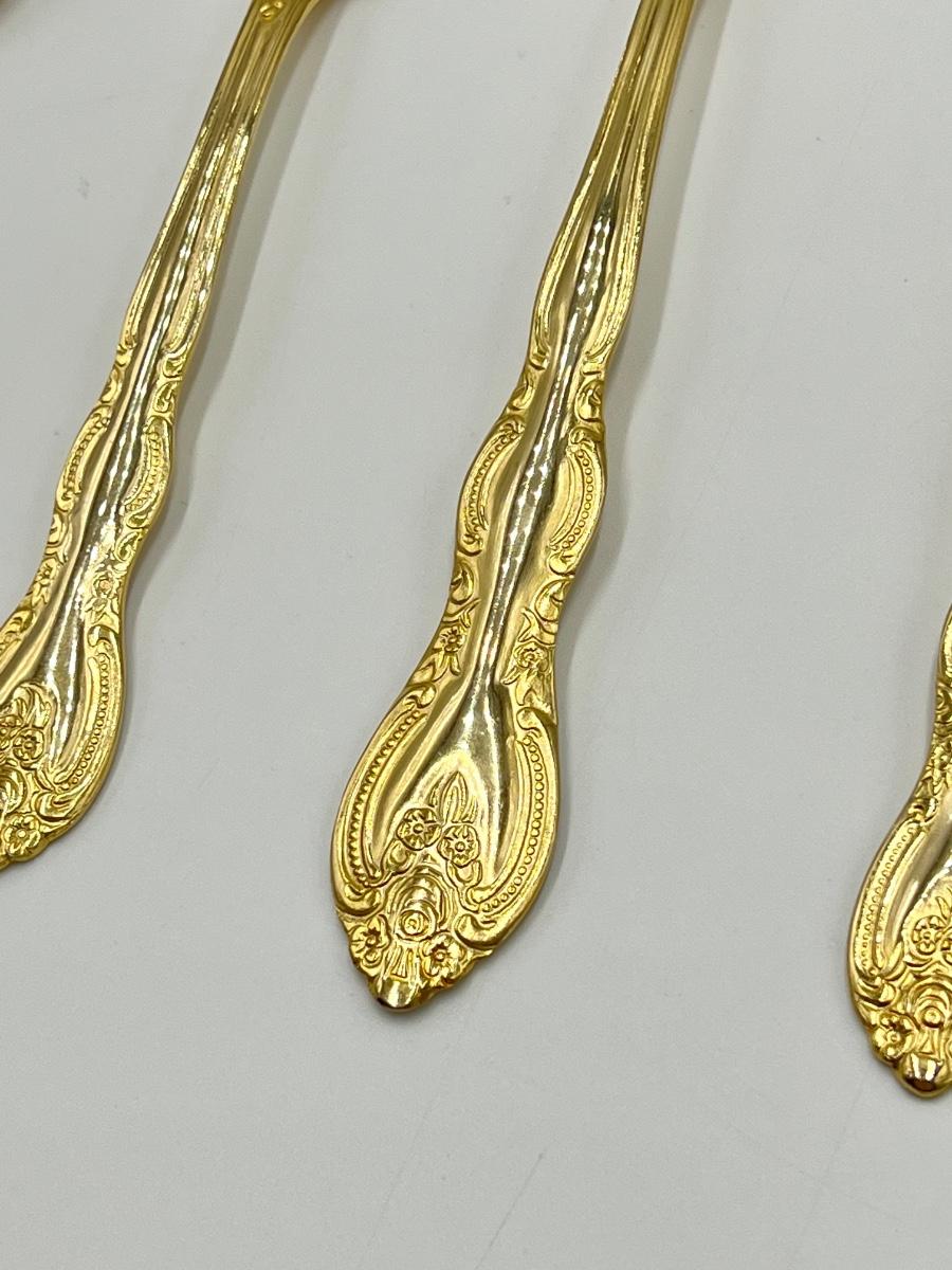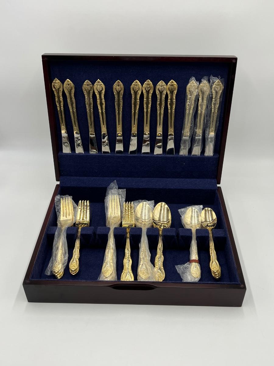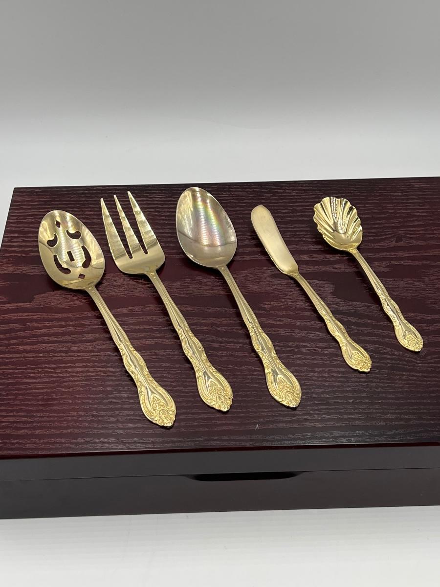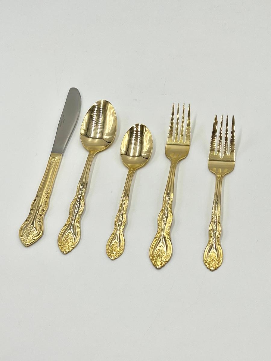 Gold Plate ~ Includes: 12 dinner forks ~ 12 salad forks ~ 12 soup spoons ~ 12 tea- spoons ~ 12 butter knives ~ 1 meat forks ~ 1 serving spoon ~ 1 slotted spoon ~ 1 condiment spreader ~ 1 sugar spoon
