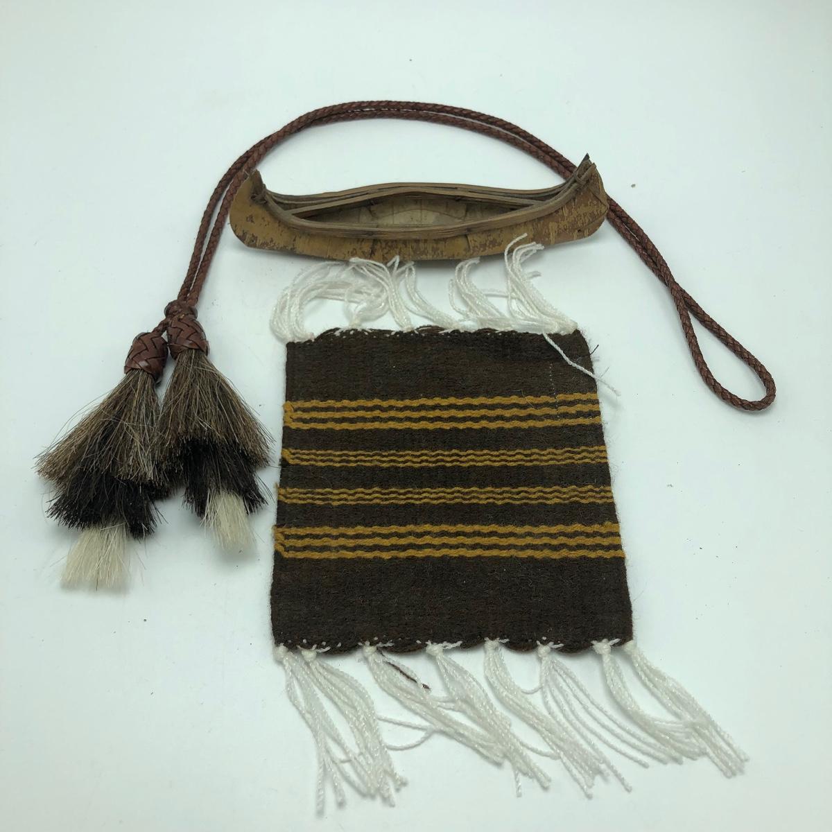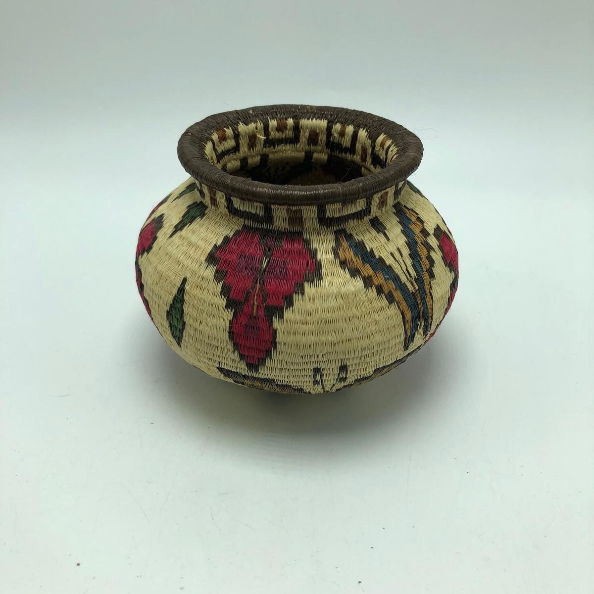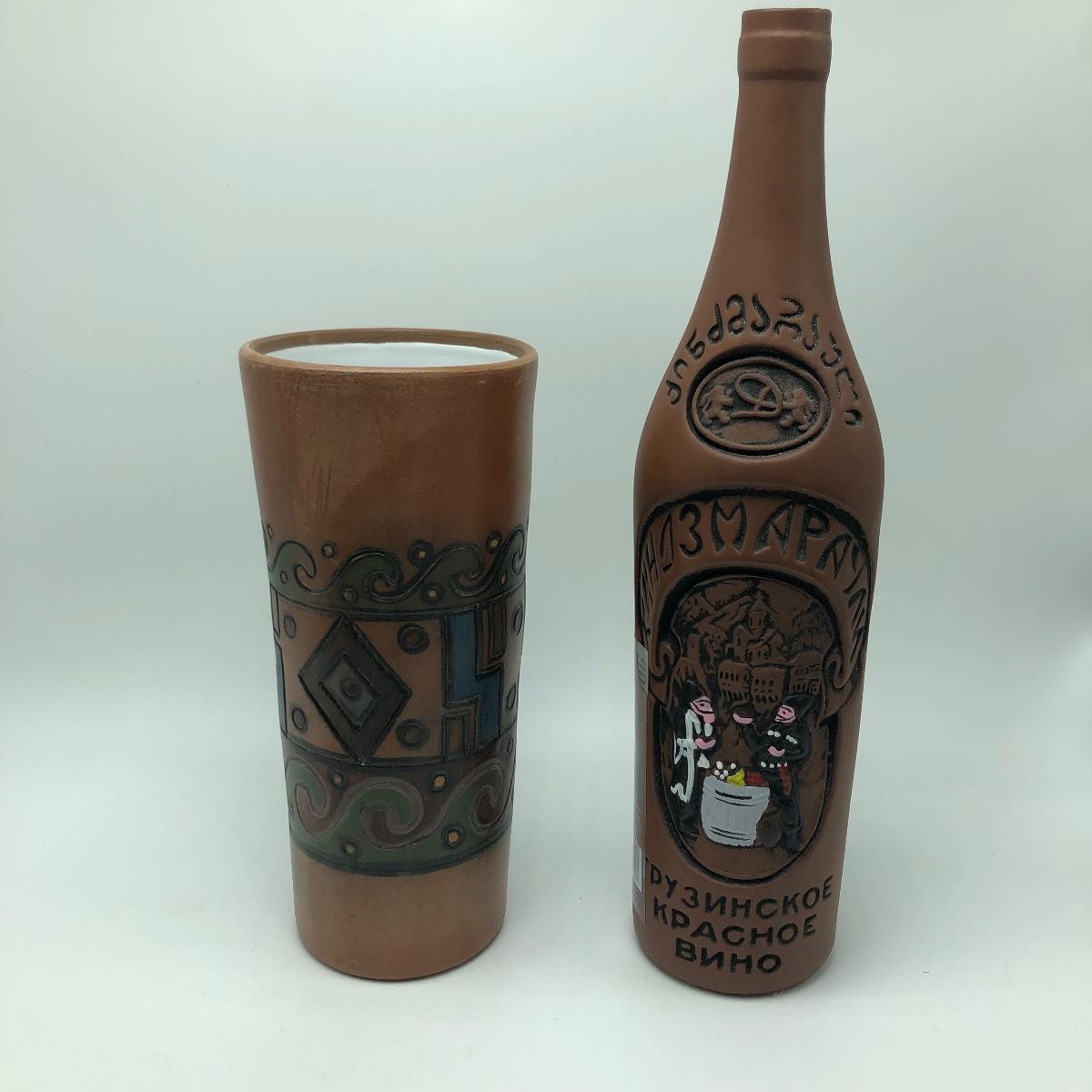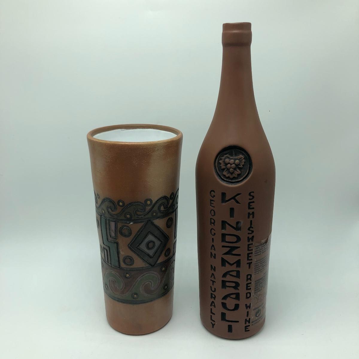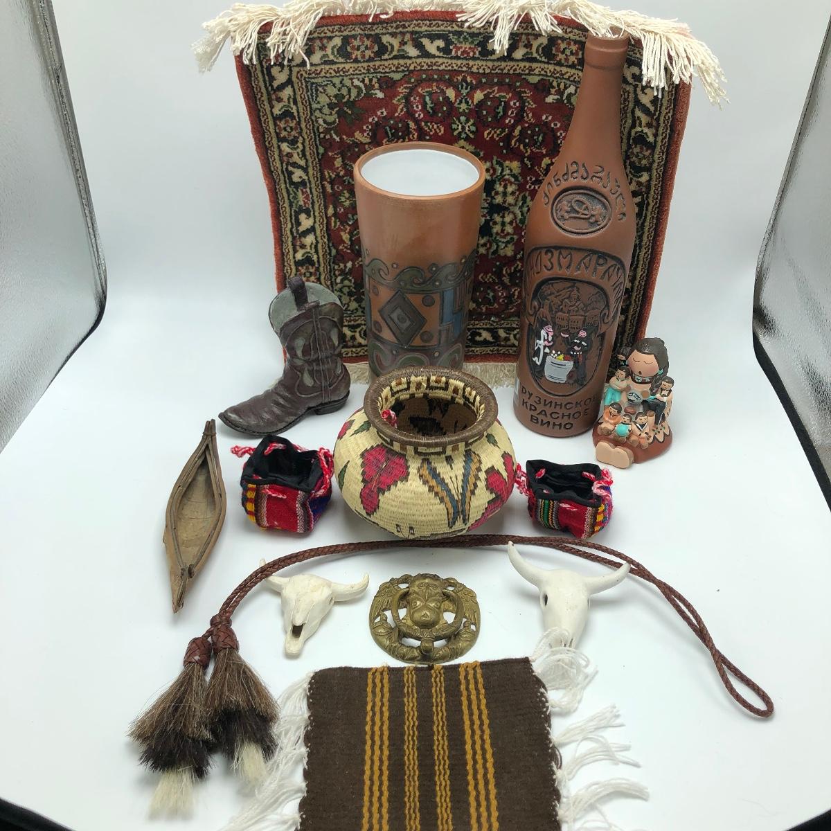 Lot includes Georgian wine bottle, ceramic vase, woven basket, Mexican mini rug, wooden mini canoe, brass knocker, figurine and more. Bottle measures 3”D x 12”.