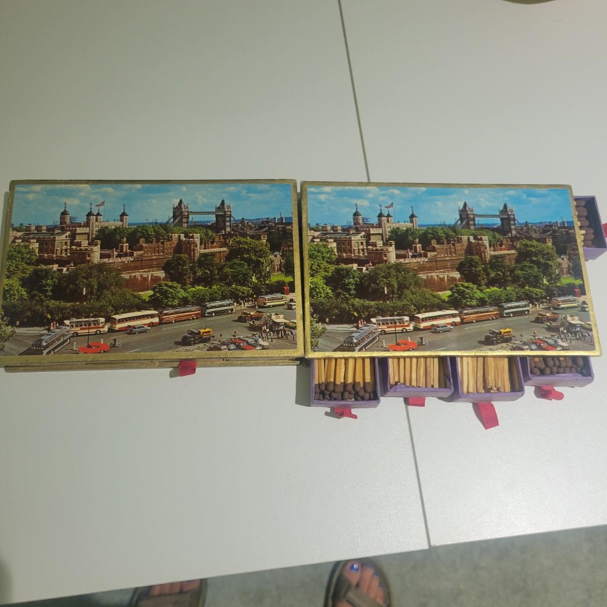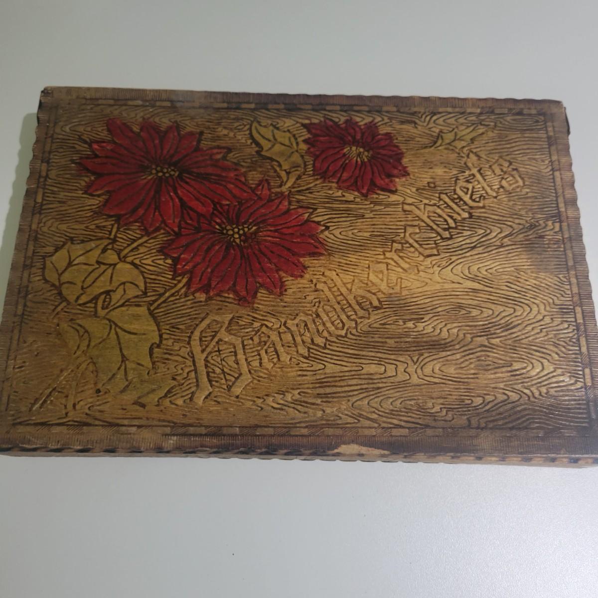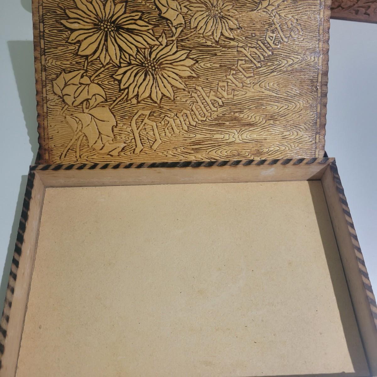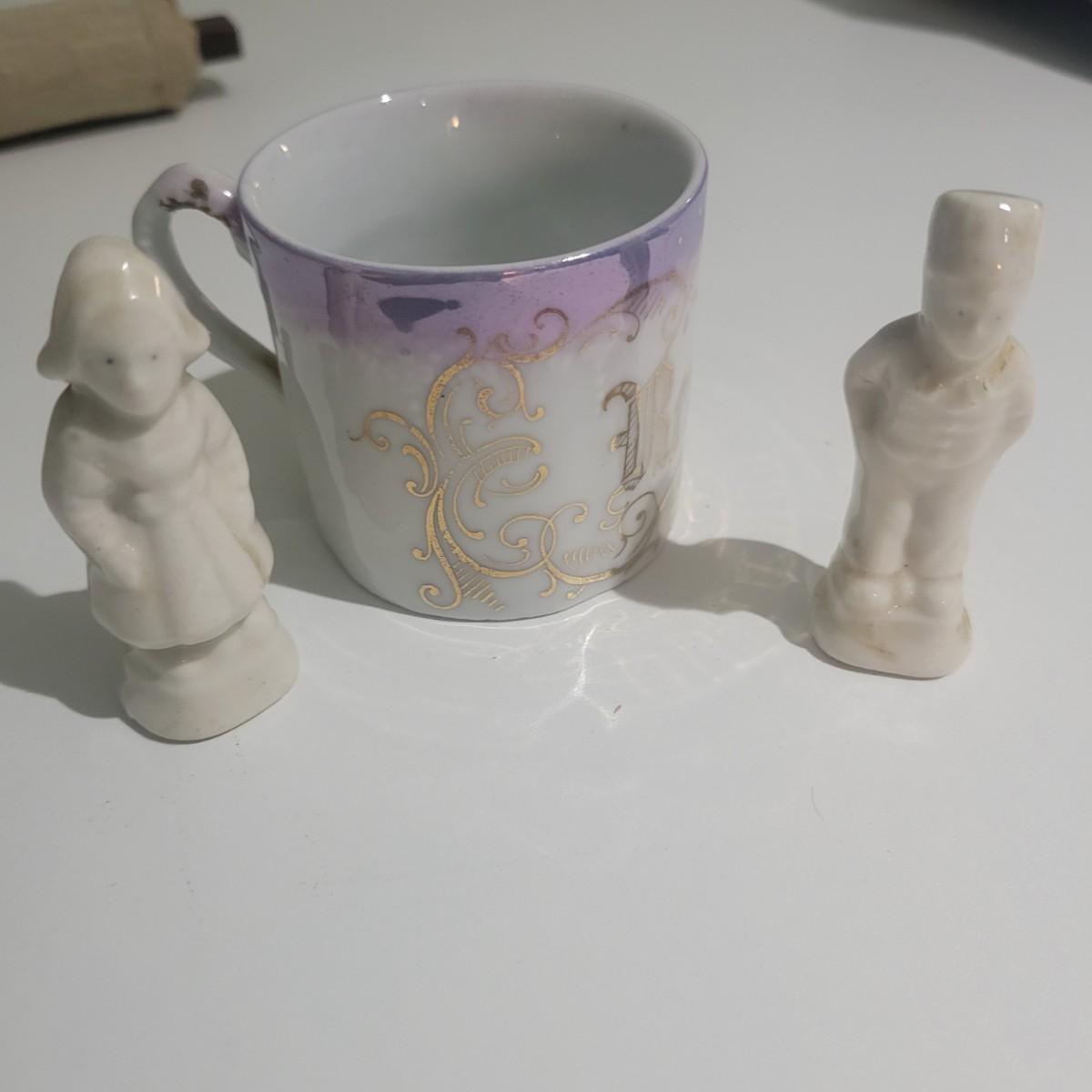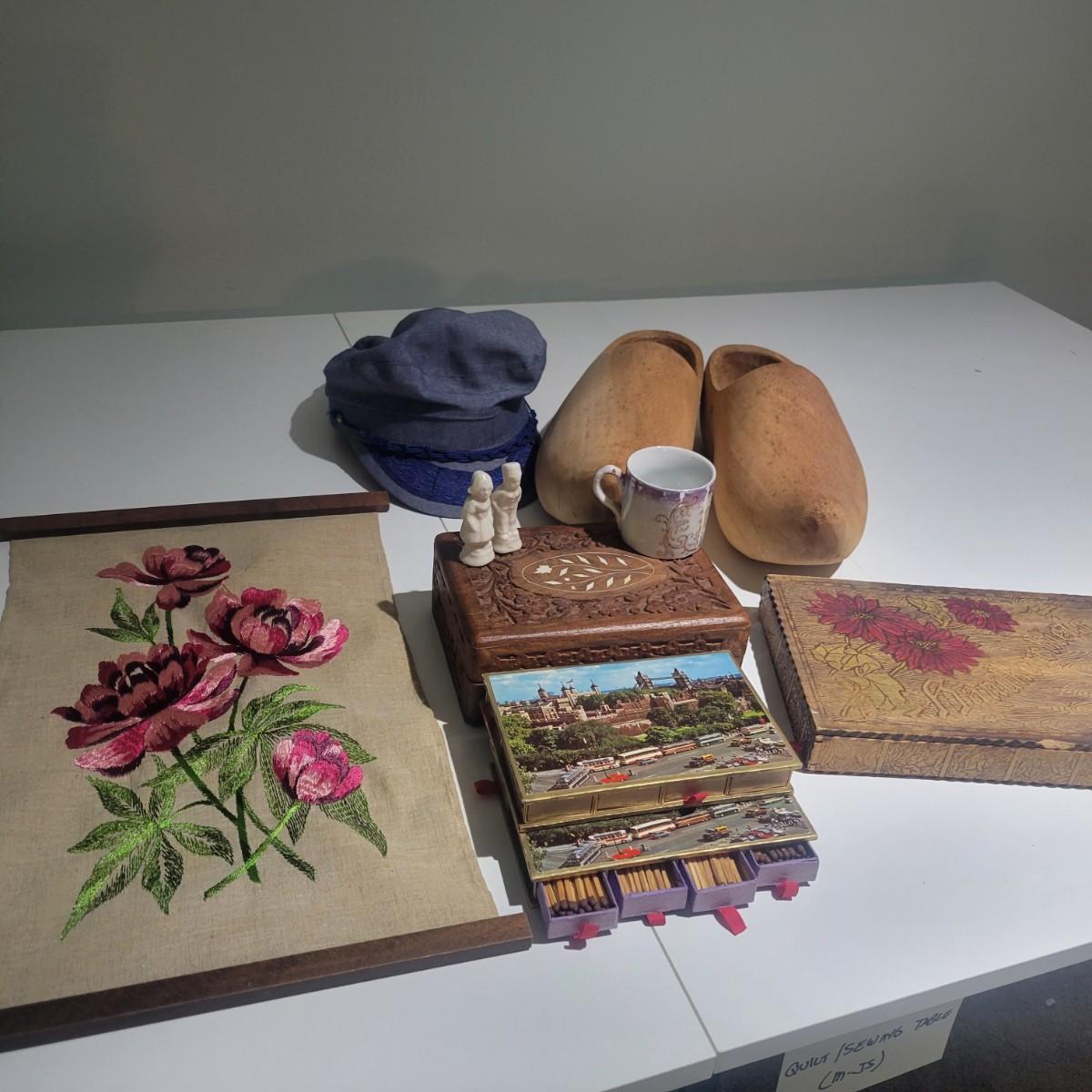 An assortment items from Europe and around the world. Wooden clogs from the Netherlands, a fisherman's hat from Greece, a small ceramic cup and porcelain figurines from German. A carved wooden box and embroidered piece also from German, a hand carved box from India and two unique match boxes from England. Shipping available