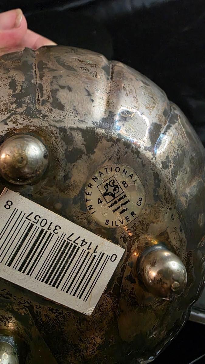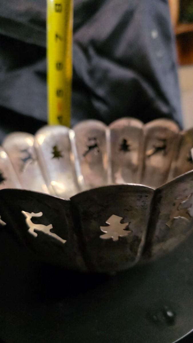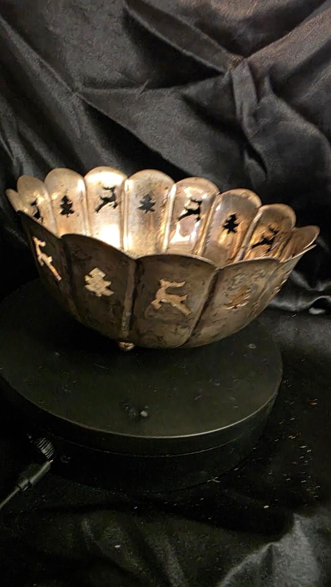 A beautiful touch of vintage holiday refinement, this handmade silver-plated footed bowl by International Silver Co. brings both charm and craftsmanship to any Christmas display. Measuring 7 inches in diameter and 4 inches tall, the piece is shaped with soft scalloped panels, each featuring festive cutout silhouettes — reindeer, Christmas trees, and classic holiday motifs that glow beautifully when placed near candlelight or seasonal lighting.