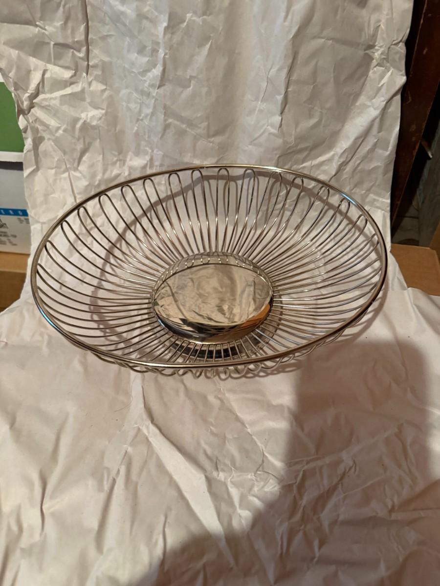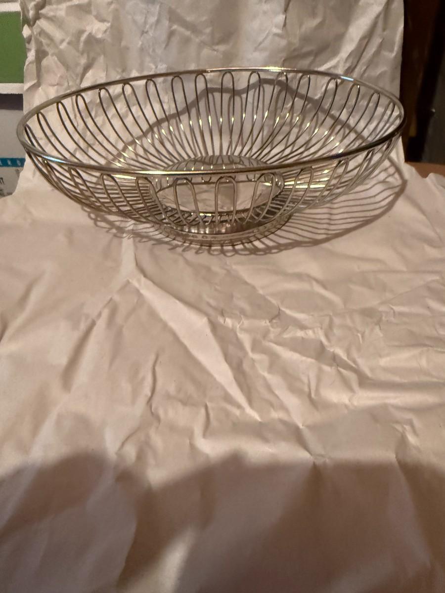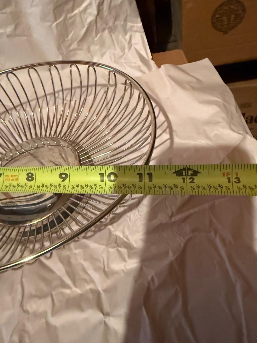 International Silver Company Silver Plated Vintage Wire Fruit Bowl: A beautiful wire fruit bowl measuring 10” across, perfect for displaying fresh fruit or as a stunning centerpiece.
