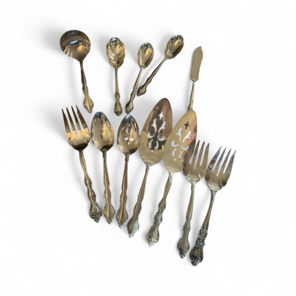International Silverware Set Includes: 11 Knives, 11 Dinner Forks, 12 Salad Forks, 20 Spoons, 8 Soup Spoons, and 12 assorted serving pieces. See Photos