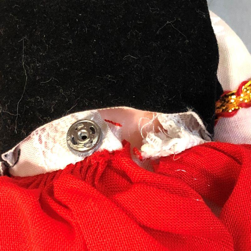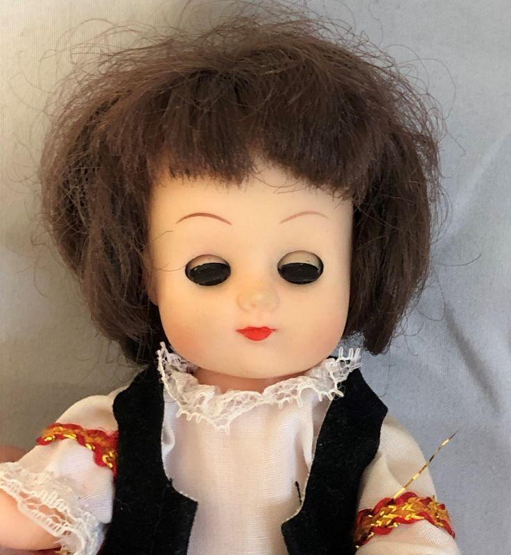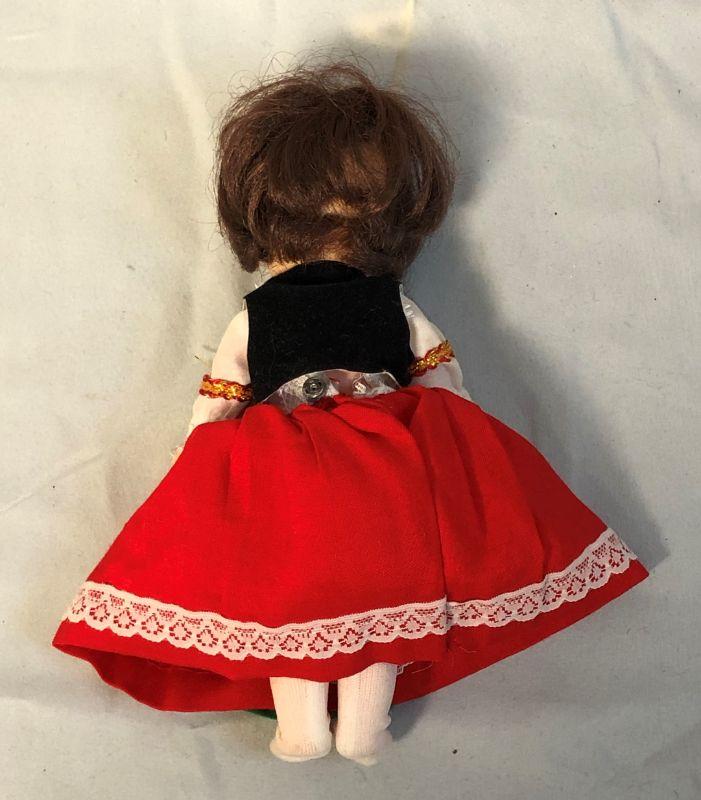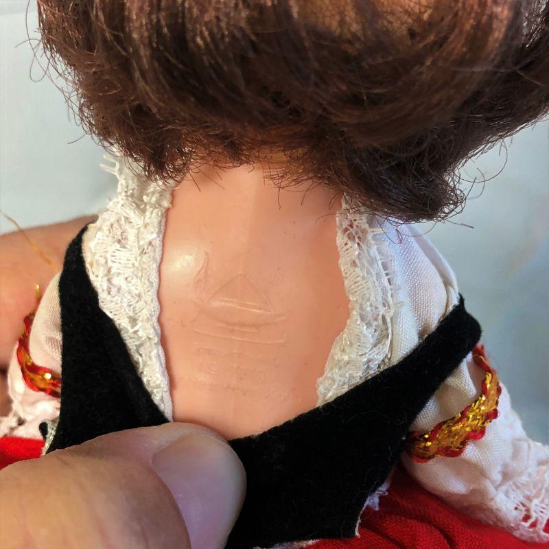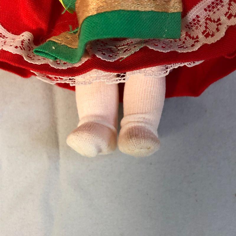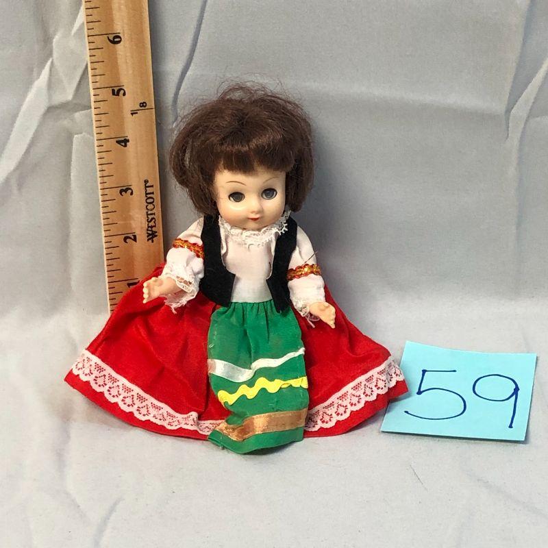 This doll was made in Hong Kong and is about 7" tall. Her eyes open and close and she has a plastic body with movement at the shoulders and hip. It appears that she is missing her shoes and while she has both parts of the snap, one is no longer attached to the skirt.