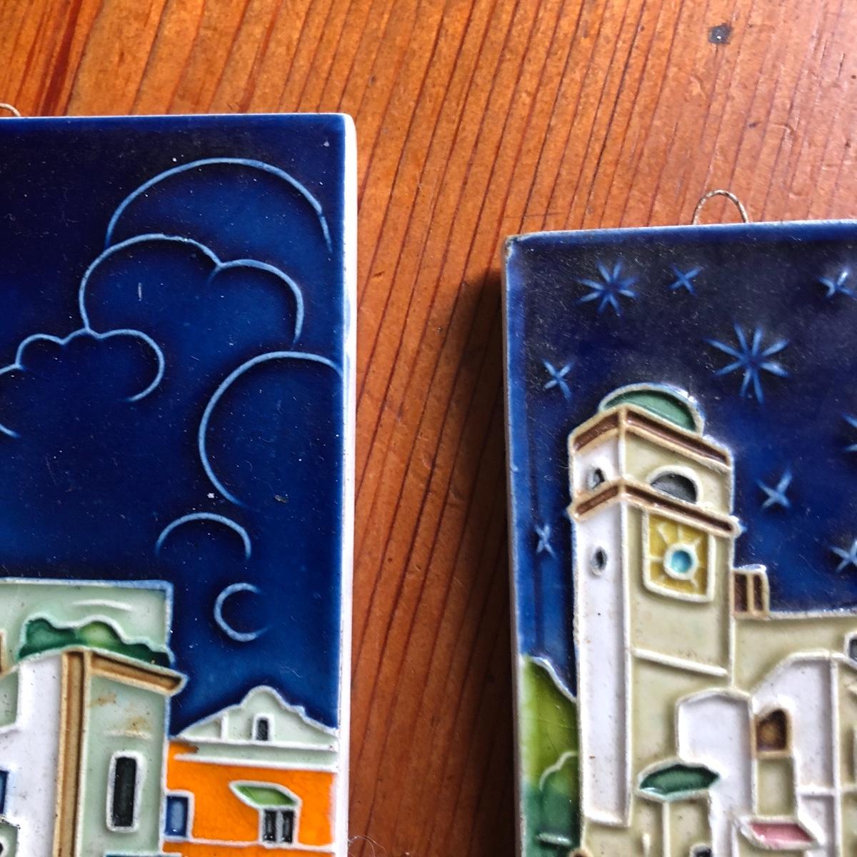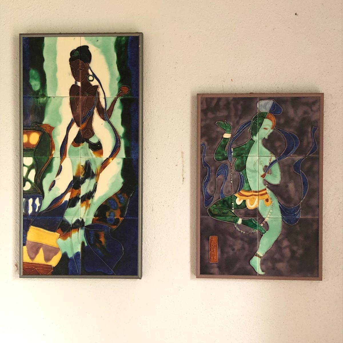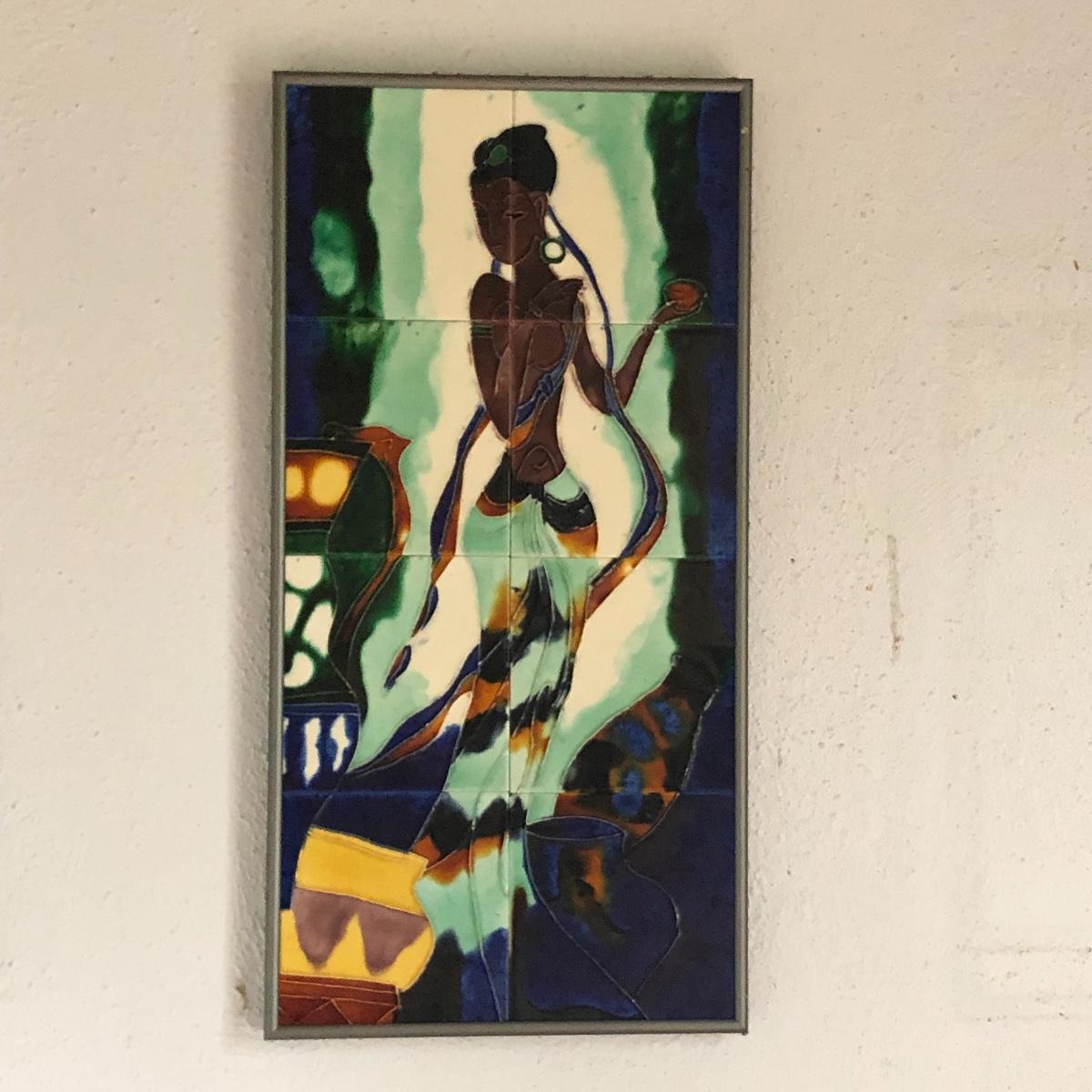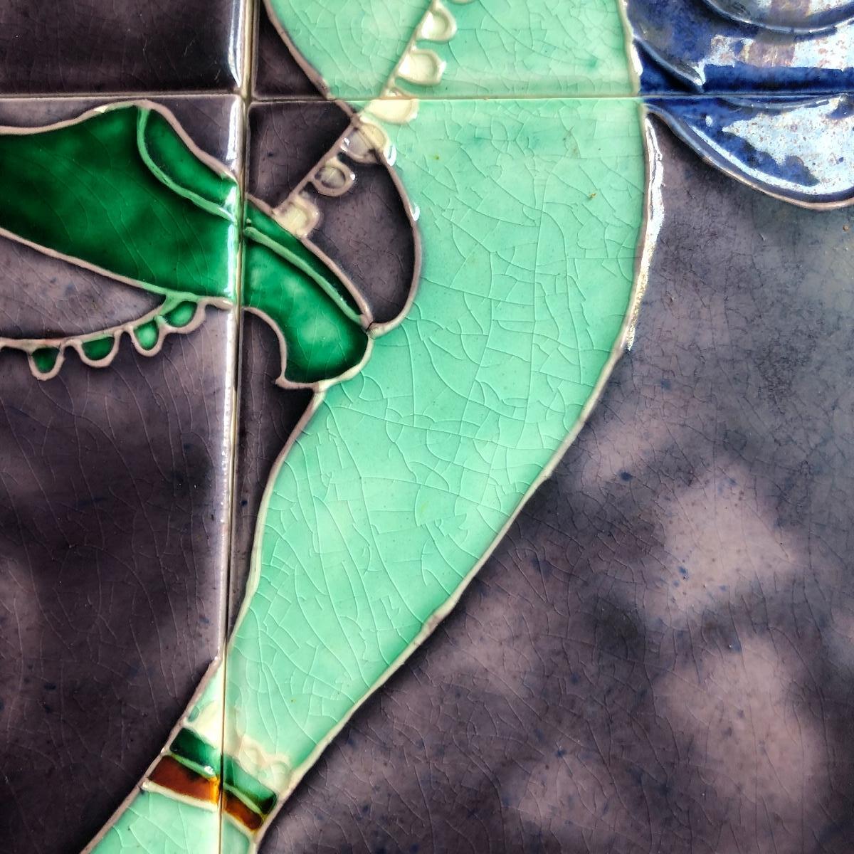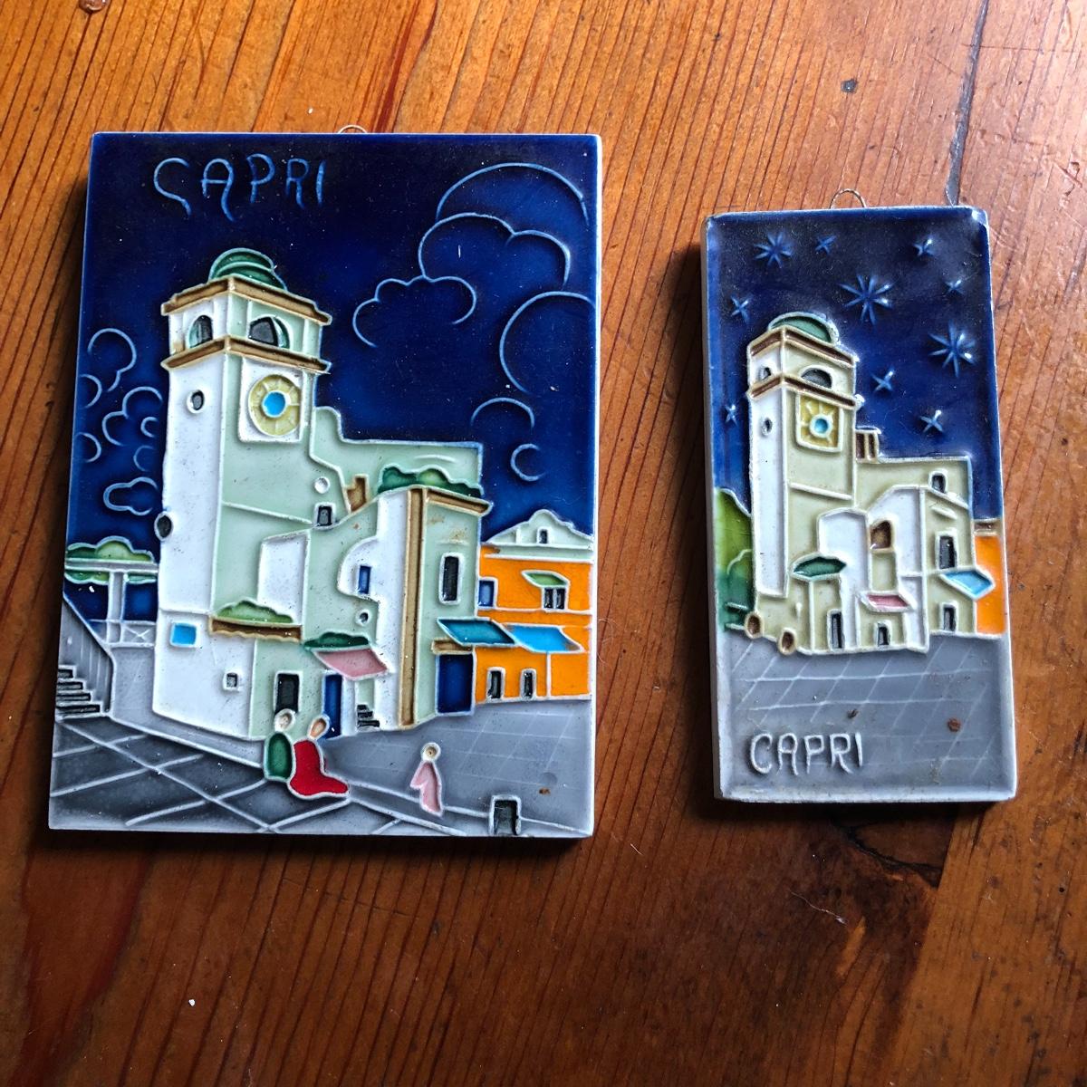 These two unique and colorful pieces of tile art are mounted in metal frames and compliment each other very well but can easily be stand alone pieces. Some crazing of the glaze has occurred over the years, see images. We have added two small Capri tiles as well.