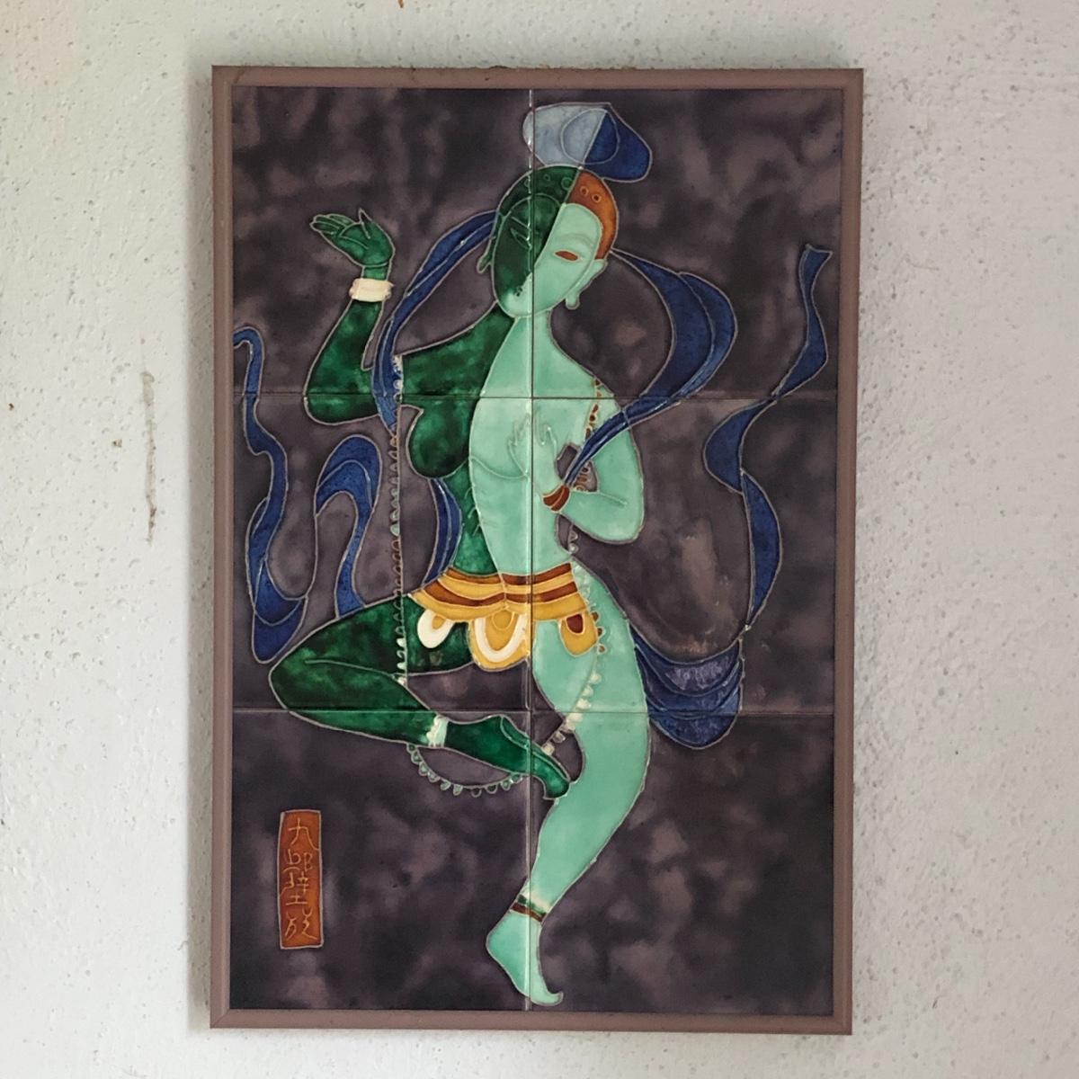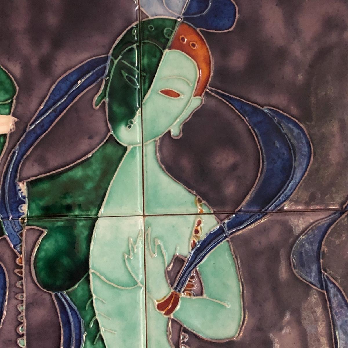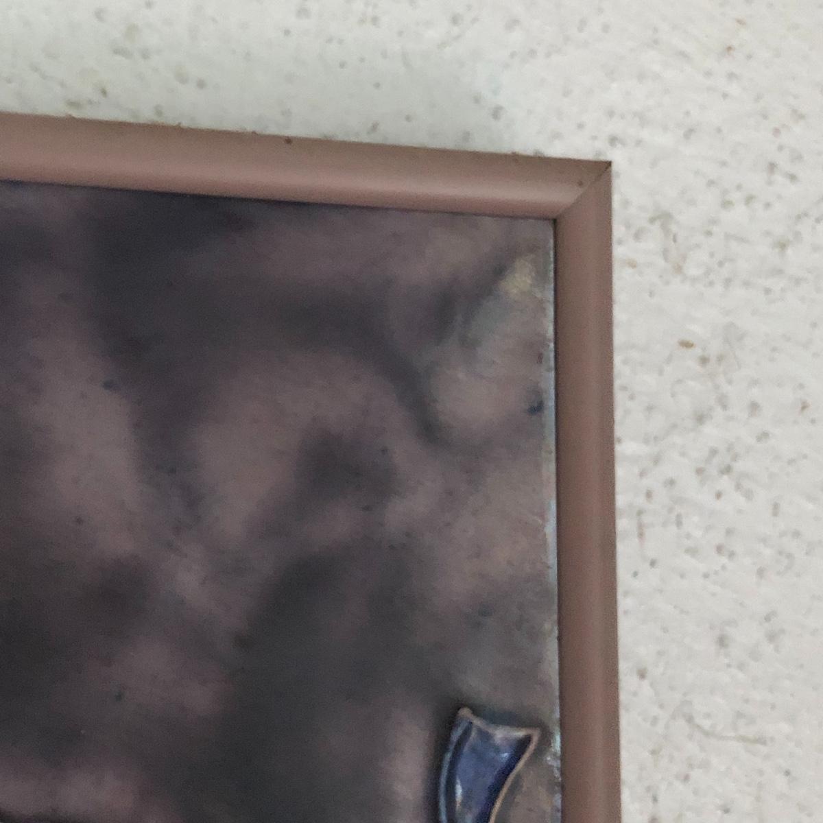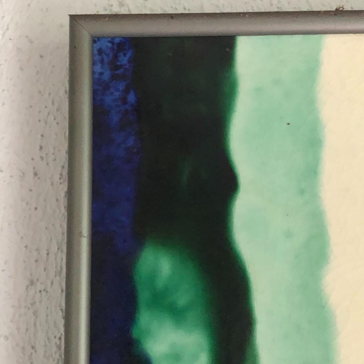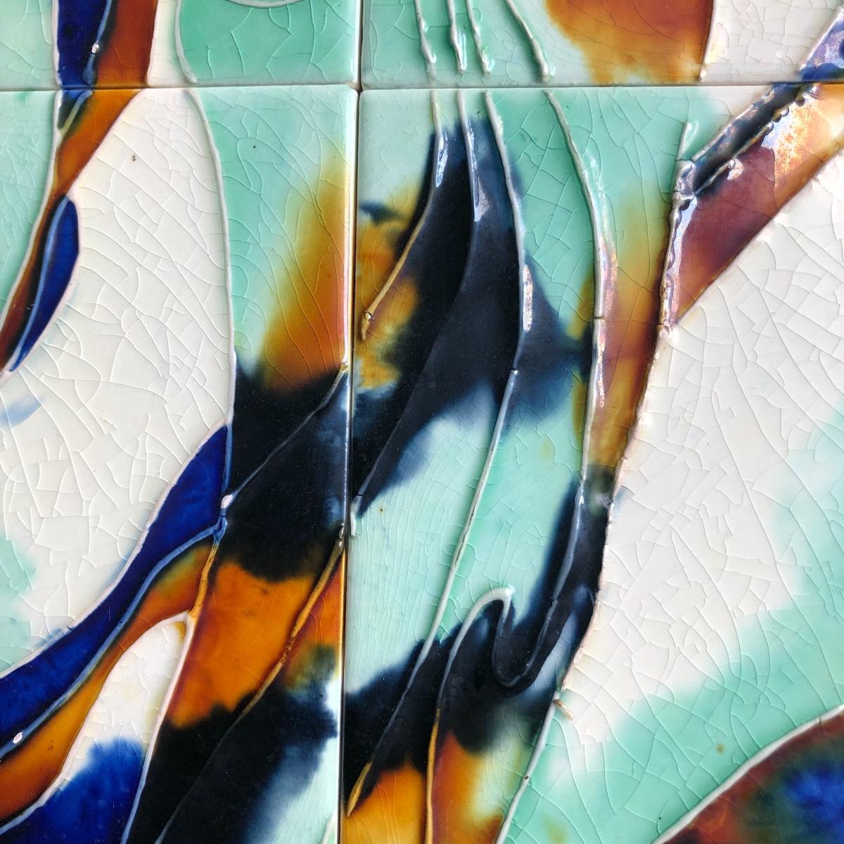 These two unique and colorful pieces of tile art are mounted in metal frames and compliment each other very well but can easily be stand alone pieces. Some crazing of the glaze has occurred over the years, see images. We have added two small Capri tiles as well.