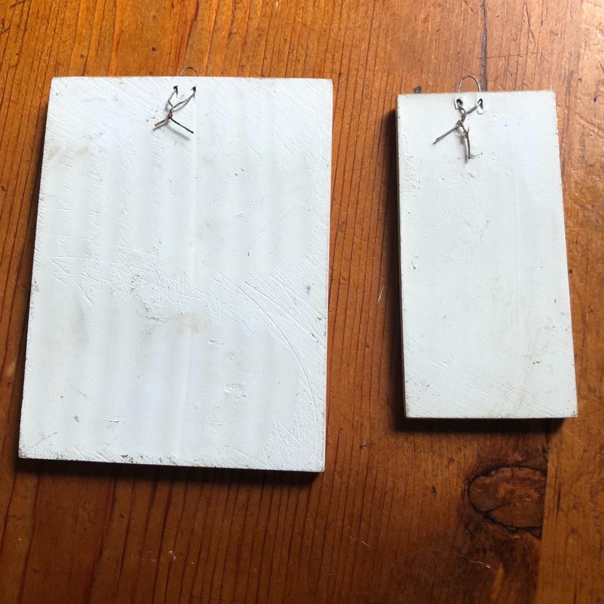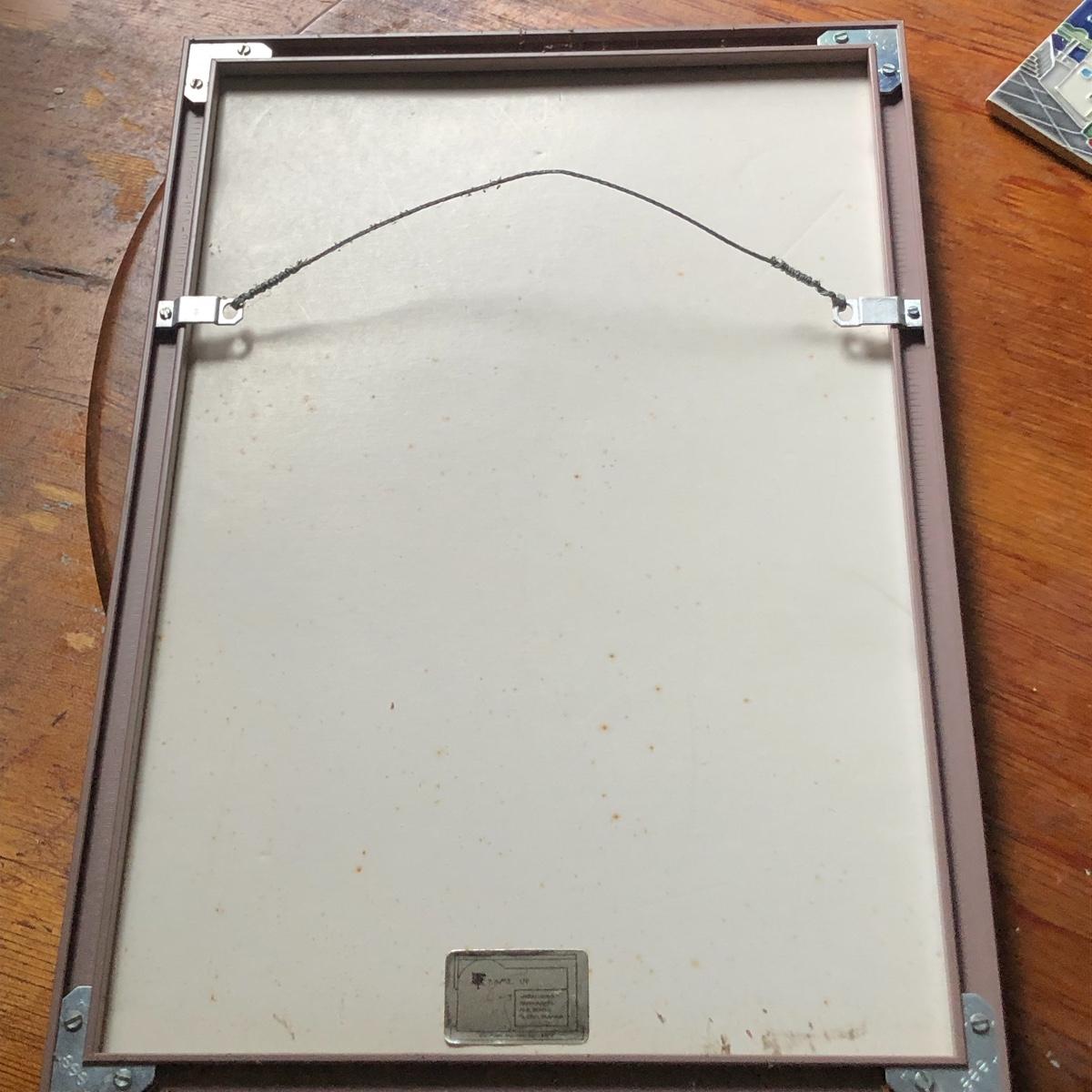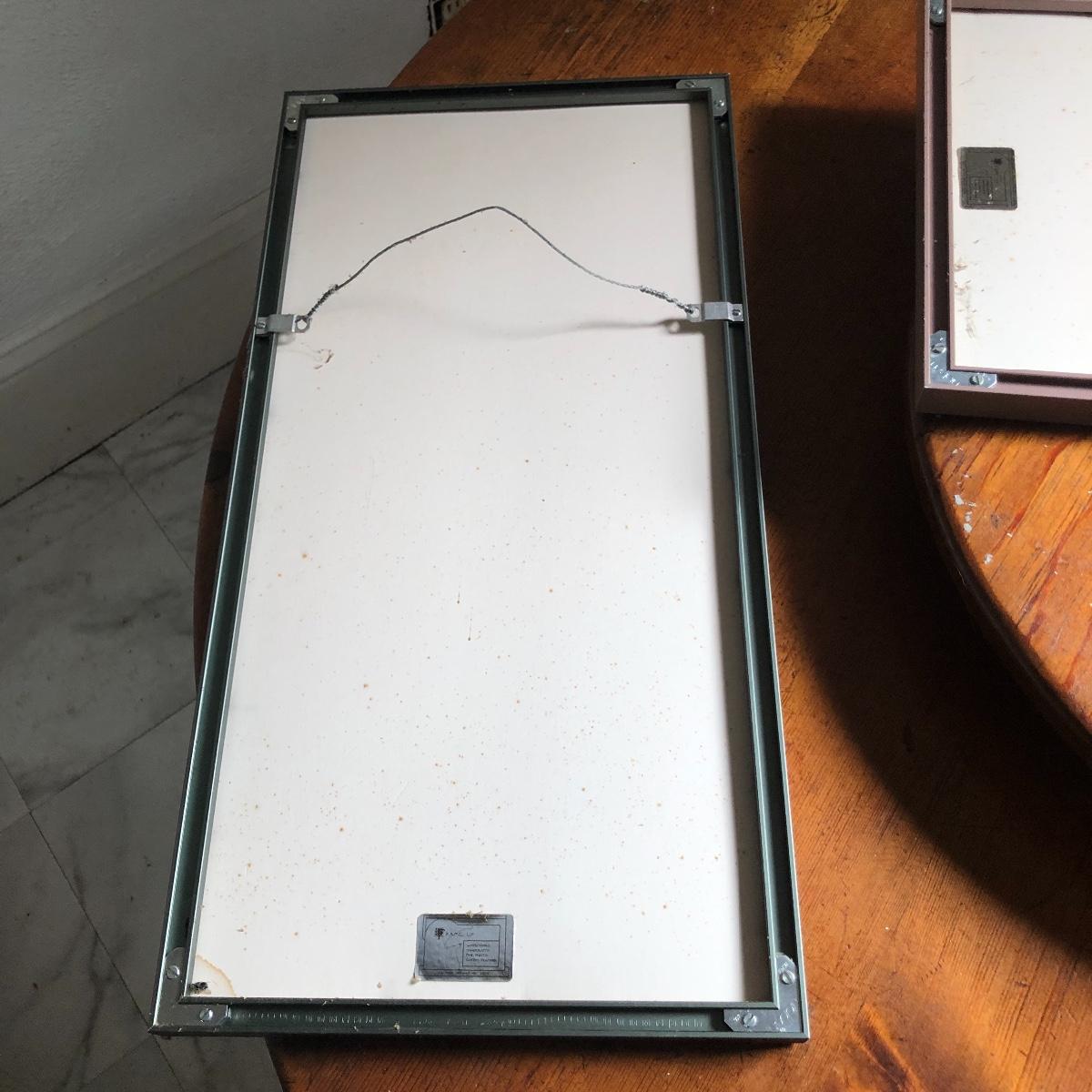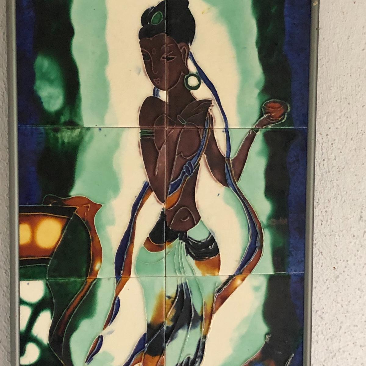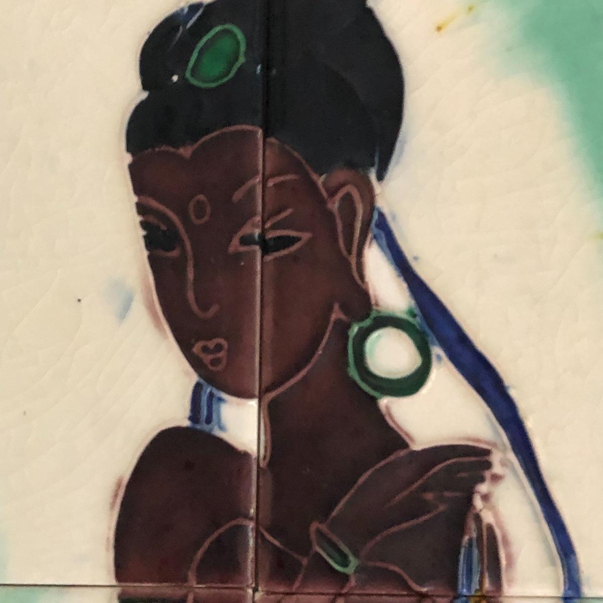 These two unique and colorful pieces of tile art are mounted in metal frames and compliment each other very well but can easily be stand alone pieces. Some crazing of the glaze has occurred over the years, see images. We have added two small Capri tiles as well.