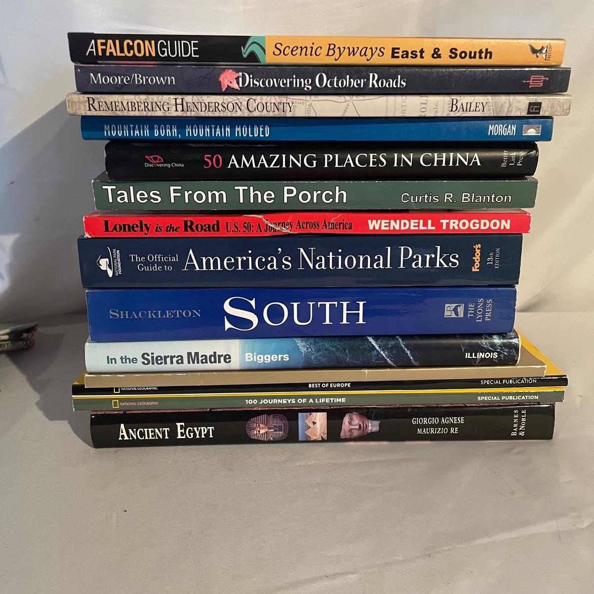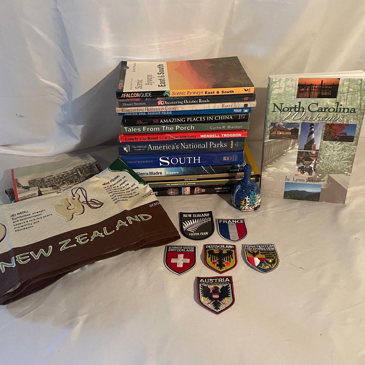 A good number of the travel books are for the U.S.with a few being International ones. Also included are travel memorabilia such as tea towels, a China bell and some sew on badges. A felt water bottle carrier with shoulder strap was added to this lot later; it has an embroidered camel and Machupicchu Cusco sewn on the front.