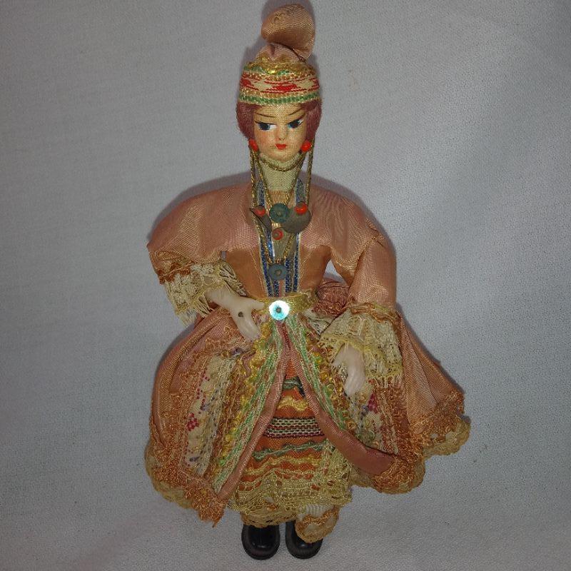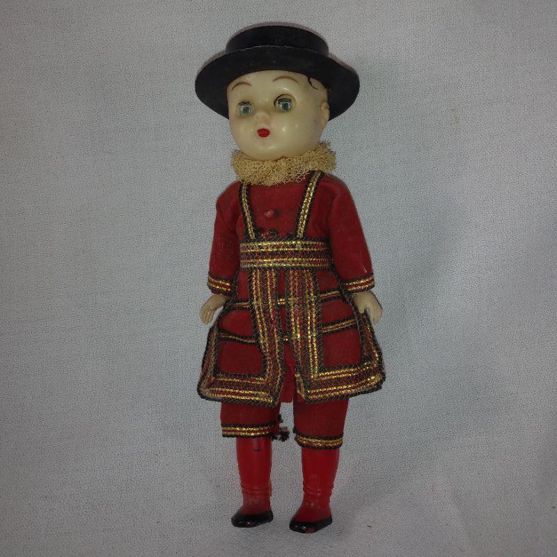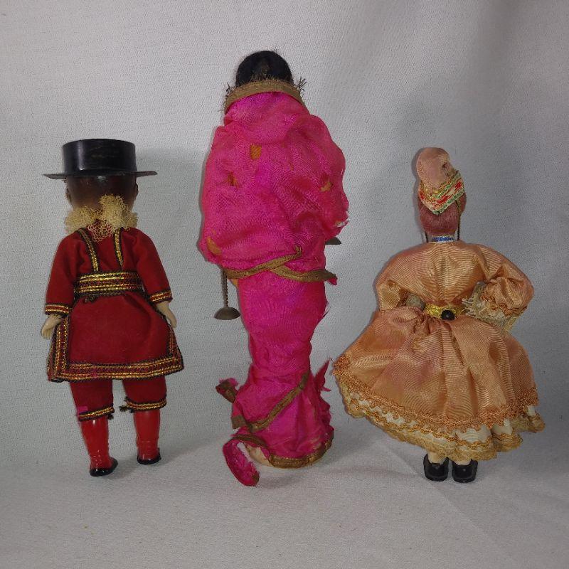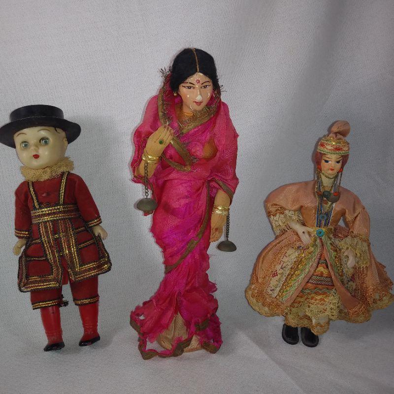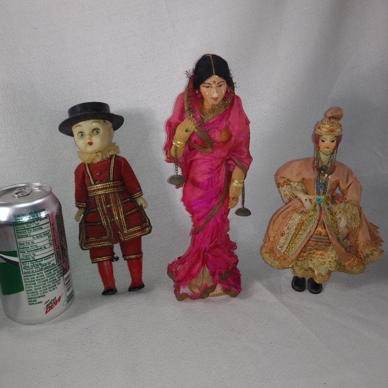 Set of 3 international vintage dolls. British looking doll is plastic, clothes are in very good condition. The Indian doll is very worn and the clothes are deteriorating due to age but the hair, jewelry and body is in good condition. The third doll looks to be Thai is in very good condition for age. Seems to be mixed material of plastic and paper mold? Clothes look great. Dolls are 7 1/2-inches, 9-inches and 7-inches tall.