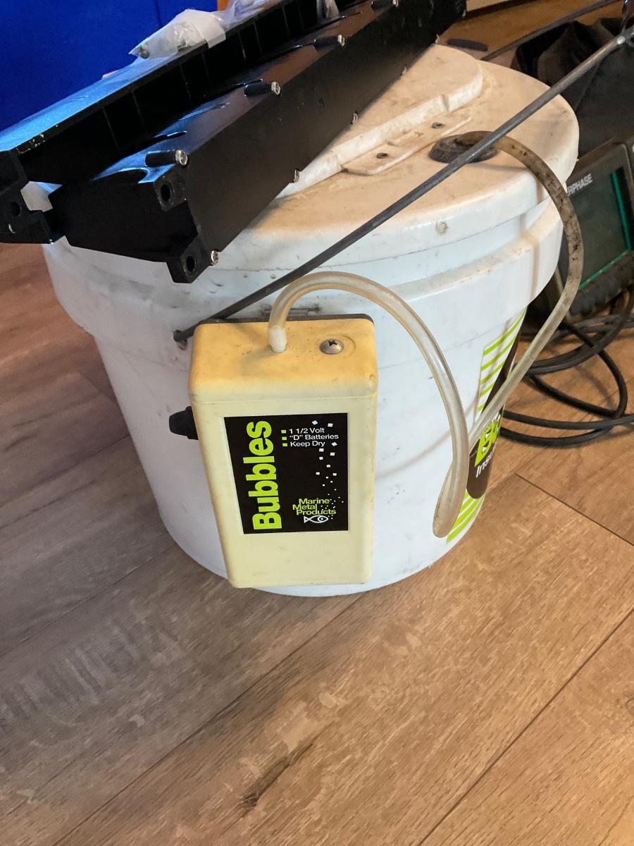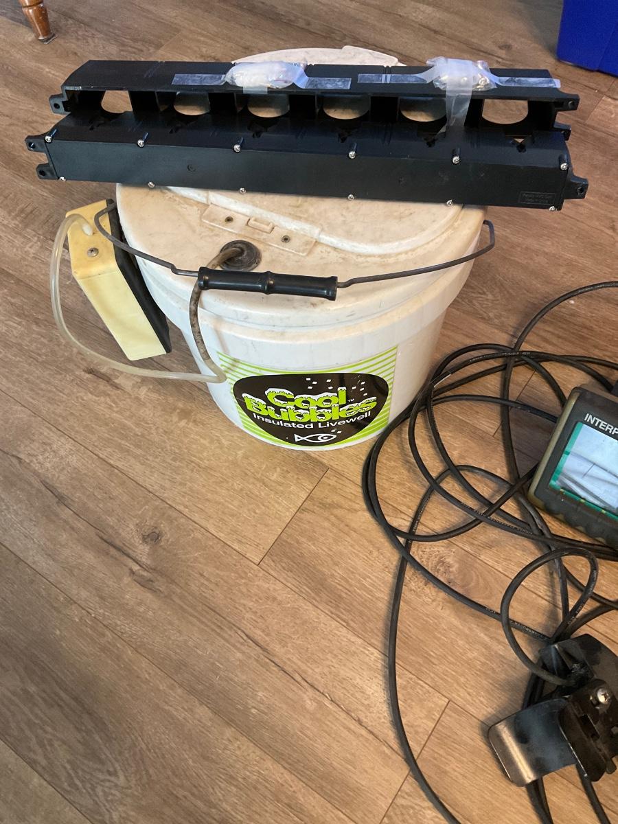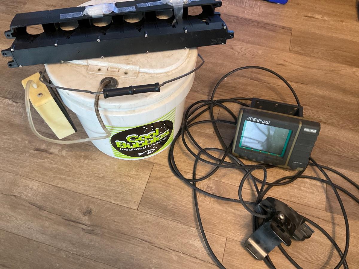 Interphase fish finder, cool bubbles bucket and black fishing pole shelving hardware