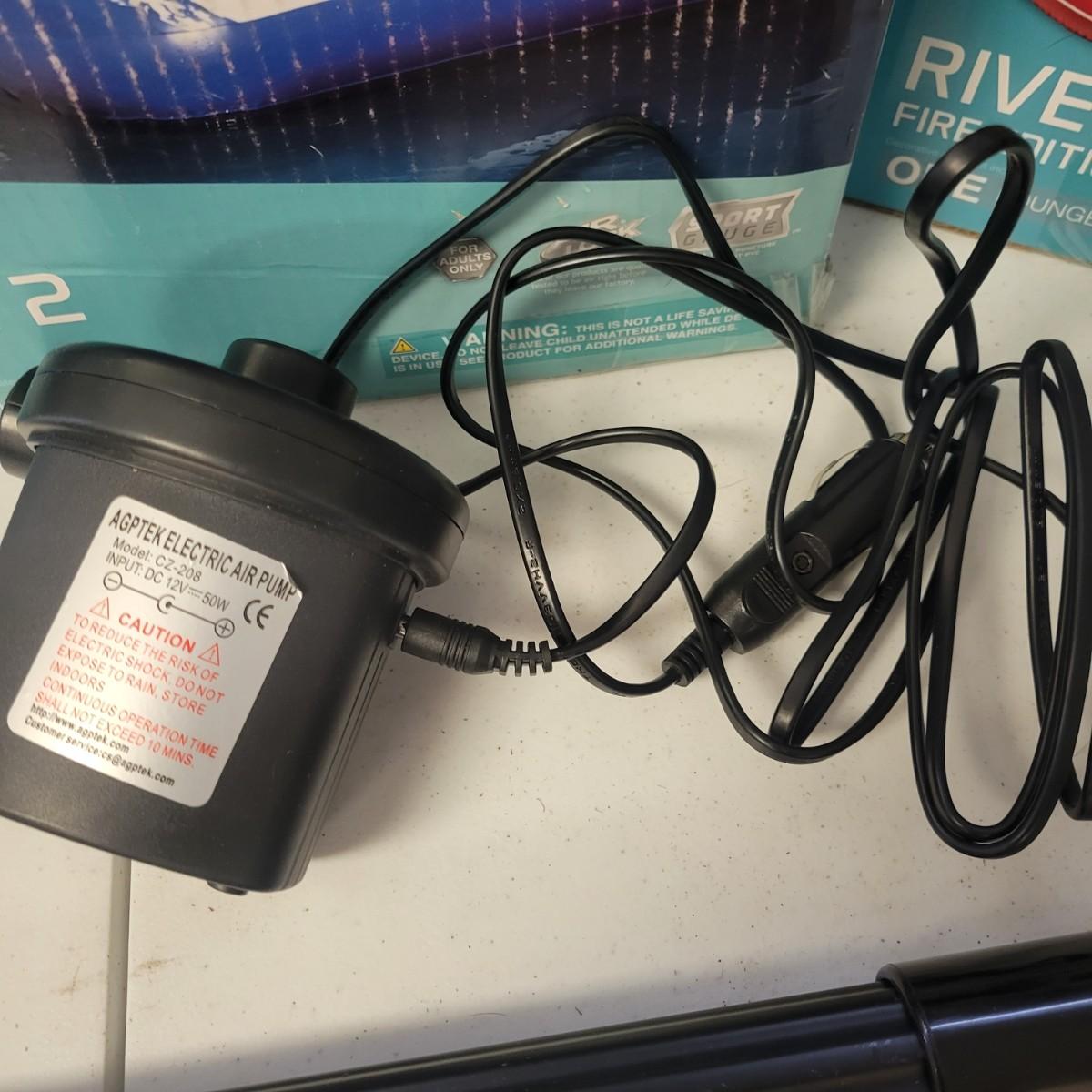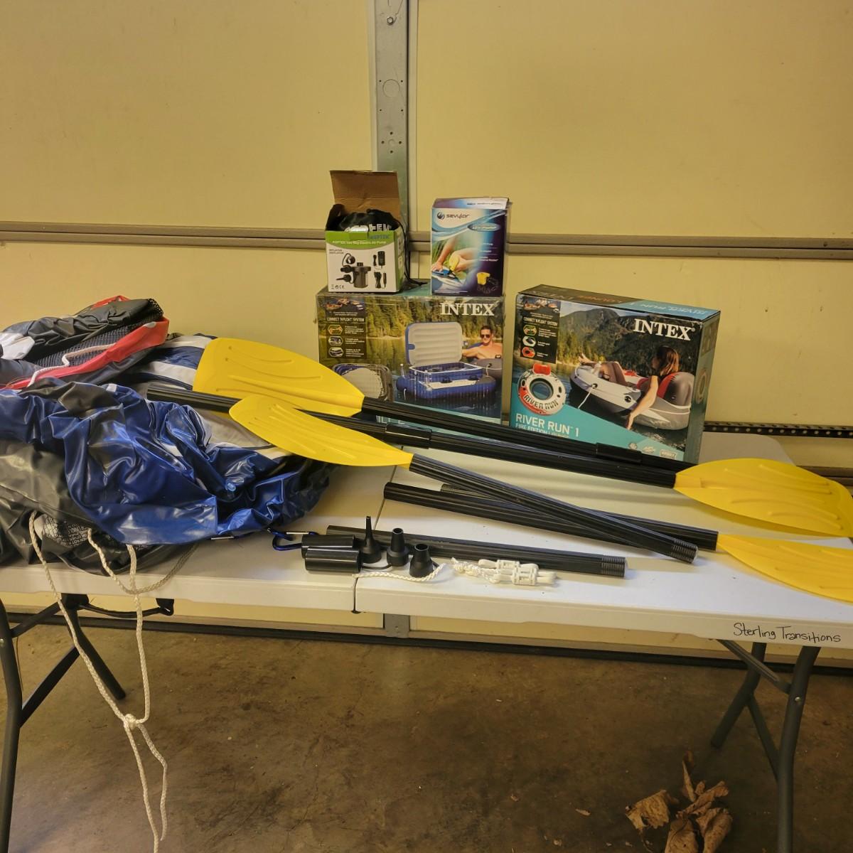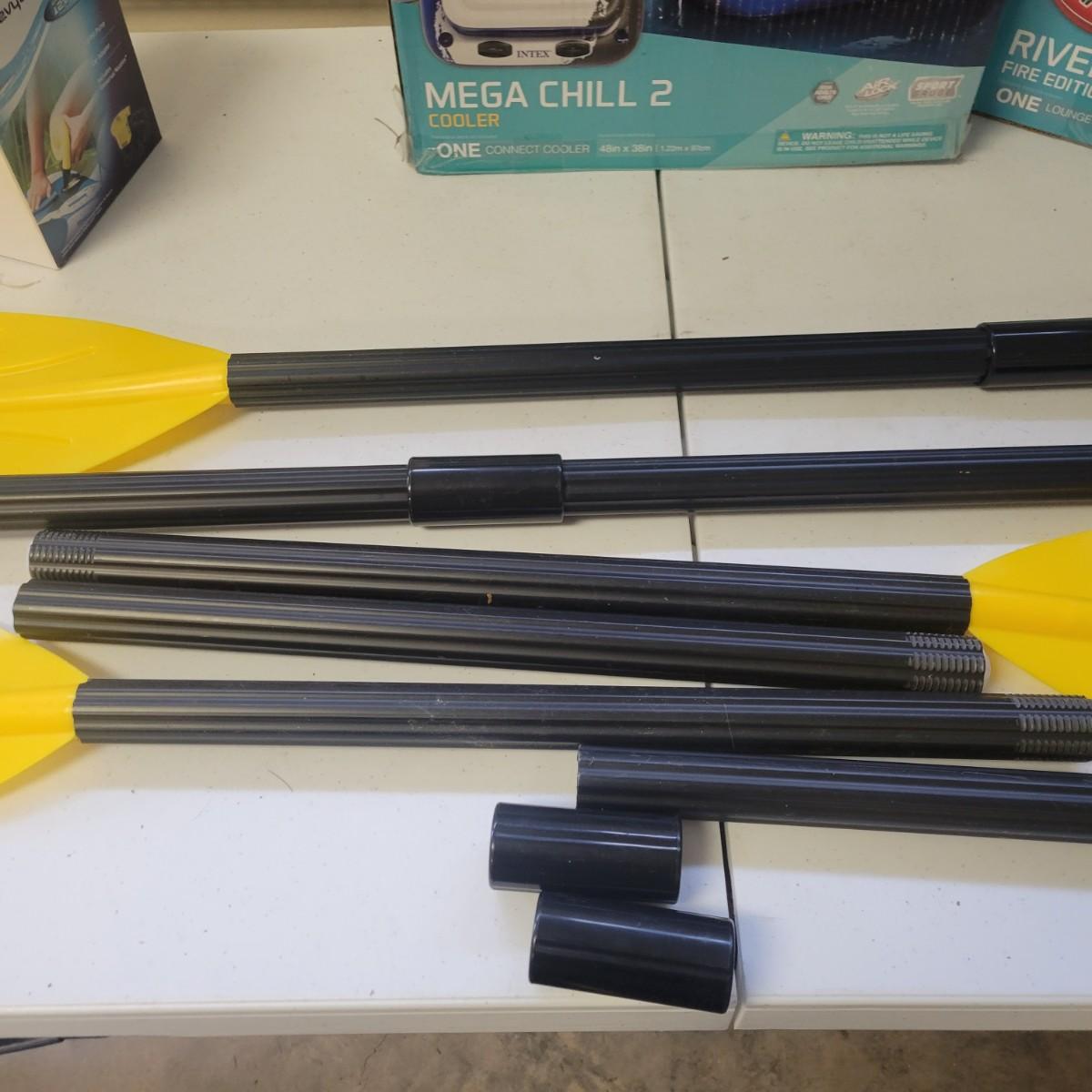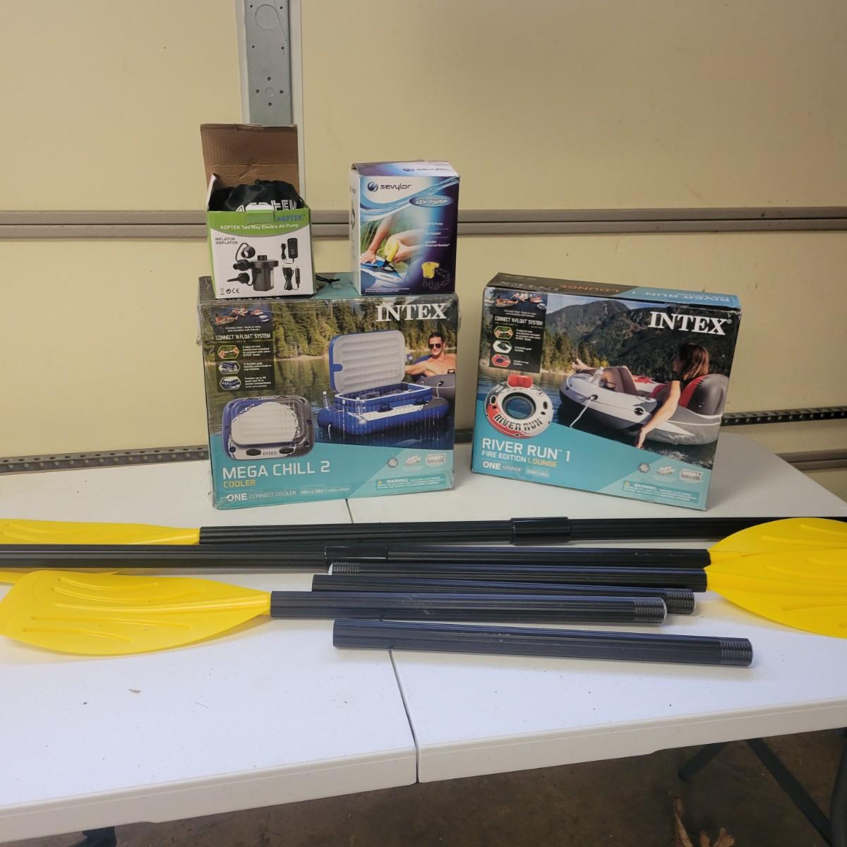 An assortment of float tubes and accessories in good to excellent condition. This lot includes four paddles that break down to two pieces for convenient storage, multiple quick releases to connect tubes together. Two air pumps with car power adapters, one is in an unopened box. Four inflatable float tubes are included, one is in an unopened box and the other three look very lightly used. An inflatable cooler finishes this lot out in style. It features a lid, drink holders and handles. Local pickup only