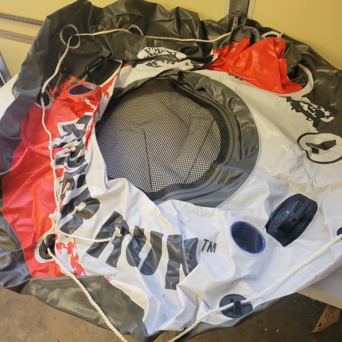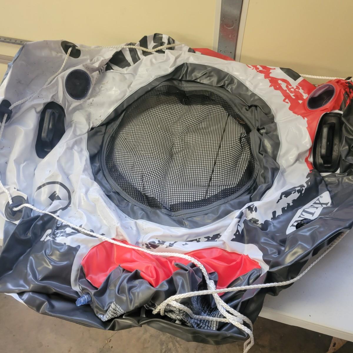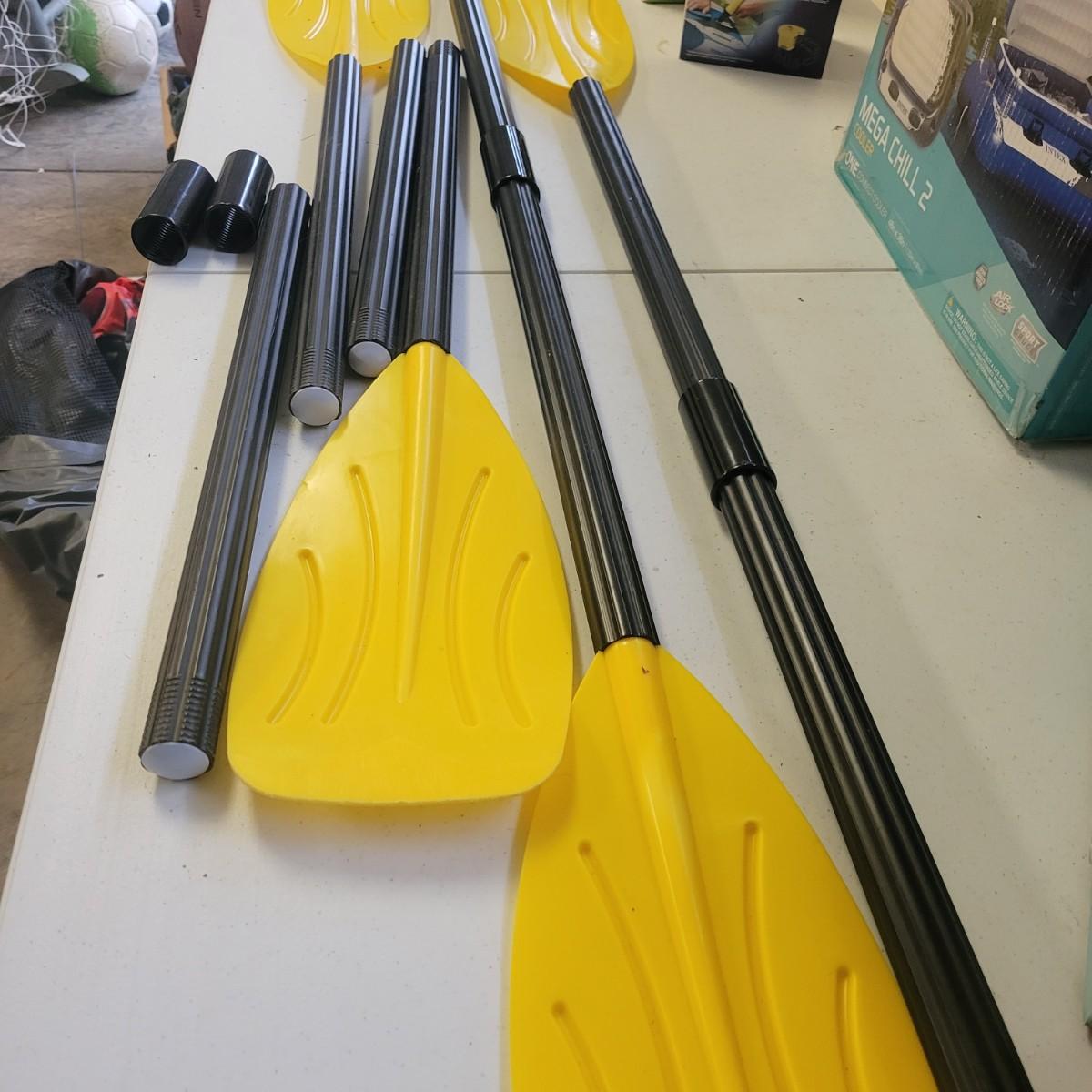 An assortment of float tubes and accessories in good to excellent condition. This lot includes four paddles that break down to two pieces for convenient storage, multiple quick releases to connect tubes together. Two air pumps with car power adapters, one is in an unopened box. Four inflatable float tubes are included, one is in an unopened box and the other three look very lightly used. An inflatable cooler finishes this lot out in style. It features a lid, drink holders and handles. Local pickup only