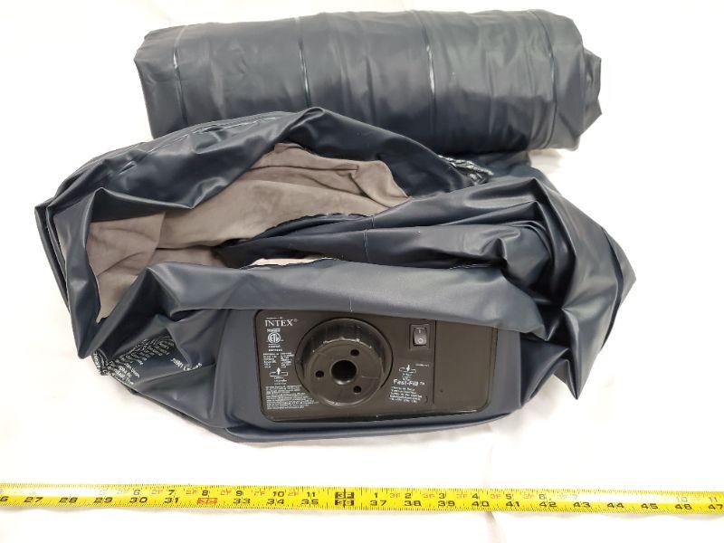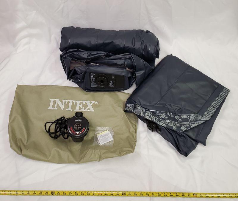 Great items for the upcoming camping season! 2 inflatable mattresses, one is a twin and the other is a full I believe...both have a soft gray lining on the top...untested but seem to be in good condition. Intex quick fill air pump included, turned on and works. Also included in this lot, Intex travel bag and patch kit.