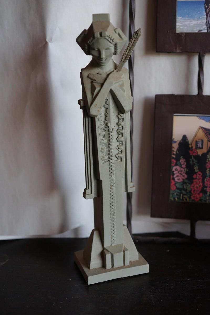 a very interesting grouping especially for the prarie or arts crafts style home There is a plaster statue in the FLW style that has an olive green finish.