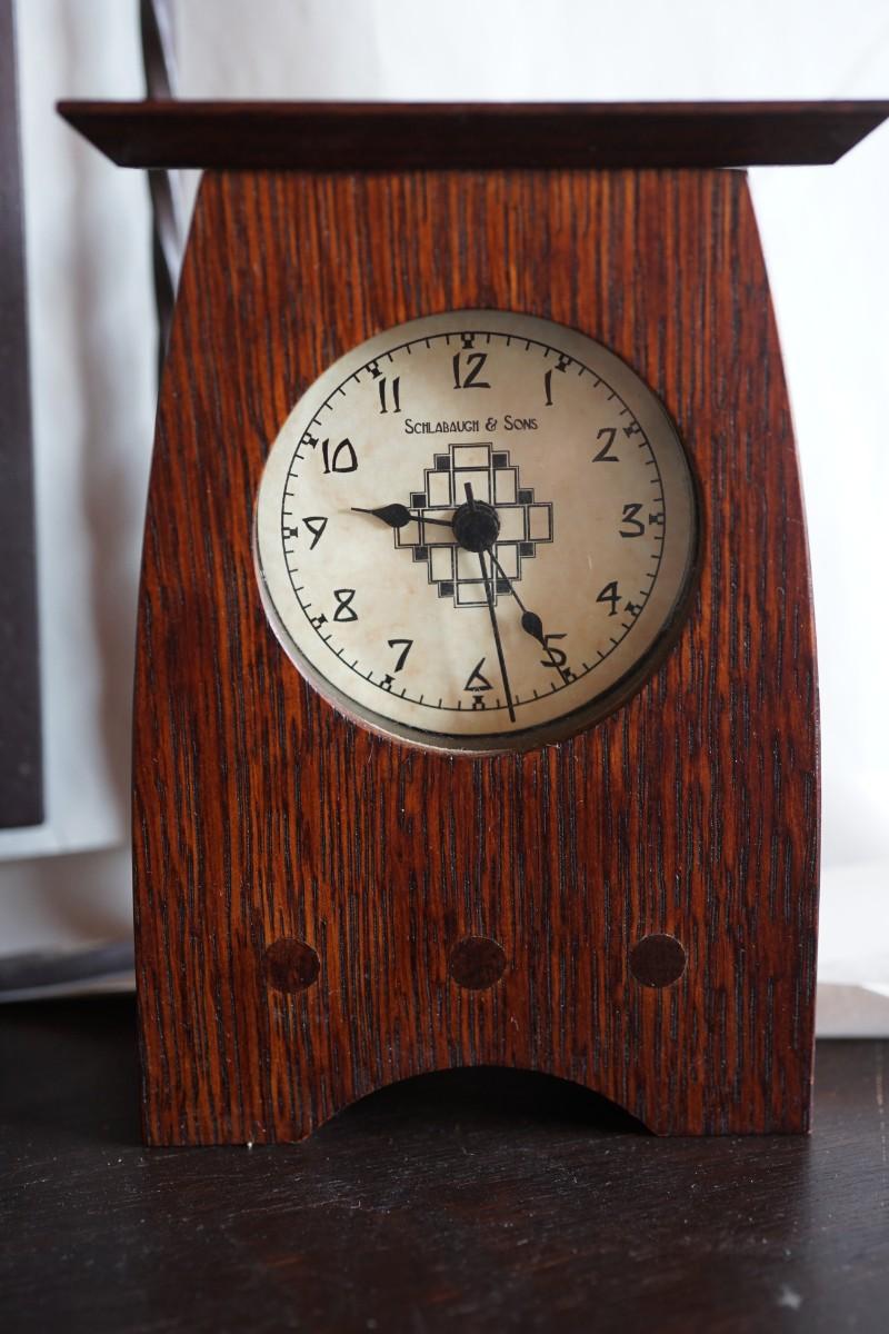 the clock is I believe from the Motowi tile factory which also made Arts and Crafts style products such as this quarter sawn oak craftsman style table clock.