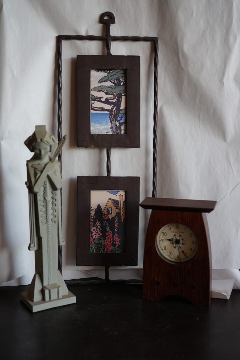 INTHE PRAIRIE STYLE. TWO FRAMED PAPER PRINTS IN BLACK FRAMES WITH WROUGHT IRON HANGER. FLW STYLE STATURE OF 8" & CLOCK FROM THE MOTOWI FACTORY