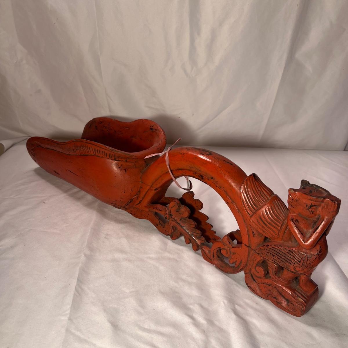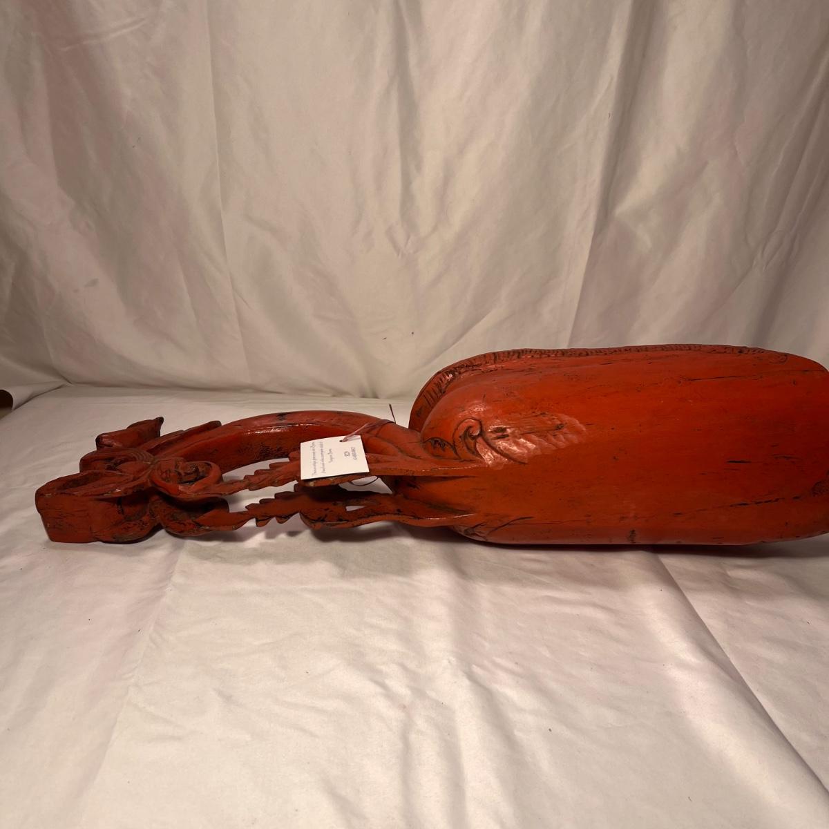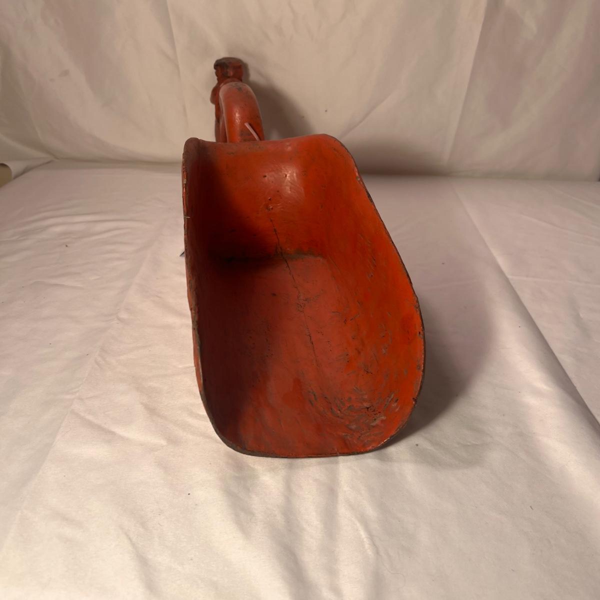 This beautiful wooden grain scoop is fairly lightweight and has a label that states it is from Burma, see pics. It is wood painted a traditional red color purported to bring good luck.