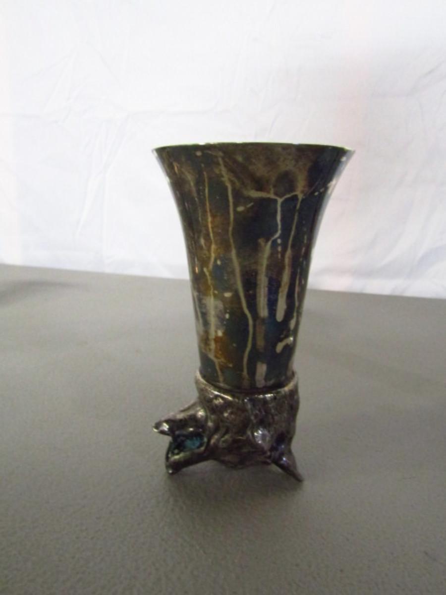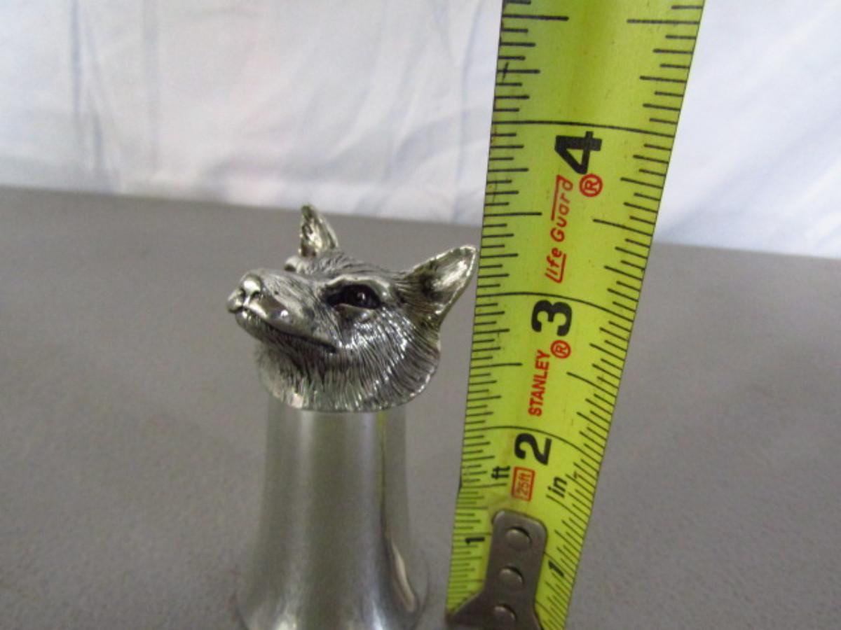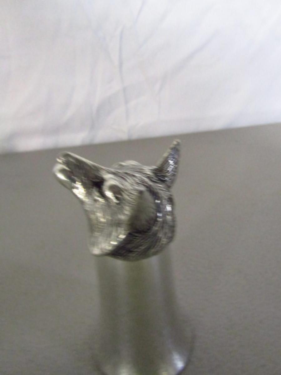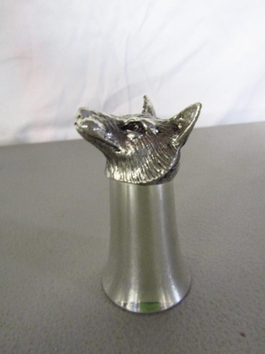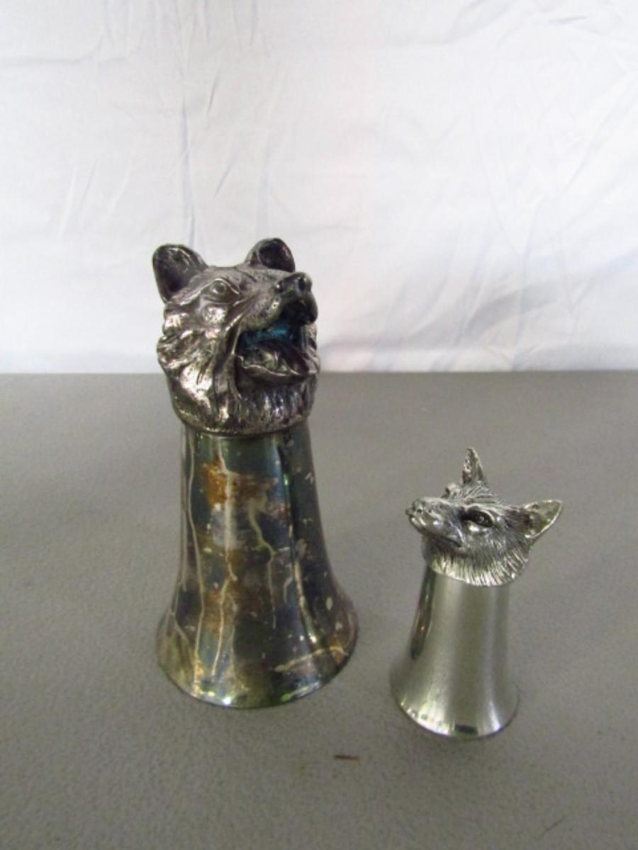 Intriguing Pair of Stirrup Cups- Wolf and Fox. Maker unknown, Silver-tone, need polishing. Wolf is over 5 1/2" tall. Fox is small, jigger size- (Approx. 3 1/4")