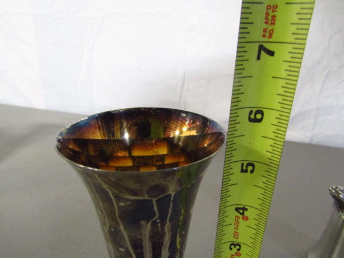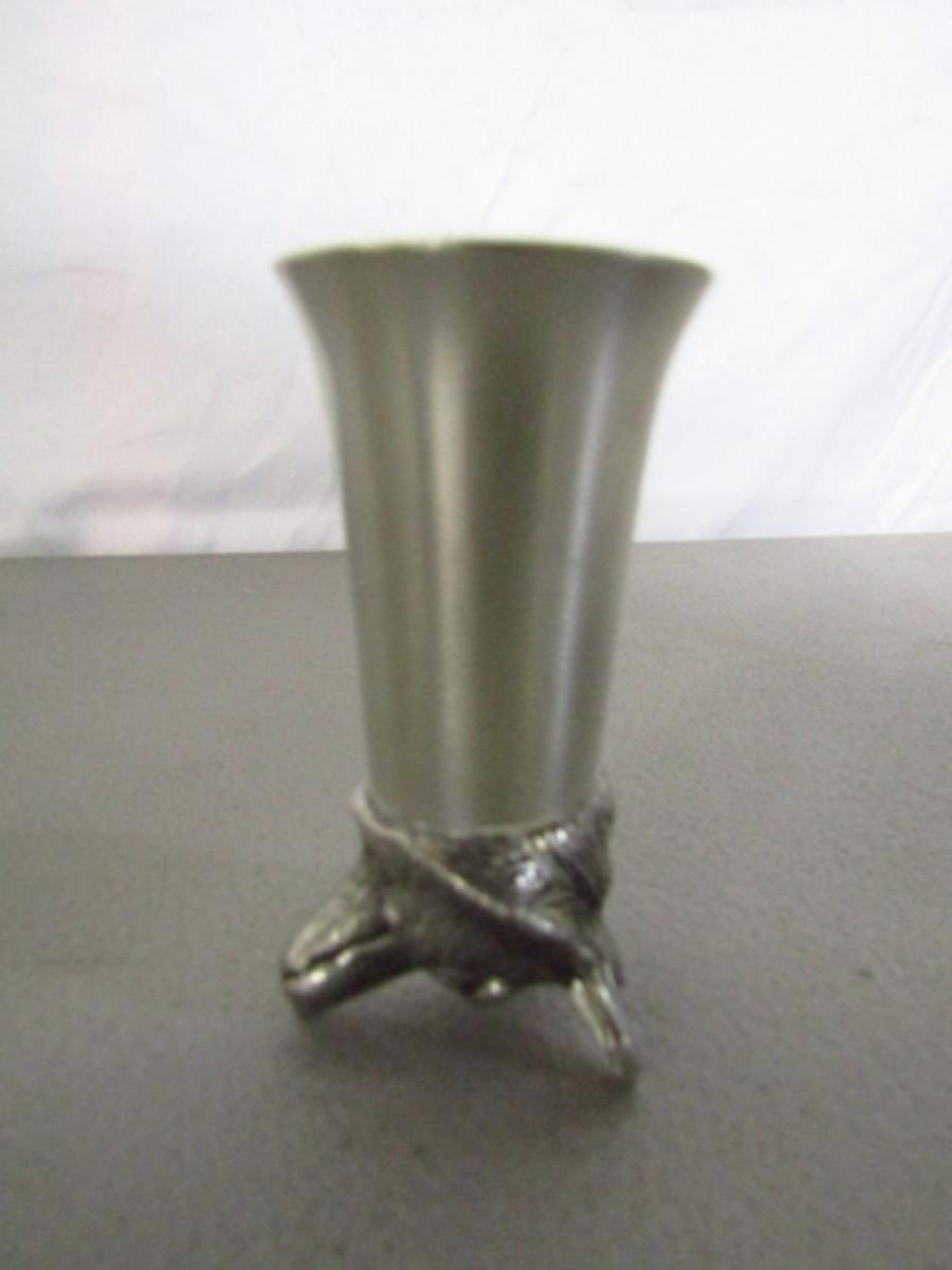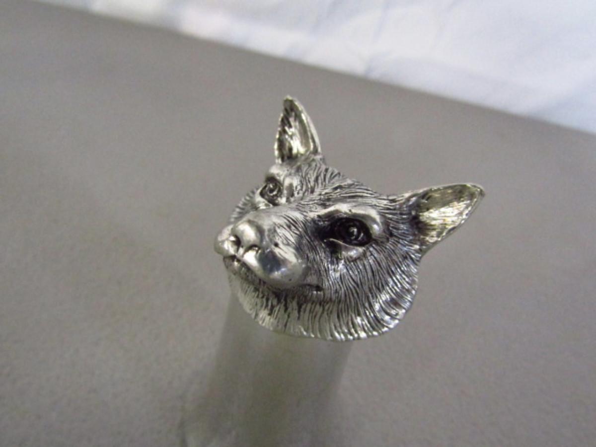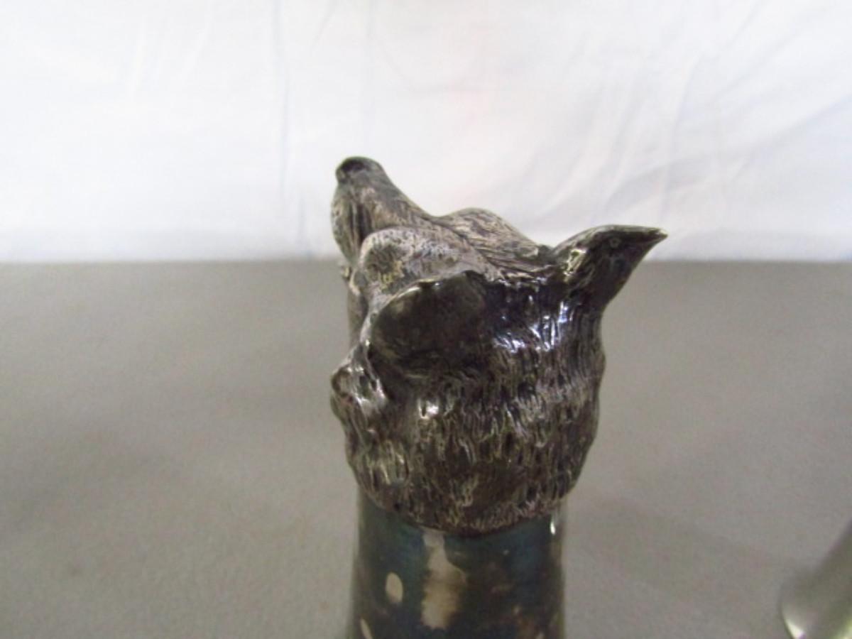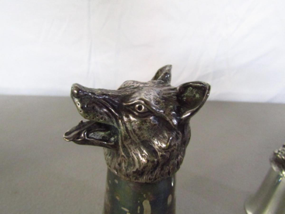 Intriguing Pair of Stirrup Cups- Wolf and Fox. Maker unknown, Silver-tone, need polishing. Wolf is over 5 1/2" tall. Fox is small, jigger size- (Approx. 3 1/4")