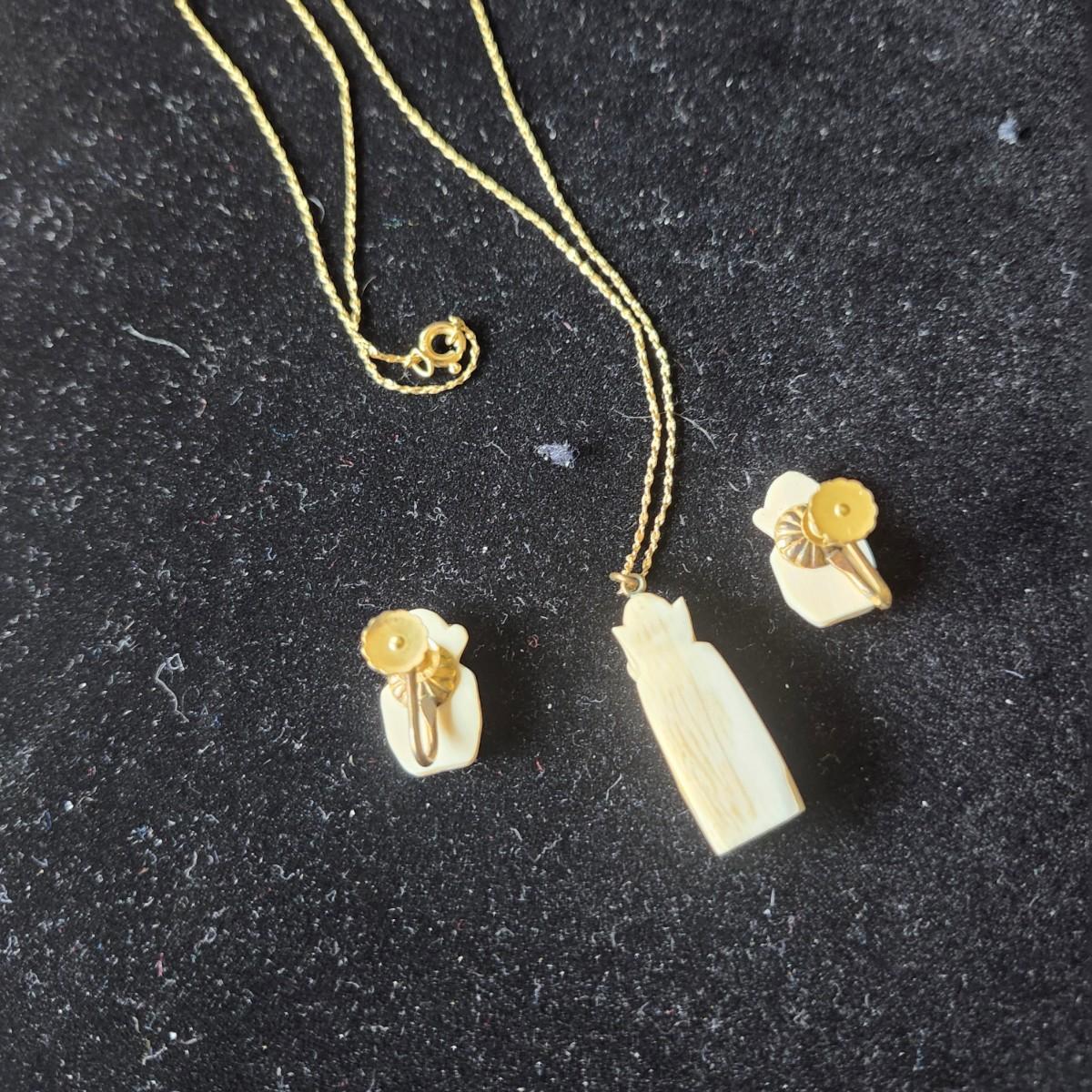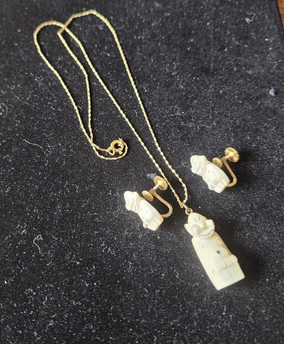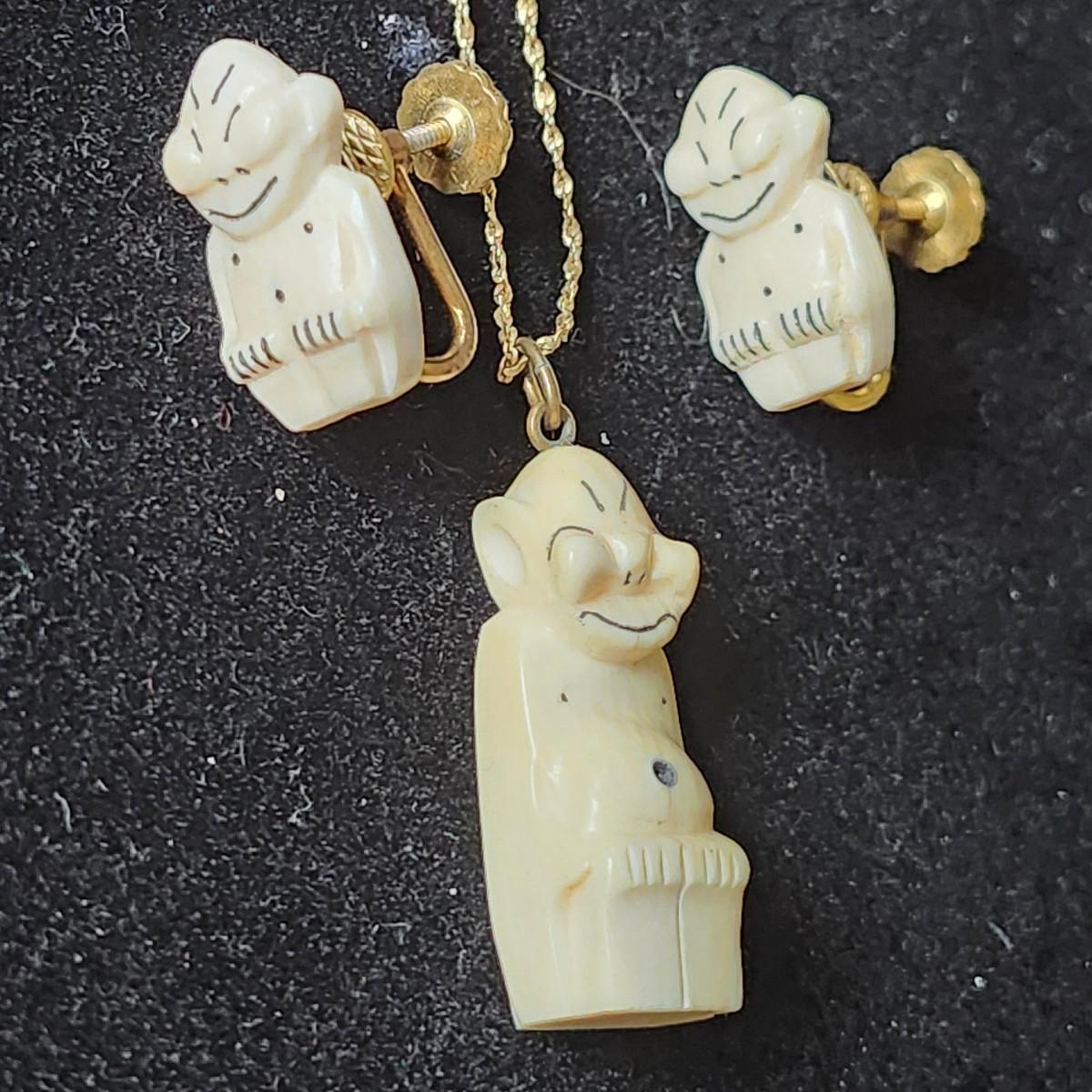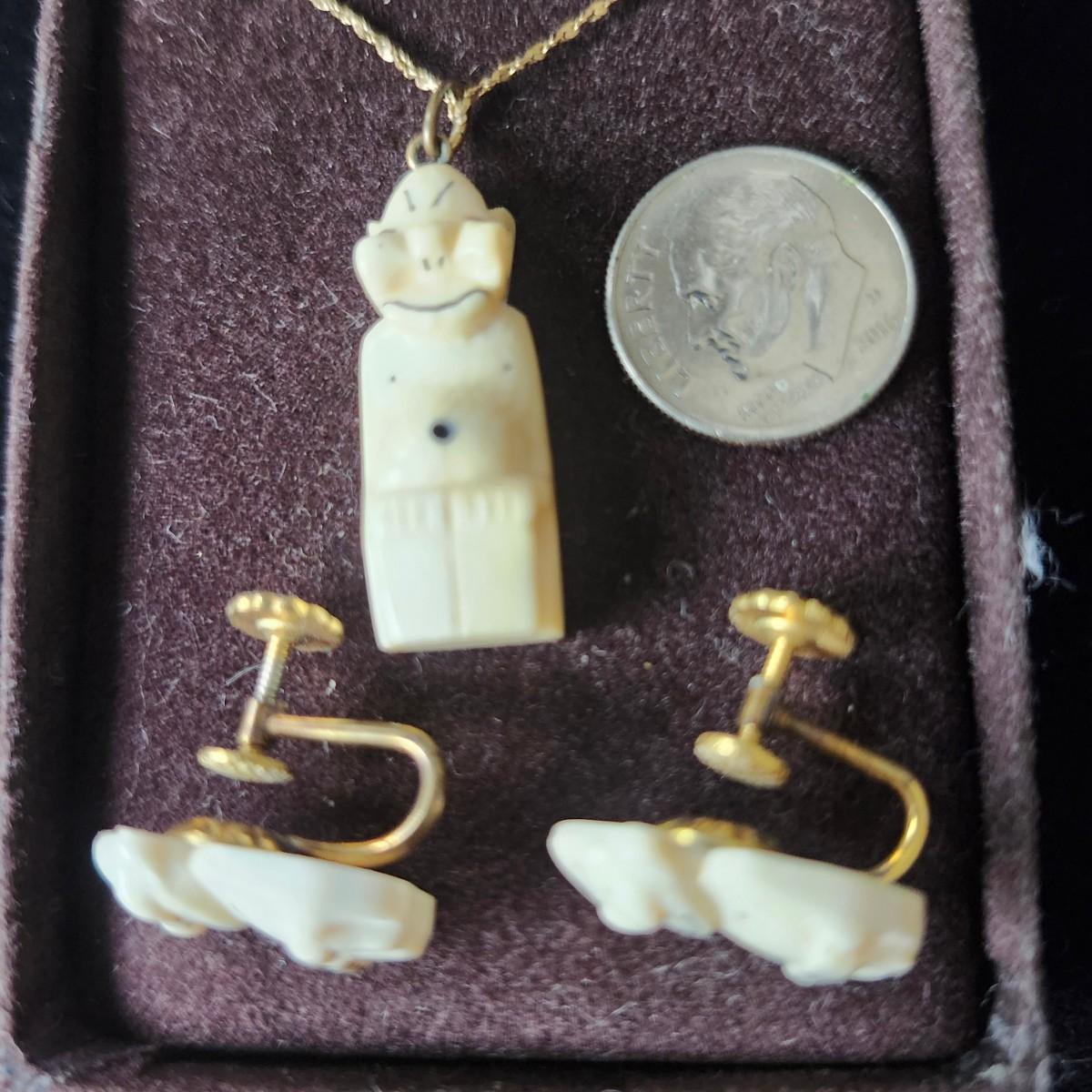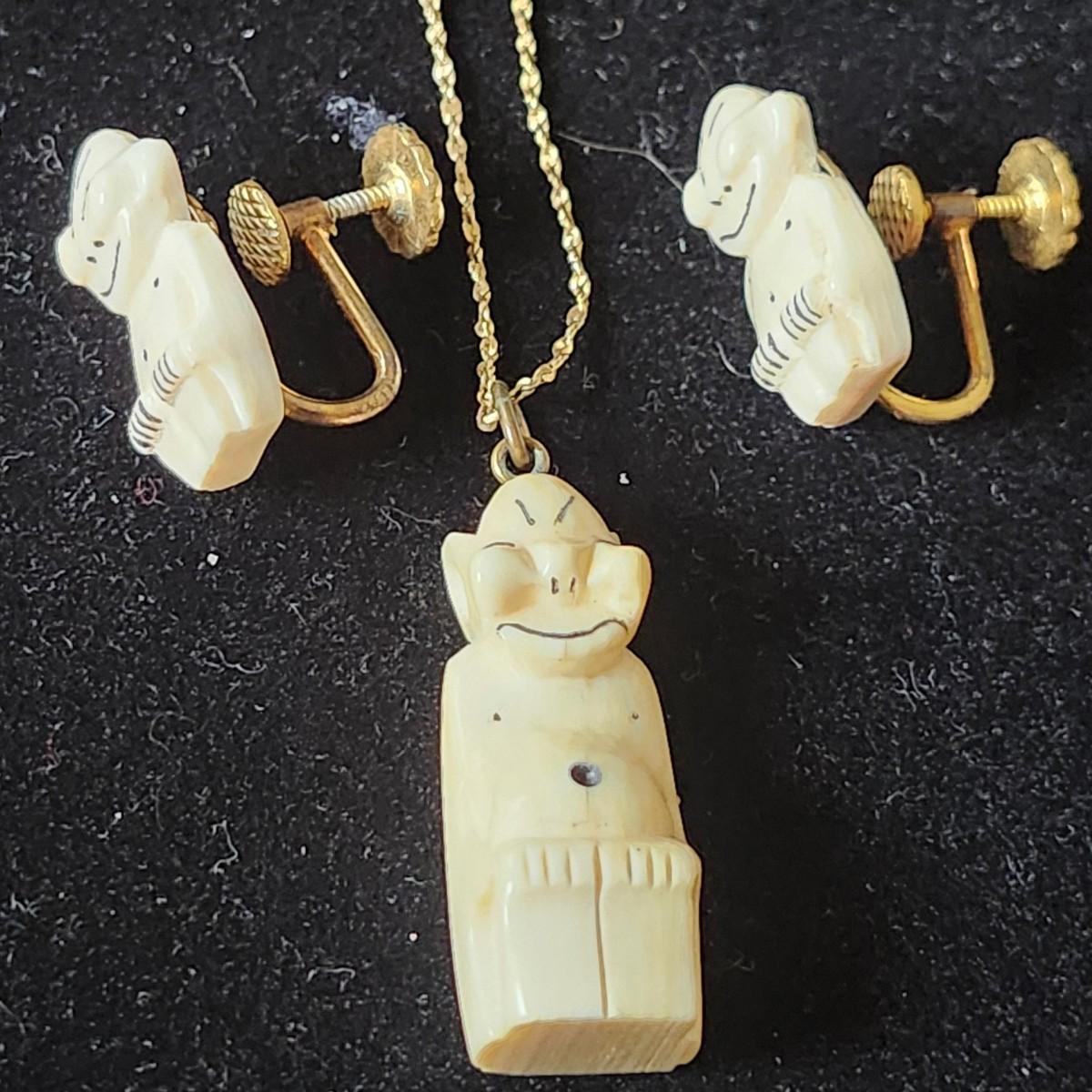 Tooth amulet and earrings carved in the Billiken charm. The pendant has an 18" chain, the earrings are screwback.