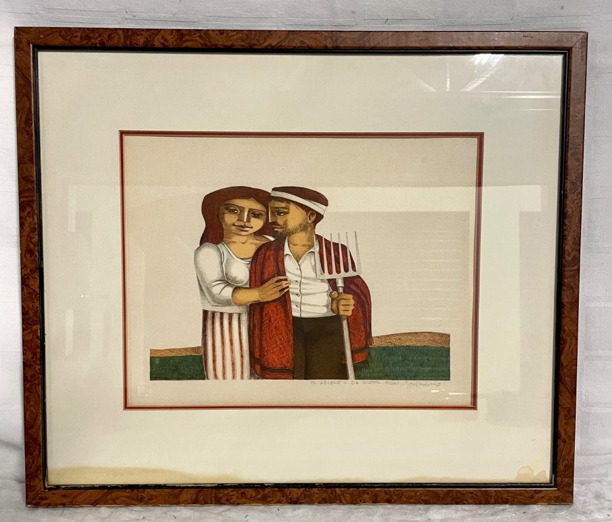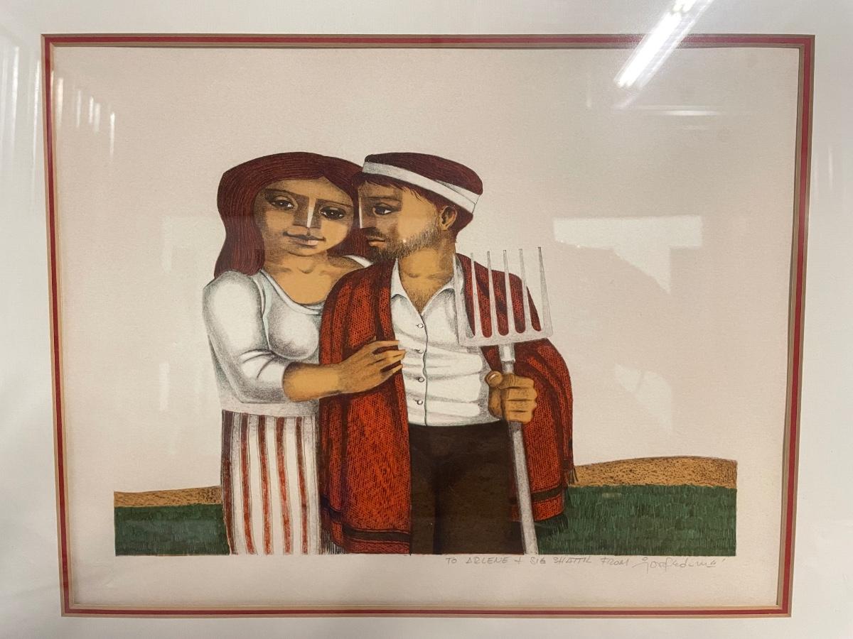 INV #133: Red and White dressed farming couple, signed, H 10" x W 13"