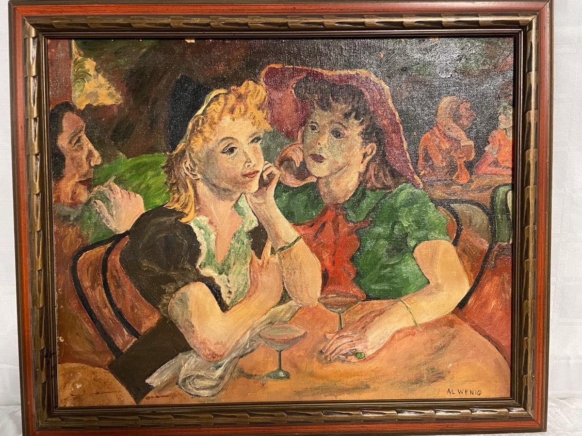 INV #46: Al Wenig painting, two women at cocktail table, H 15.5" x W 19.5"
