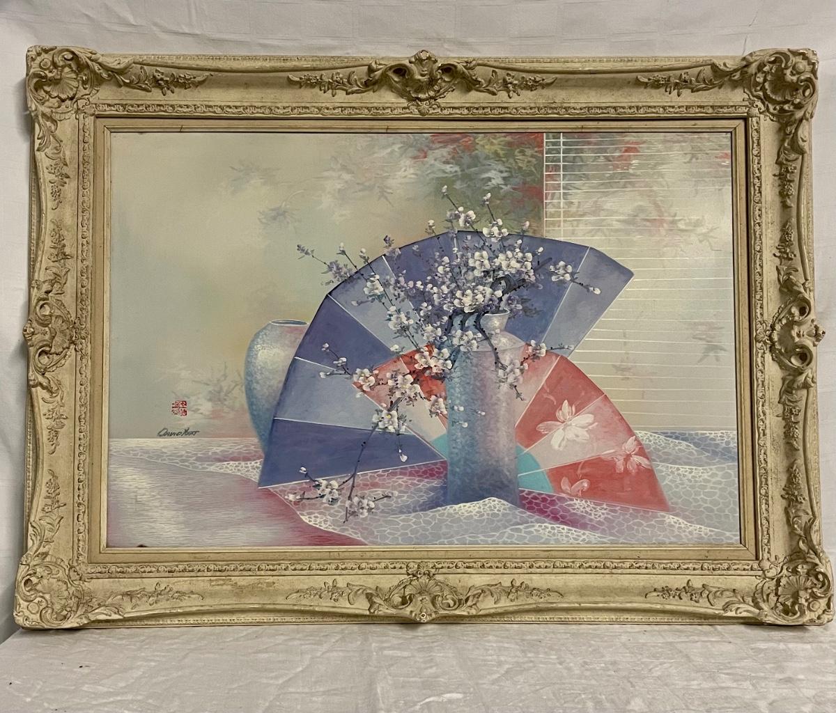 INV #70: Still life oil painting of oriental fans and vase signed David Hart, H 23" x W 35"