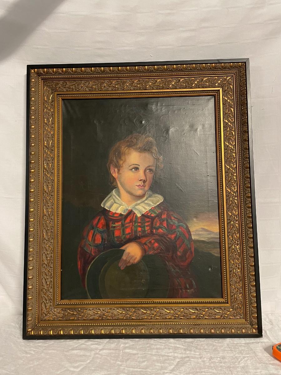 INV #72: Antique oil painting of young boy wearing red and green, handwritten on back reads "Uncle Harvey 1824, 1866 copied by Marie King" H 28" x W 21"