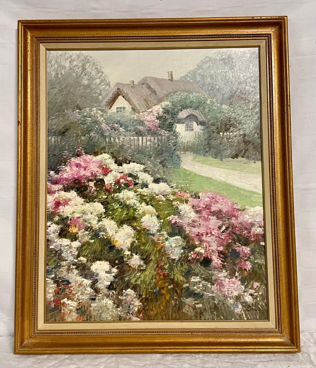INV #78: Painting of cottage surrounded by pink and white flowers, artist unknown. H 29" x W 23"