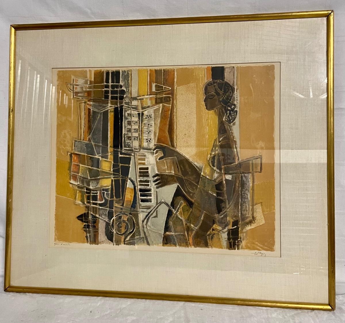 INV #89: Modern mixed media abstract woman playing piano, artist Gilbert Darling, H 16.5" x W 20"