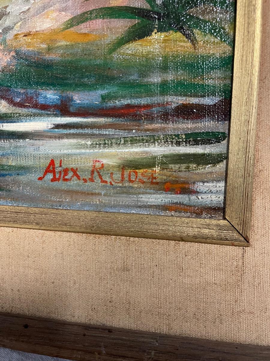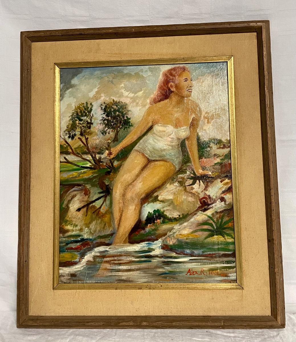 INV #94: Girl in White Swimsuit painting signed Alex R. Jose, H 19.5" x W 16"