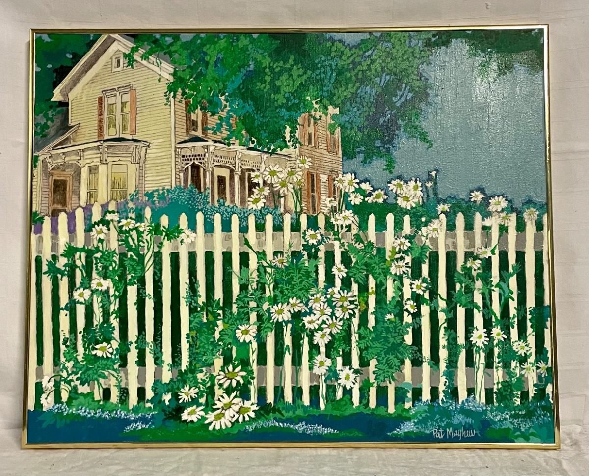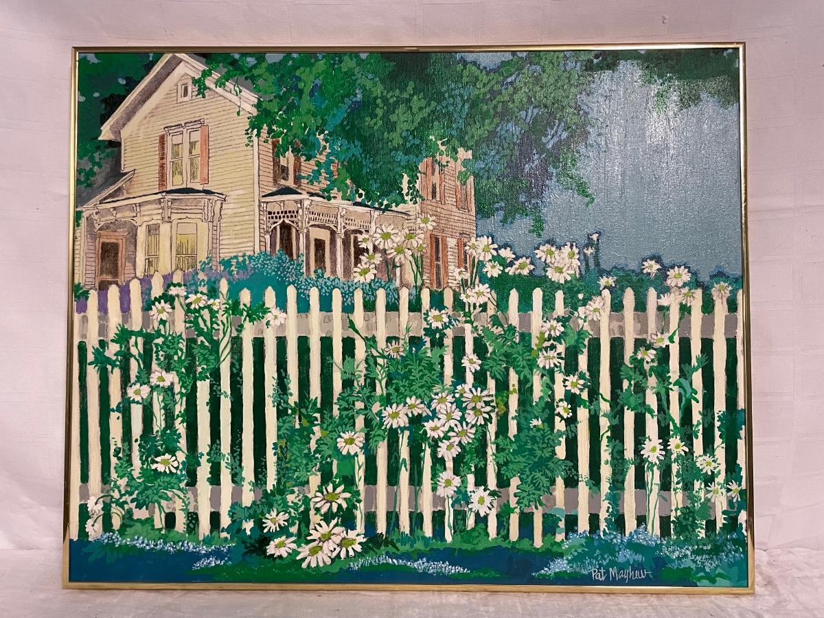 INV #99: Pat Mayhew signed painting, House with white picket fence, H 24" x W 30"