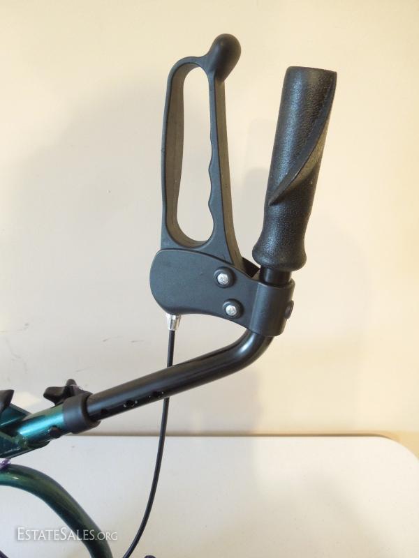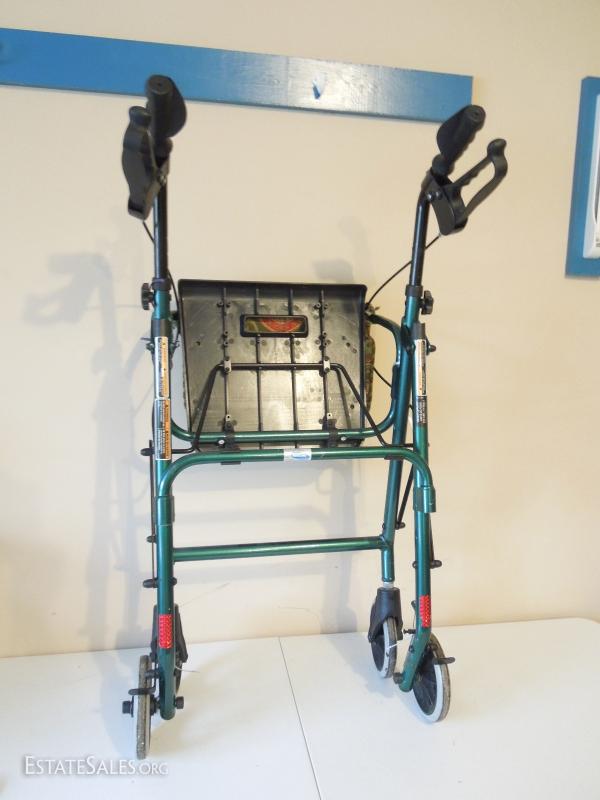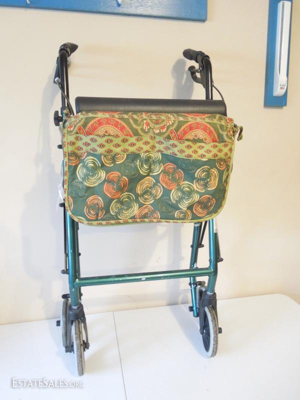 Nice used walker with attractive home made cotton cloth pockets. Wheels are soiled. Needs cleaning. Hand brakes work. Wheels do not lock. Folds for storage.